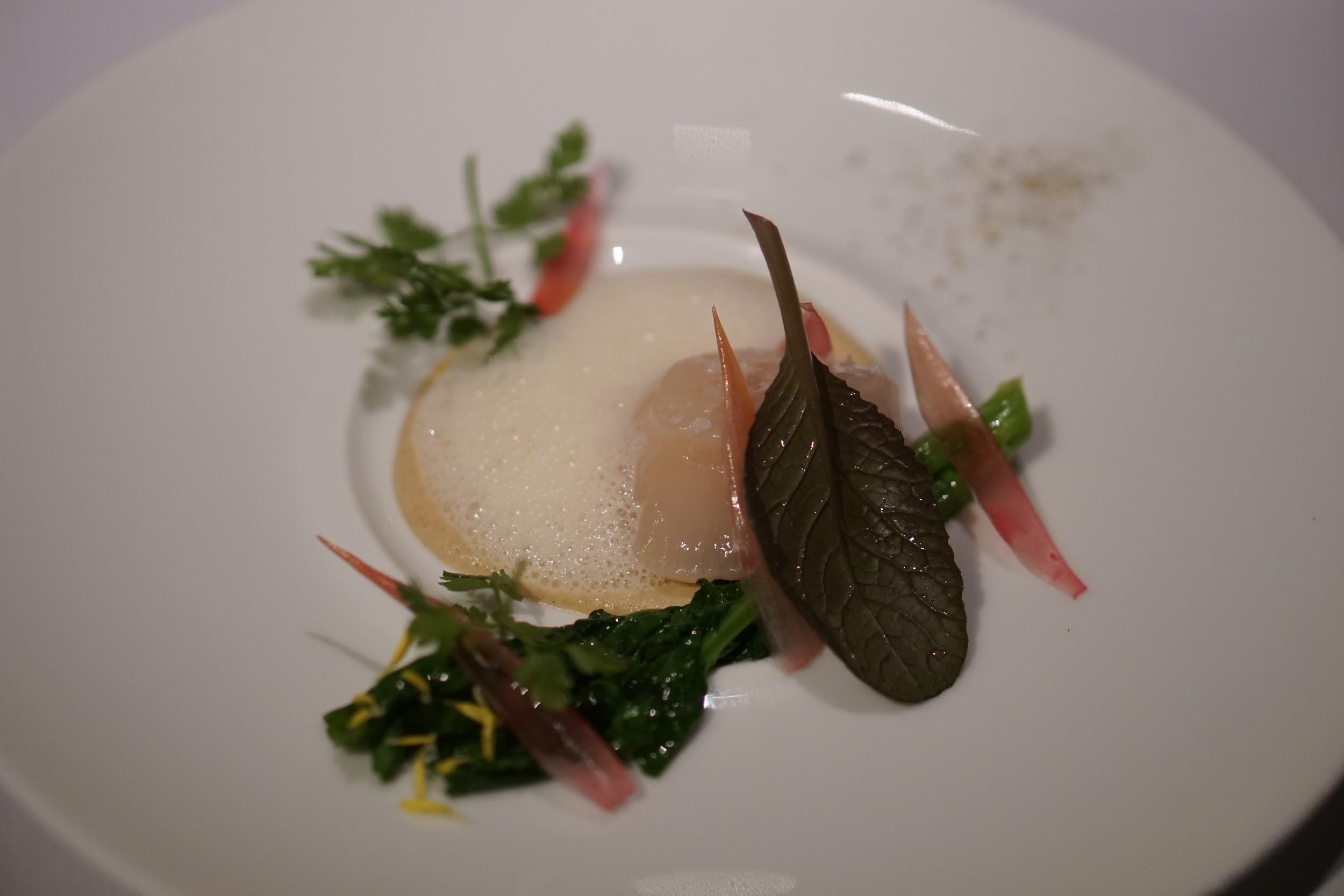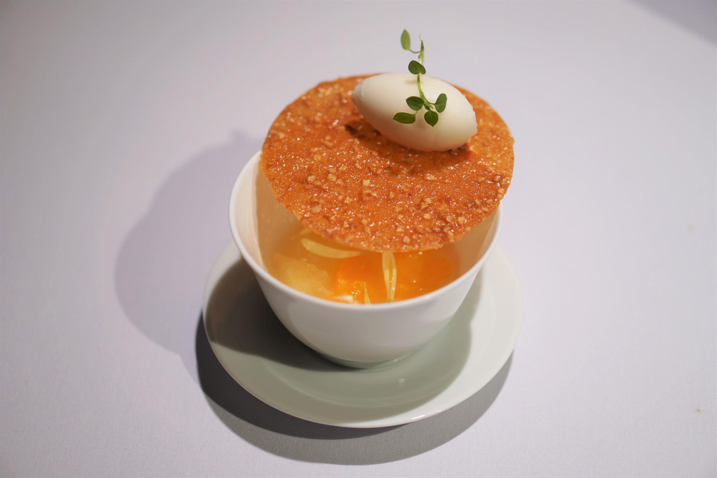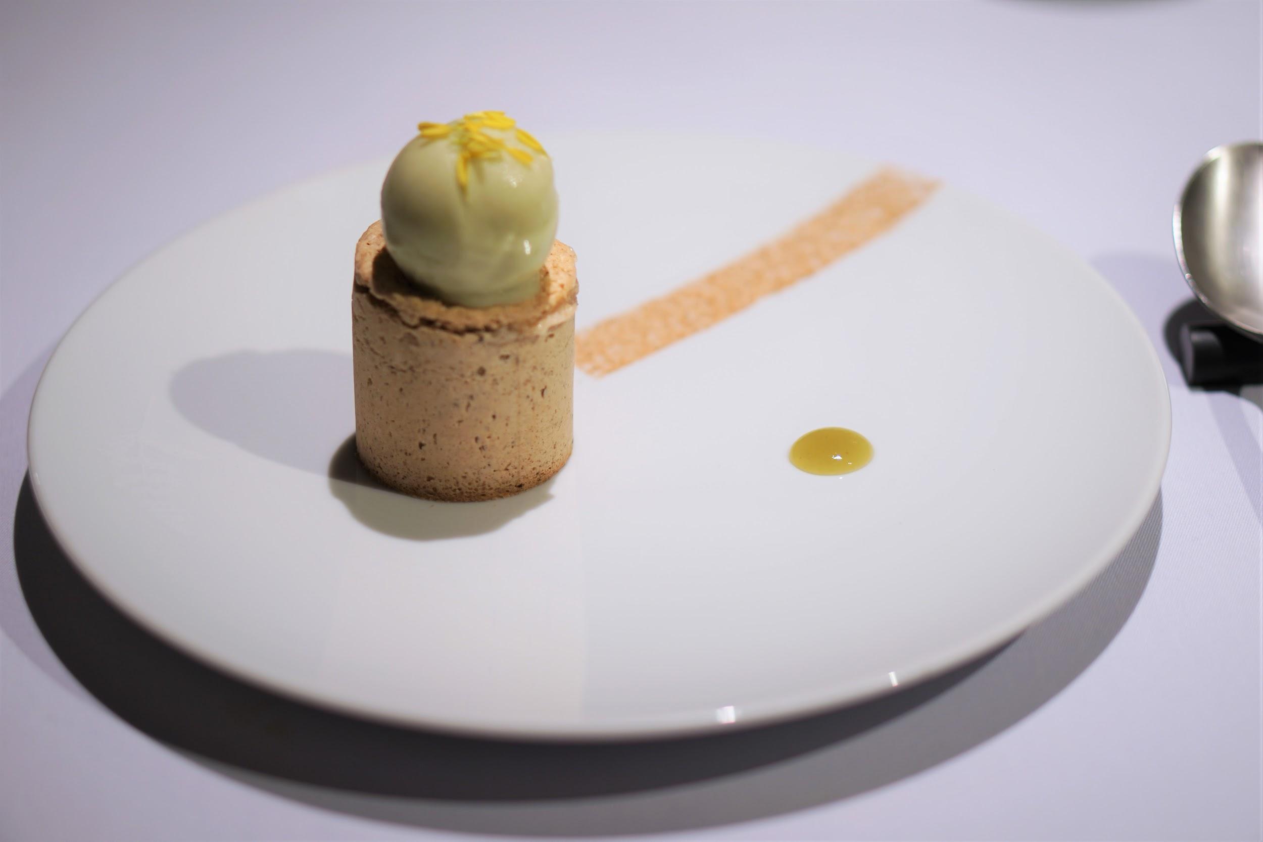图7的甜点值得大书特书,下面是杏仁脆熔岩蛋糕,蛋糕内是玄米茶味的熔岩,顶上是青葡萄味sorbet并撒上菊花花瓣,这一系列组合简直是和风味道与西式烘焙的完美代表,味道上更是借着和风元素超越了一切西式甜点的高度。绝对难忘!