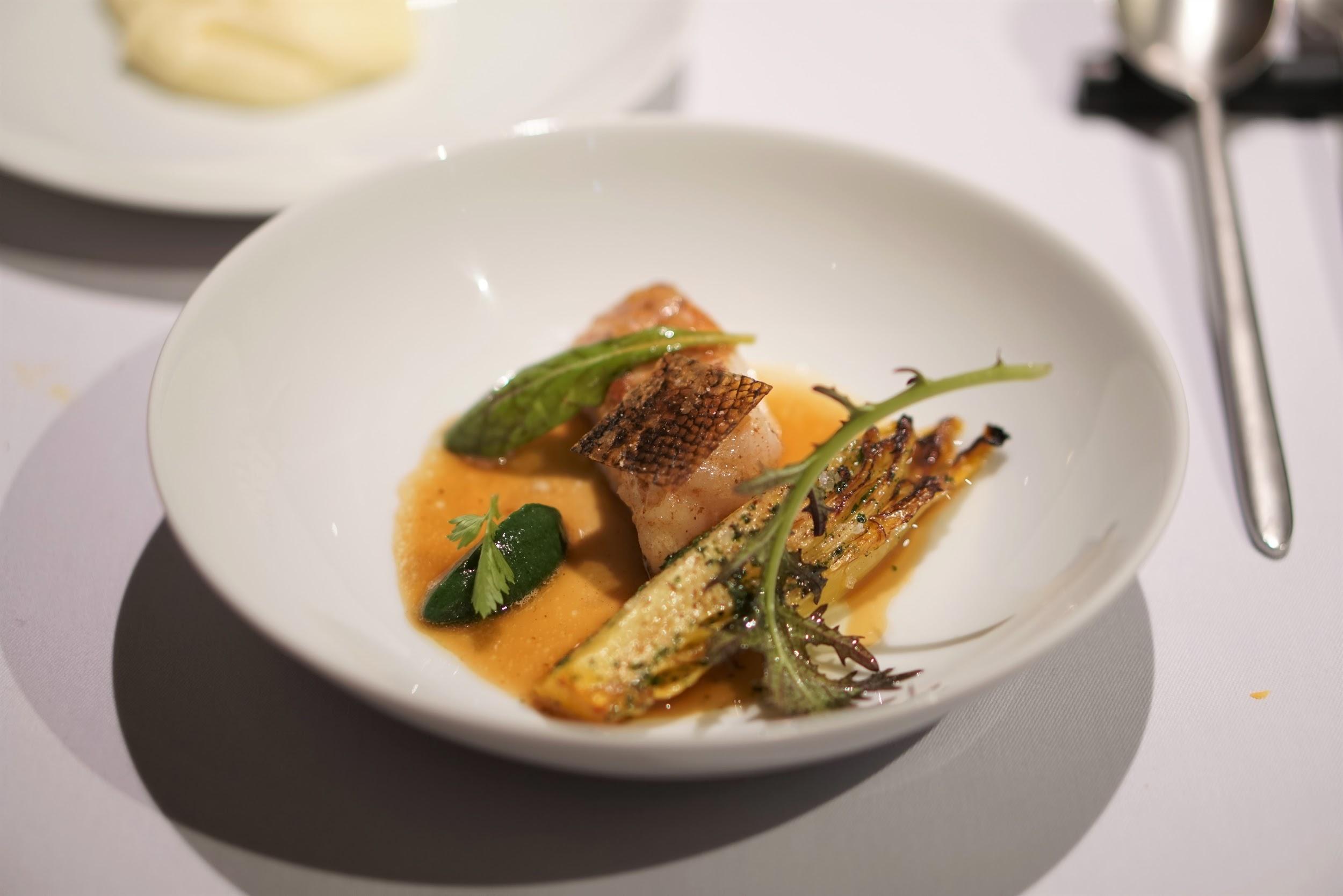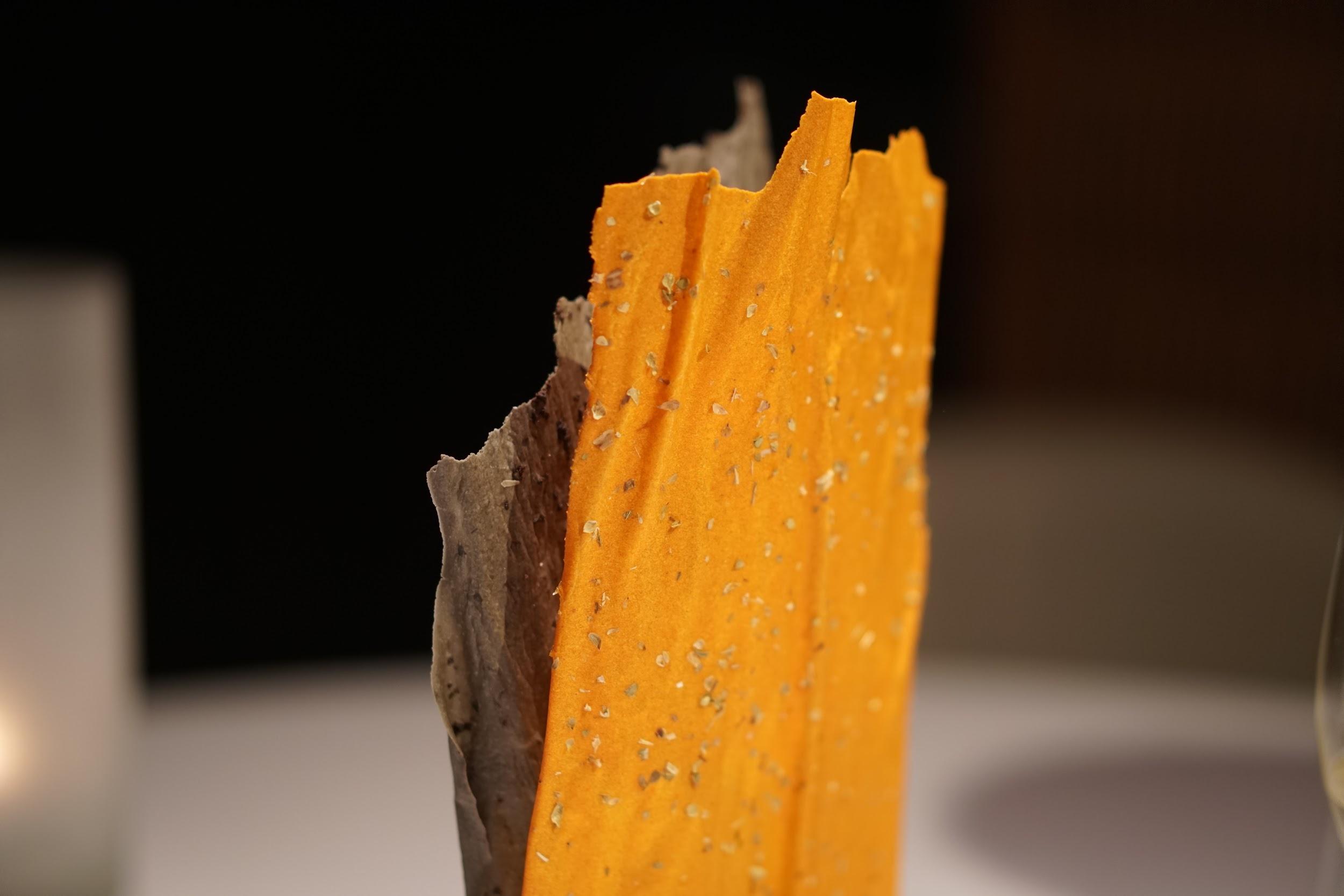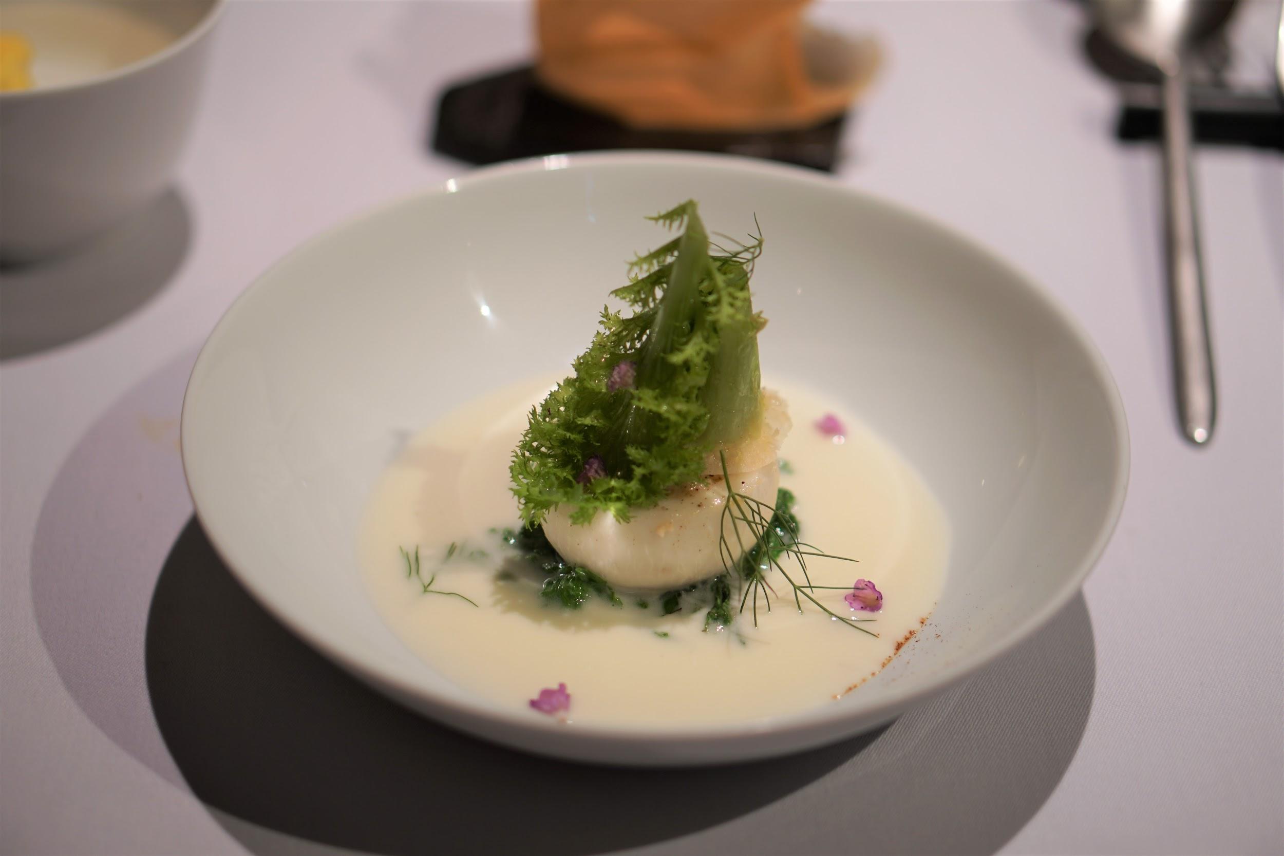 图7的甜点值得大书特书,下面是杏仁脆熔岩蛋糕,蛋糕内是玄米茶味的熔岩,顶上是青葡萄味sorbet并撒上菊花花瓣,这一系列组合简直是和风味道与西式烘焙的完美代表,味道上更是借着和风元素超越了一切西式甜点的高度。绝对难忘!