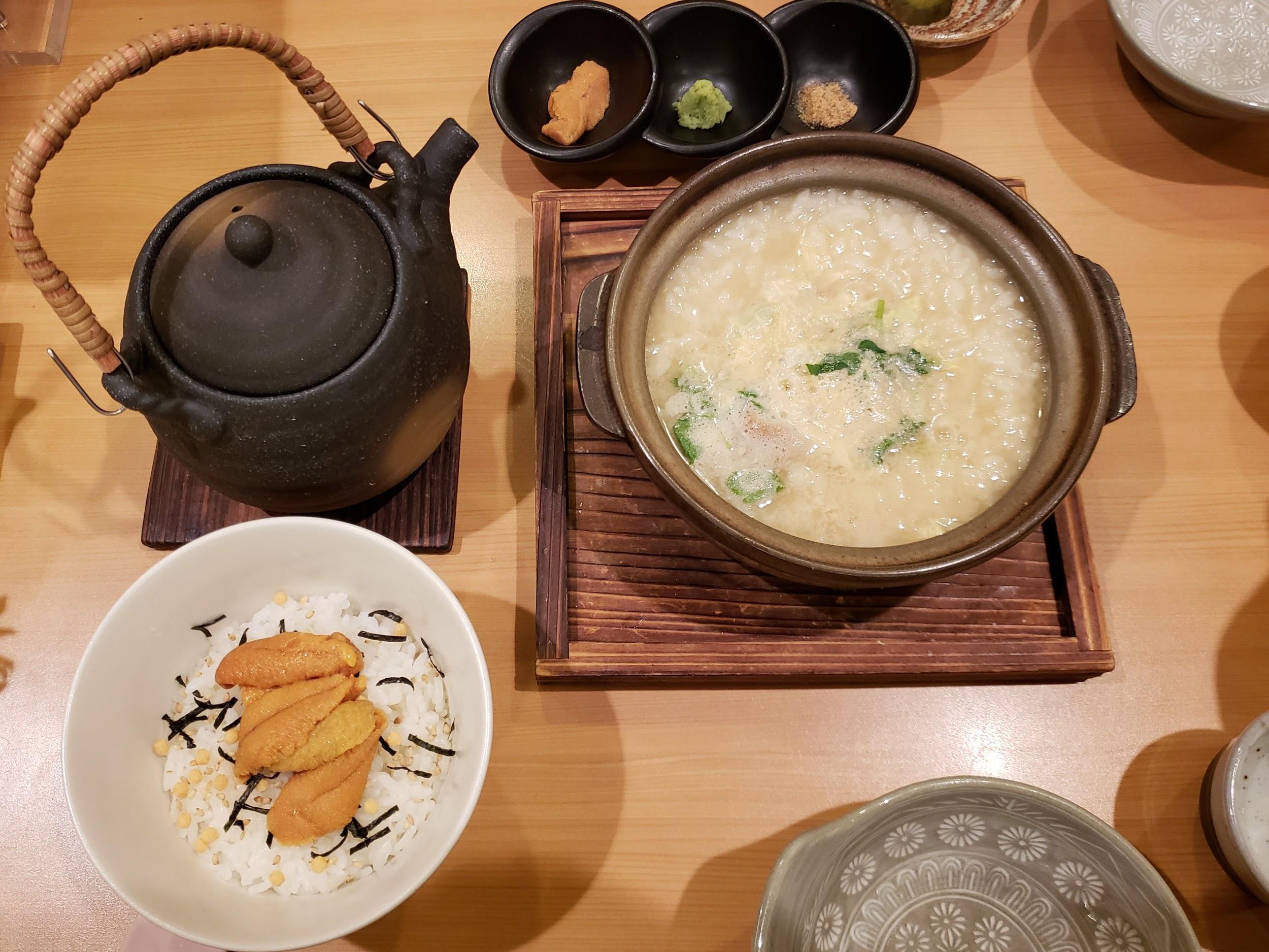 点了一份海胆杂炖粥,一份海胆茶泡饭,一份黄油烤北极贝,一份鳕鱼agedashi豆腐。果然是做菜半小时,吃菜15分钟,要不是温度太高,5分钟就能把这些吃完,实在是太鲜美了!海胆如同螃蟹鳕鱼和龙虾熬汤形成的浓稠的奶冻,既鲜美又甘甜还入口即化,而炖成的粥则让每一粒米吸收了鲜汤而膨胀软化,太好吃了。鳕鱼豆腐虽不是主打的海胆系列菜,也完全不掉链子,处在同一档次上,是我们吃过的最鲜美的豆腐食物之一(金泽的黑喉鱼agedashi豆腐是其劲敌)!黄油烤北极贝,作为一种任何一家饭店都可以做的食物,此处把北极贝的嫩表现得淋漓极致,凸显了厨艺和火候的掌控!此店不愧为函馆在tabelog上评分最高的一家店,3.7,与美国人不同,日本人的评分品味,绝对值得信赖。