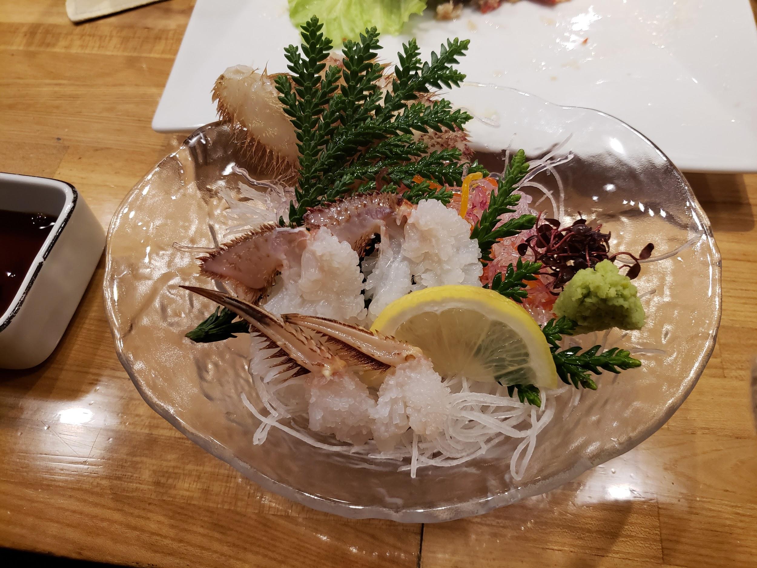 所以这一次冬天螃蟹季重回北海道,就一直念叨着必定不能错过毛蟹。于是在港口城市函馆我们去了当地口碑很好的一家鱼市餐馆,坐下来就满菜单翻毛蟹,服务员问我们要怎样的做法,煮?做刺身?本来打算煮了就好,他这么一说,顿时决定留两个腿做刺身吃。十几分钟后,刺身先端上来了,去壳处理好了,蘸上他们专门配的螃蟹酱汁就可以吃。只一口,我顿时后悔没有多留几只腿,这绝对是我吃过的最好吃的生肉了,肉质Q弹甜美晶莹剔透,完全脱离了“肉”这个概念。唯一的遗憾是肉太新鲜了,长在腿壳上,没法一口全部咬下来,否则的话大块大块咬下去可以直接极乐升天。下次一定点两只蟹,一只煮,一只纯刺身。