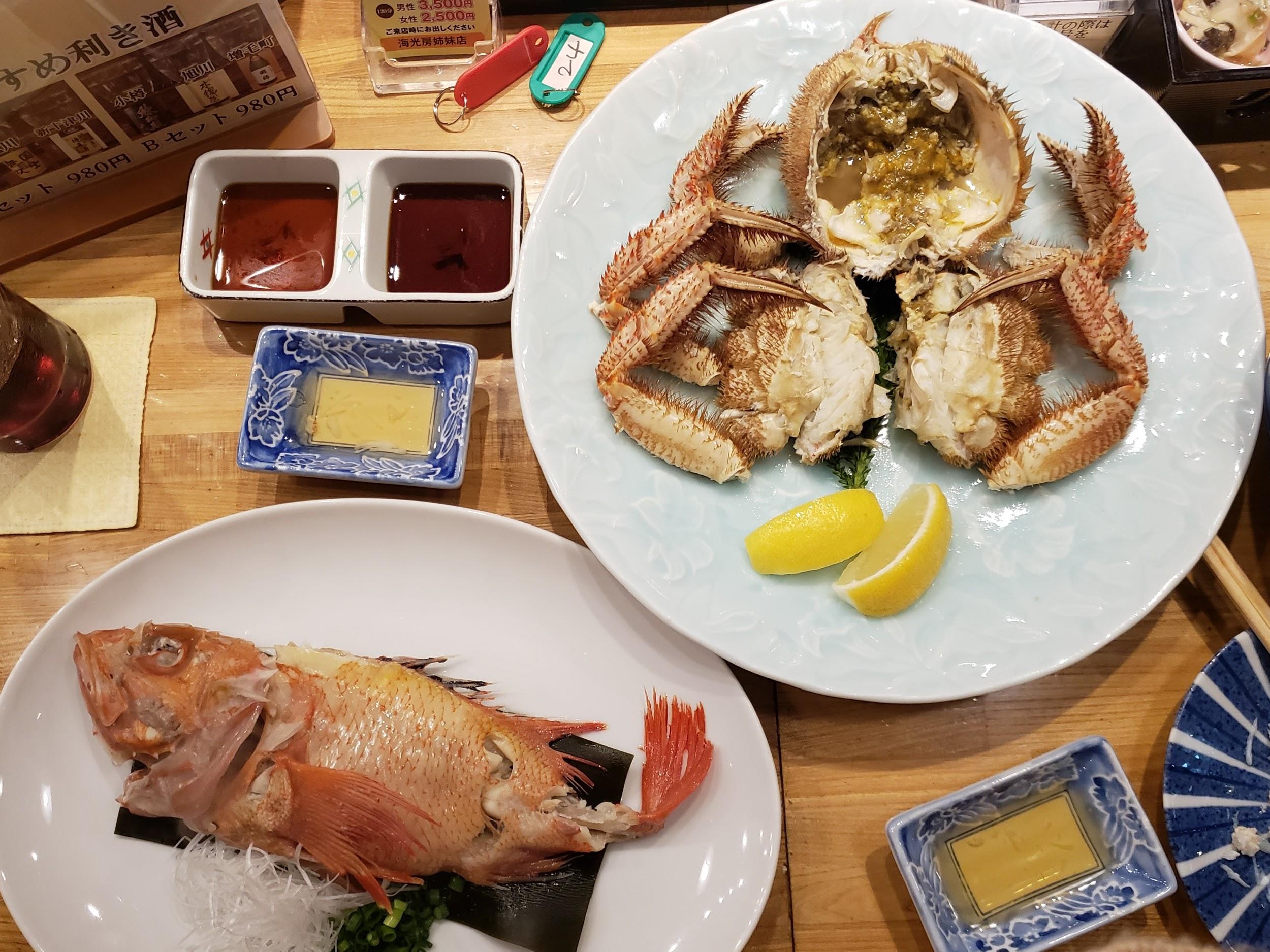 除了蟹之外,我们也点了北海道特产的kinki鱼,呈红色, 头很大,也是简单煮了,要知道在北海道美食界这种藏龙卧虎的各种鱼虾类中,kinki都被认为是一种luxury的鱼,可见它的肉质足以和最知名的黑鳕鱼媲美,事实也确实如此,在它傻傻的外表之下,隐藏着堪与黑鳕鱼和加拉帕戈斯的scorpion fish比肩的三大鲜美鱼类!在与毛蟹同桌的情况下,竟然几乎没有输(我认为略输,但小猫认为同等鲜美)。