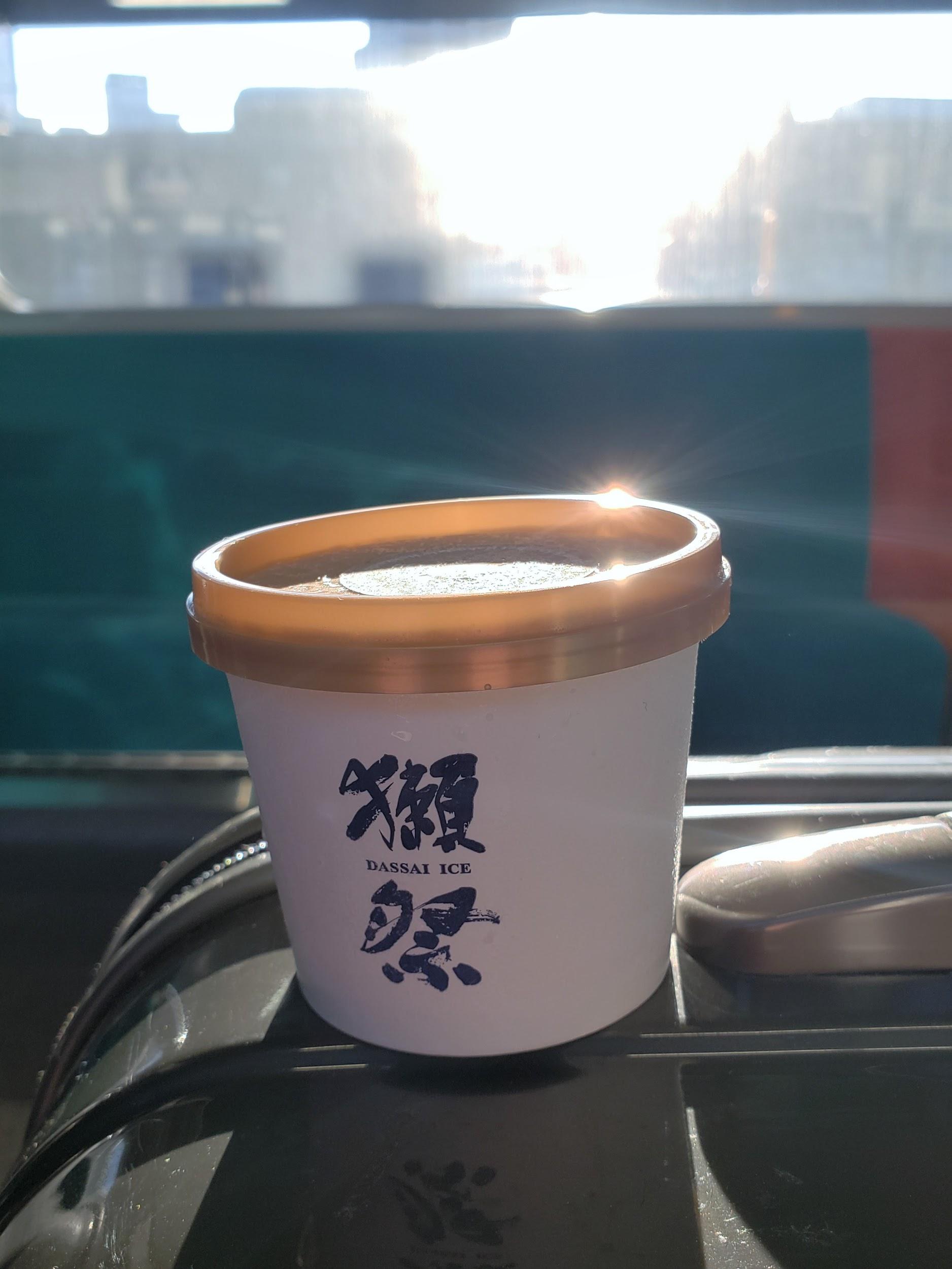 在离开函馆的早晨,我们到火车站等车,便利店里卖着一些本地甜点,随便过去看看时竟然在冰箱里看到了——獭祭的冰淇淋!这是即便在东京那种汇集所有好吃的地方都没有见过的(后来查到东京的獭祭银座专卖店里有)!于是瞬间觉得这一天都被点亮了。不顾刚吃过早饭,在火车上就吃起冰淇淋来,这个用獭祭大吟酿的酒粕做成的冰淇淋既有清酒的清香,又有山田锦之米的微甜,加上著名的函馆牛奶的浓郁和顺滑的口感,已经超越了西雅图的bluebird stout味冰淇淋成为了我最爱的冰淇淋(但对酒没有执念的小猫还是最爱西雅图的kurt farm无花果口味冰淇淋)。