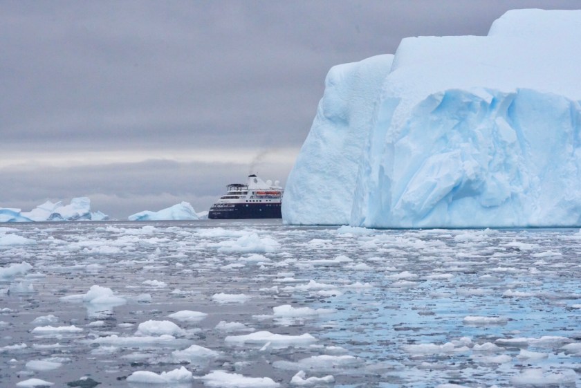 南半球夏至日。早晨在露台上看到了此行第一座冰山。巨大、优美、神秘的白色,刺透朦胧的海雾。