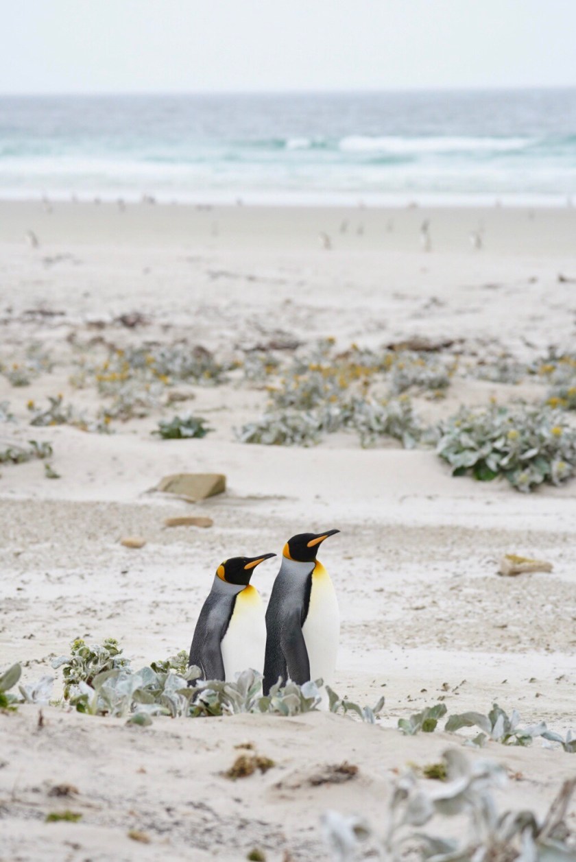 下午抵达另一座私人岛屿。三座山峰,一户人家,数千只羊,上万只企鹅。两山之间的The Neck, 白沙滩上丛丛银灰色大叶子,浮游着点点金花。石头抹着金色苔藓。一对高大的王企鹅伴侣,一帧一帧走向碧透的大海。头顶、喙和颈部各有一抹柔亮的金。梦幻得像一枚随时会融化的柠檬奶油点心。巴布亚企鹅冒冒失失从它们跟前跑过。戴戏剧面具的麦哲伦企鹅排队游行。山坡上的洞穴中,它们探出半个身子,放牧羊群。更高的地方,悬崖上,是跳岩企鹅的家。信天翁张开三米宽的羽翼飞过碧海白沙,地上每一个黑点都是一只企鹅。