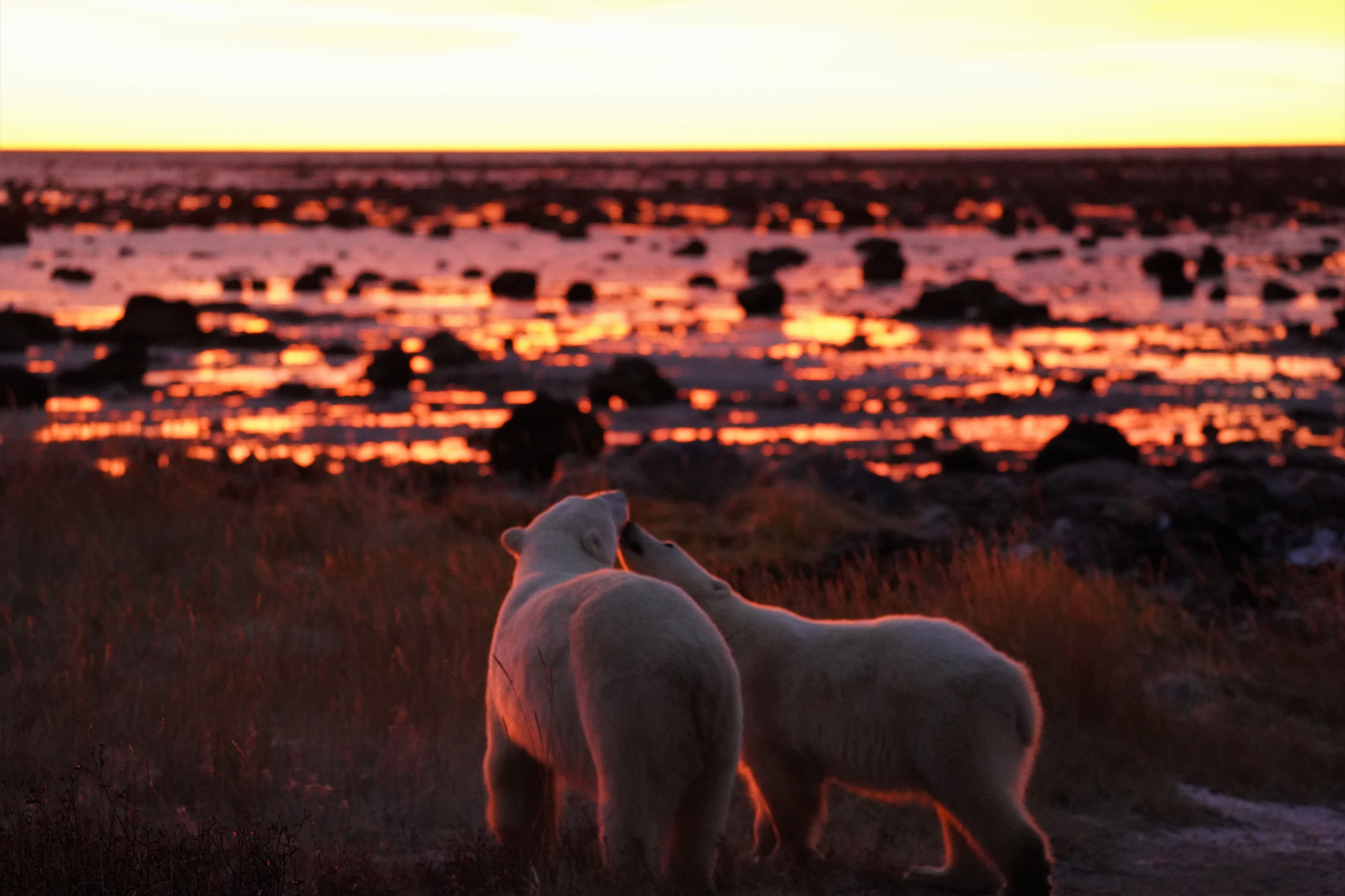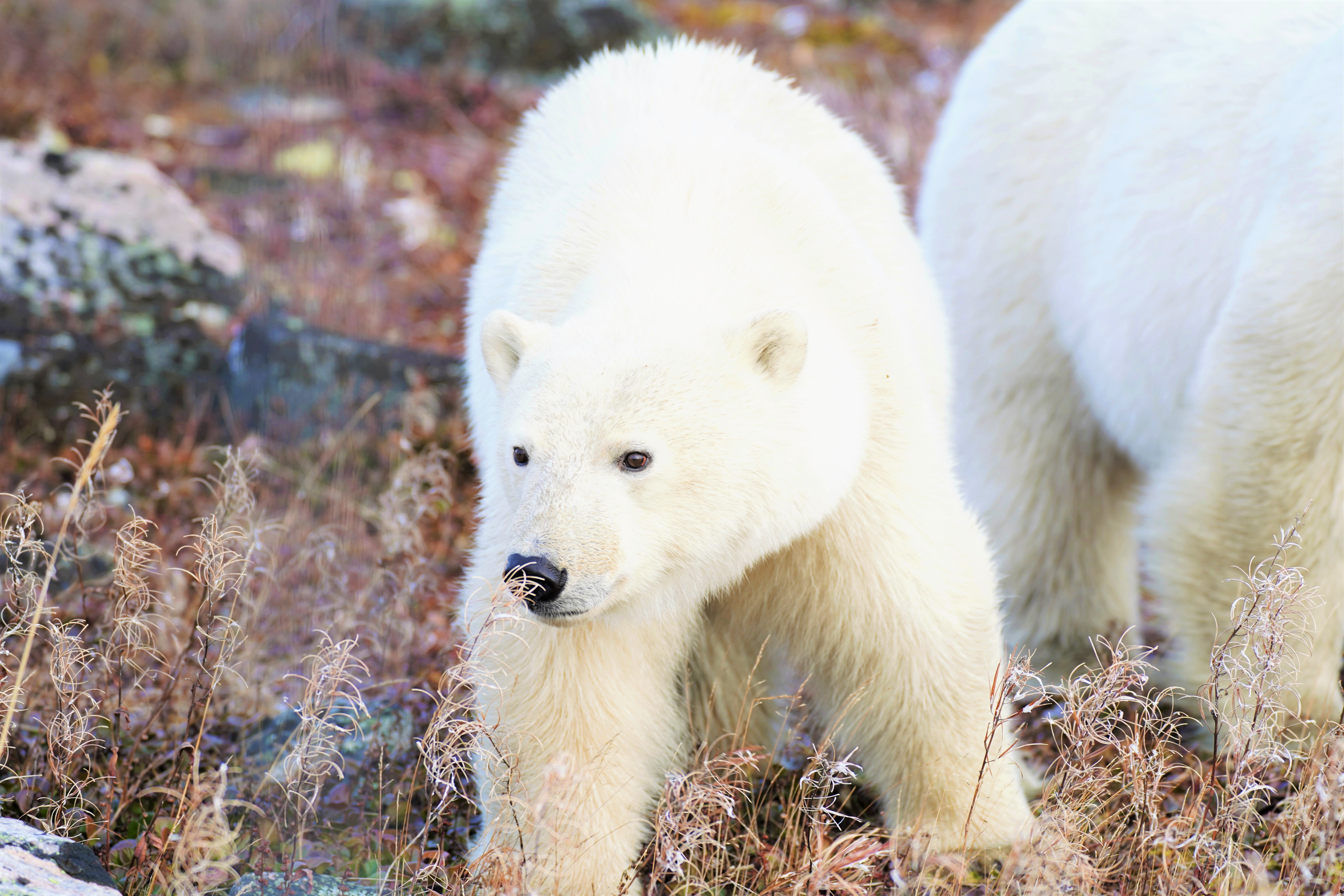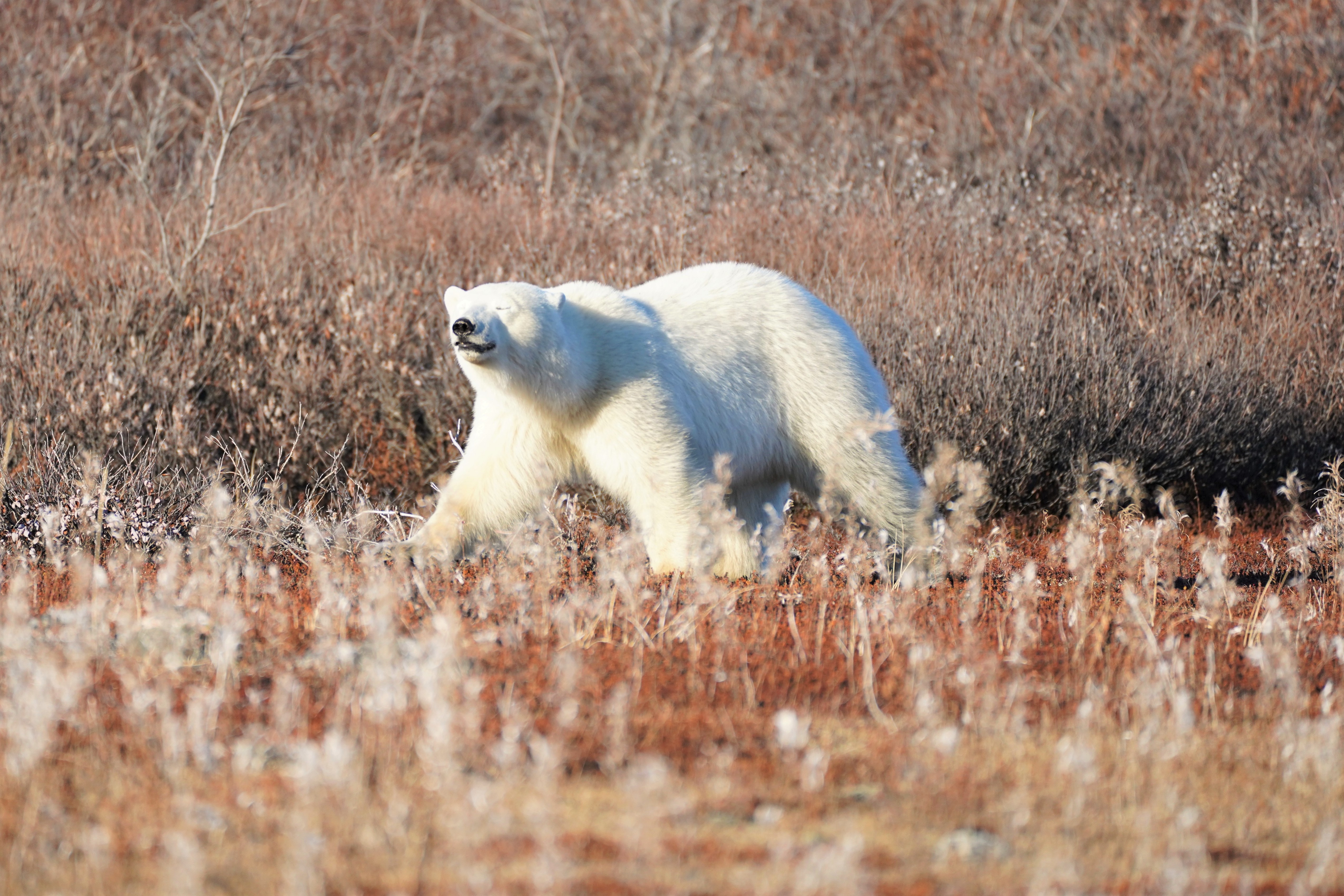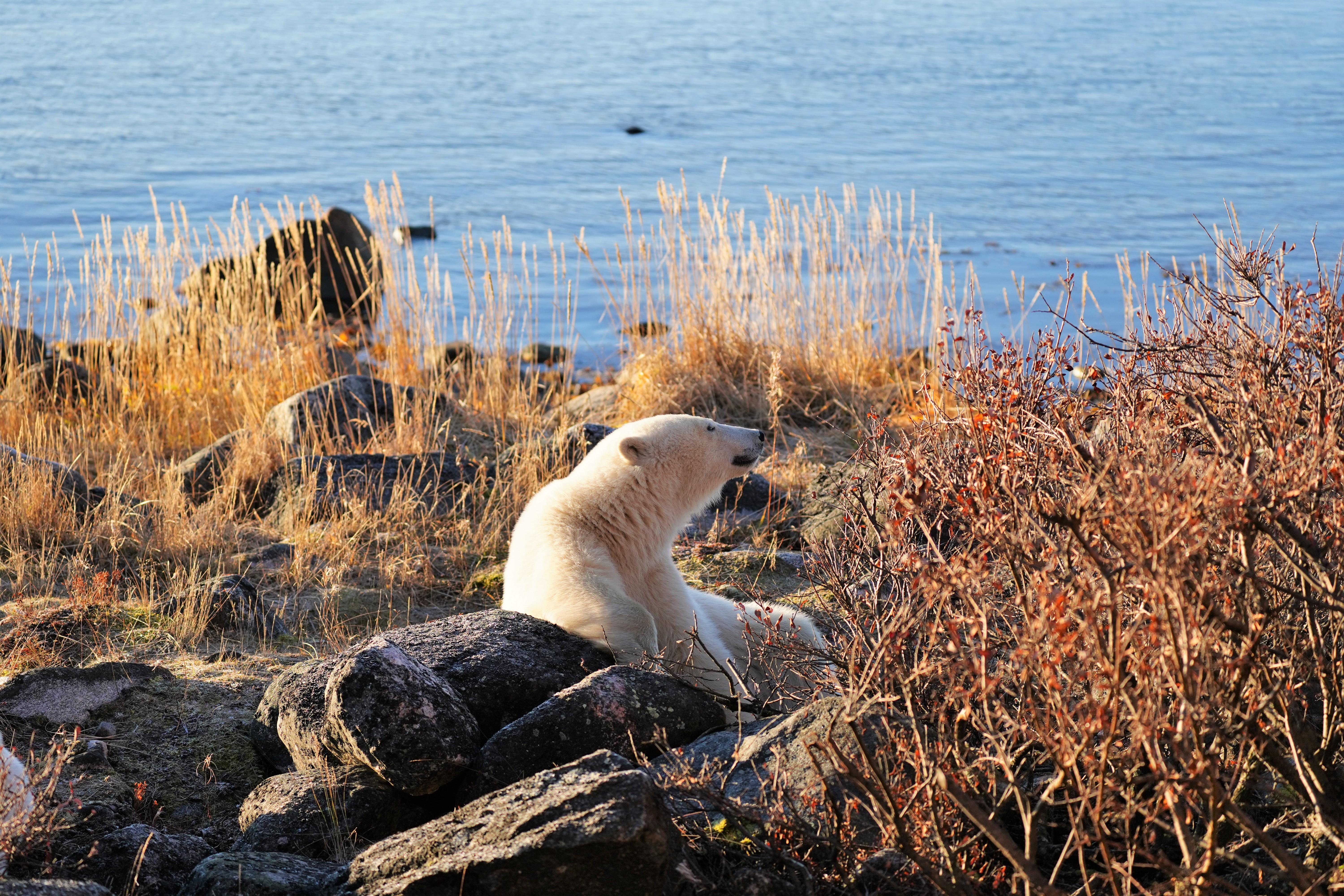 在无法捕食海豹的季节,莓果成了熊的主食。在无人居住的苔原上,一片野莓林便是一场盛宴。(旅馆女主人后来坦白她也会来摘野莓,而且会使用高级装备吸尘器,而我们吃着美味的野莓蛋糕无心指责她~)晴朗的午后,一只熊妈妈领着两只小熊挑挑拣拣——秋末树上的果实所剩无几,叶子早已落光,只剩红色枝桠。碧空如洗,阳光倾泻着深秋的暖意,给红枝与白熊裹上一层绒绒的银光。两只小家伙一边觅食一边打闹,圆滚滚的小脑袋一会儿隐没在红色灌木丛中一会儿又探了出来,不时亲昵地相互轻咬,与小狗玩耍如出一辙。熊妈妈抬起两只前爪,直立近三米高的身子站起来,如鲸鱼出海,气势磅礴,又万分可爱。
