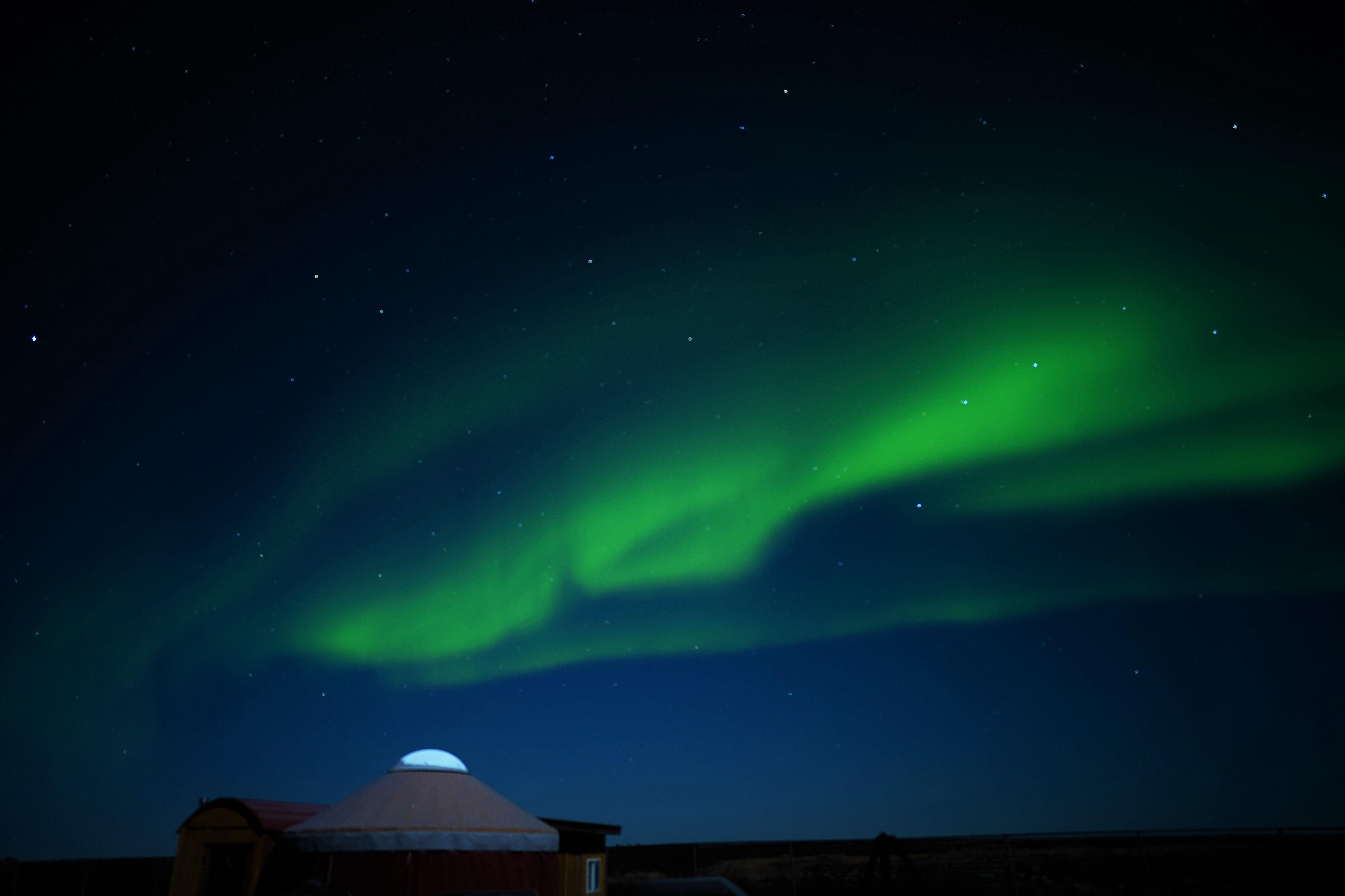 在极地,梦与现实总是混在一起;分不清是舍不得闭上眼,还是舍不得睁开眼,心中始终鼓声敲荡。夜半听到敲门声,接着是向导的声音,aurora lights! 赶紧套上一身棉服跑到院子里,几条绿色光带映上眼眸,如薄纱飘荡,飘在帐篷亮起的屋顶、履带车高高的车窗和我们仰起的面庞上。满月高照,稀释了些许色彩,但不失轻盈与梦幻。夜空一半明月皎皎,一半绿光舞动,海滩与天空相互倒映,一颗星星对应一颗碎石,一道金光映照一条绿波。水上的,天上的,人间的,消失了界限。光海间群星隐没,北斗七星依然闪烁。Arctic一词源于希腊语的“熊”,正是意指这片地区夜晚终年可见的大熊与小熊星座。数十万年前,古代棕熊是不是听到天上先祖的召唤而迁徙至此呢?此时此刻,苔原上的北极熊们也在抬头张望吗?