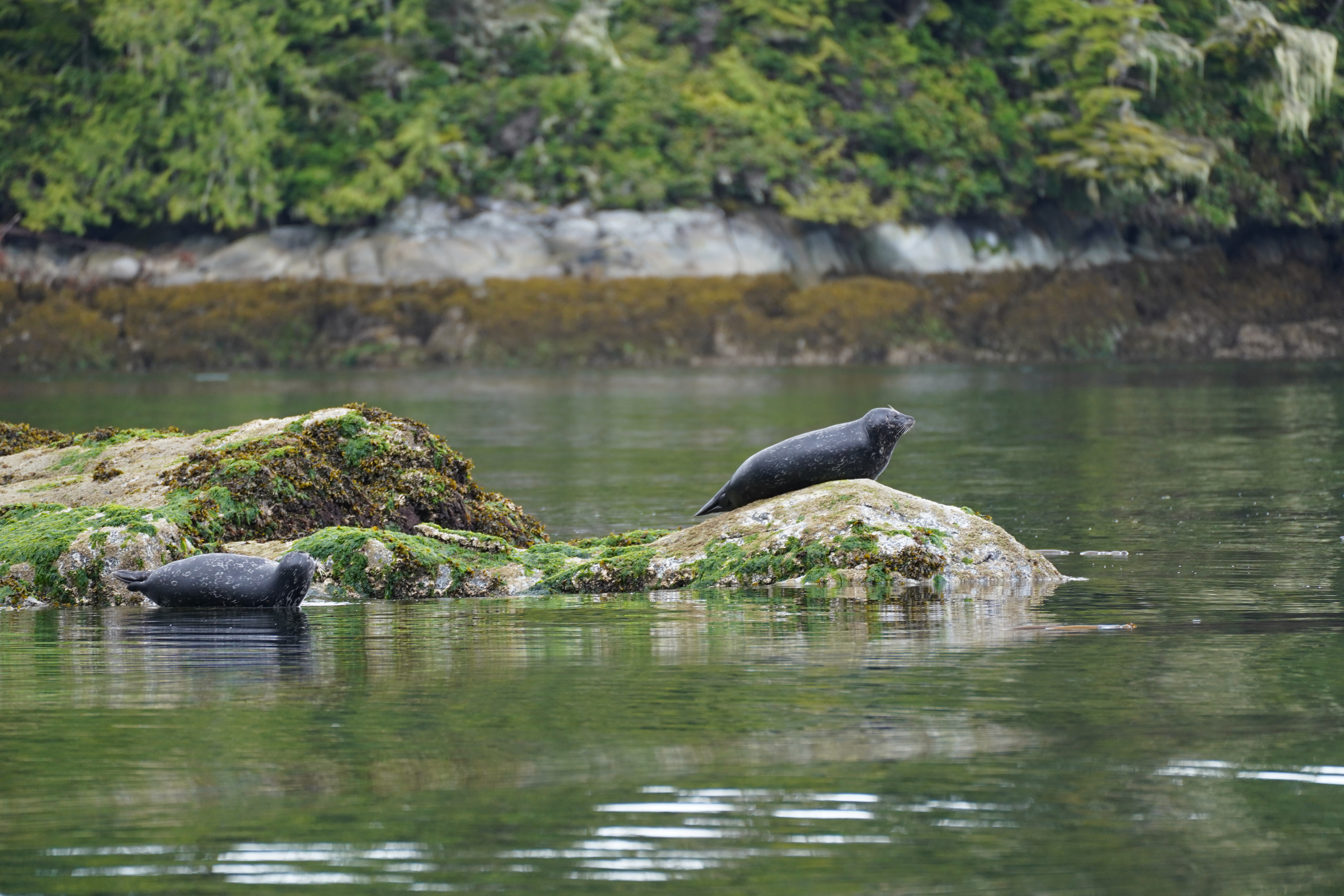 雨的间歇乘船出海。宁静的海湾边,浓绿的树影一丝不苟地倒映在水的镜子之上,叫人想起京都琉璃光院的漆桌。小船推开平静无痕的水面,穿过迷宫般的水道,驶向远方的群岛。绿草丛生的石滩上,两只棕红色小鹿相互追逐嬉戏,沿水漫步。高高的云杉枝头,白头鹰站在宽敞的巢穴中张望。水中央突兀的一块大岩石上,两只圆滚滚的海豹一前一后躺着发呆;还有一只正从水中探头好奇地看向我们,一旦我们注意到它,又害羞地没入水中。黑色小鸟一头扎进水中,露出红色的爪子。忽然绿影绰绰的水中冒出银色脊背,一只海豚欢快地游来游去,拨动一根根深浅相间的水弦,不知演奏着什么样的音乐。我们只听得到它长长的呼吸,一声一声萦绕在耳边。青山后雪峰隐现,宽阔的水道一侧是British Columbia的雨林,一侧是温哥华岛的群峰。忽而蔚蓝的海面波光点点,一望无际,仿佛要通往大洋。但船转而钻进群岛之间的缝隙,阳光也再次钻进云层。我们裹紧外套,坐在船尾的甲板上野餐,边赏景边喝着美味的热汤。近在咫尺的悬崖高耸如云,河流般宽阔的瀑布倾泻而下,岩石被水流日日雕琢、层层浸染,雕塑成彩色的群像。水是力量,是恒久,是时间的具象。