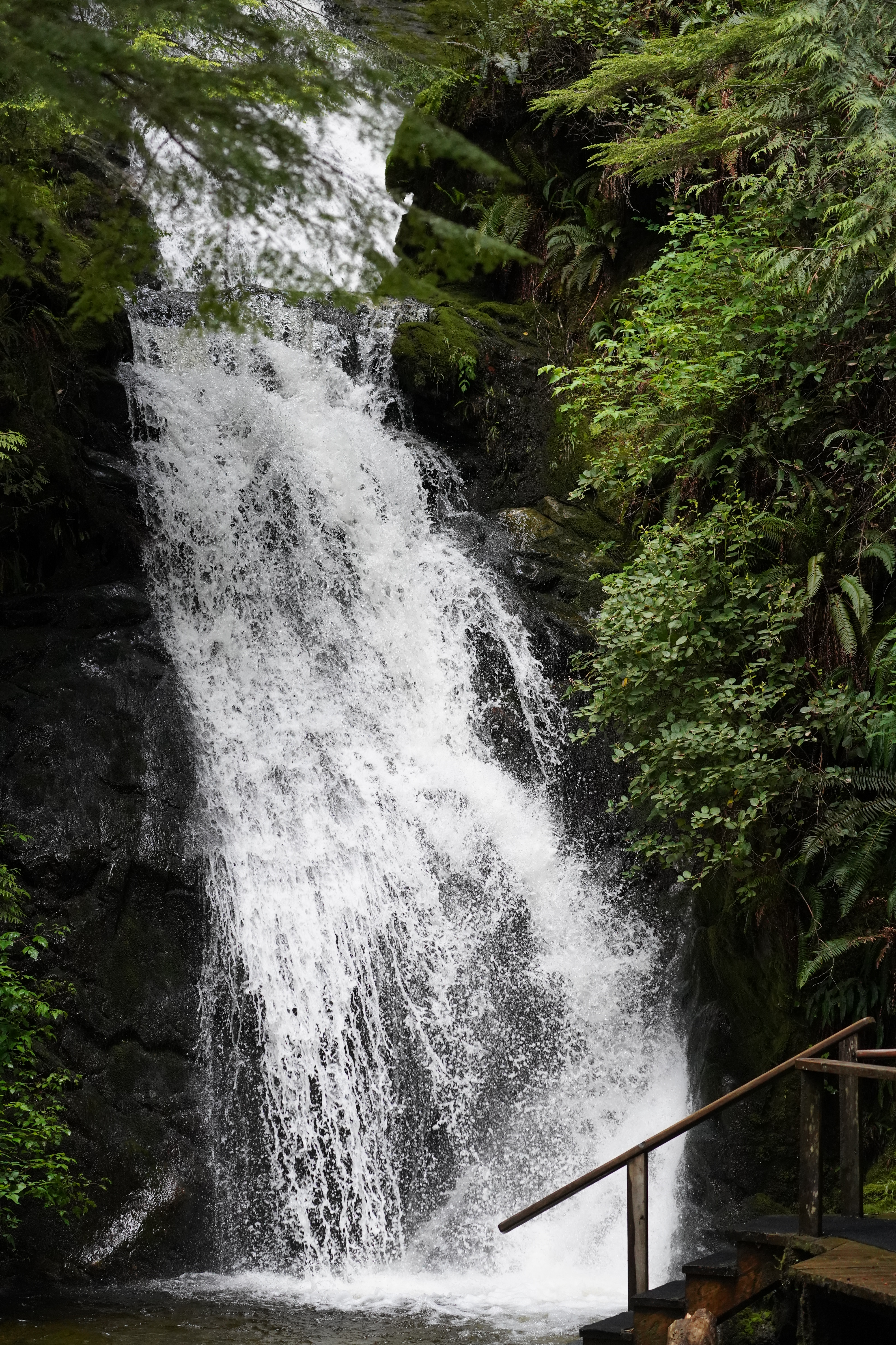 边界有时是一道难以逾越的水帘。 回到陆地,泡进山崖下的杉木汤池。高耸的杉林遮蔽了天空,奔腾直下的瀑布伸手可触,扬起迷蒙的水雾,看不见抓不住,唯有清凉扑面。水帘两侧绿植丛生,野草、灌木甚至矮树都在岩缝中奋力生长,湿漉漉、绿油油。有水的地方只要有意志,就有生命。溪流中岩石生满青苔,绿苔之上亦有枝条纤细又有力地舒展,清澈的溪水从两侧汩汩流淌,仿若一盆活的日式盆景。瀑布底下一截粗壮的老树干不知何年何月落入水中,被激烈的水流冲得团团打转。泡到浑身发烫,冲进溪流,一股寒意立刻将脚跟冻住,锐利地刺进小腿骨。趁身上的热气与勇气尚未消退,深一脚浅一脚地淌着冰凉的水,踩着滑溜溜的石头,继续朝瀑布去。然而越靠近水流越强,脚下溪流变潭水,只见层层白浪不见底,身体也越来越凉,最终止步于两米开外,没能逾越水帘,一探背后的世界。不久后大雨如注,两个世界连成一片。