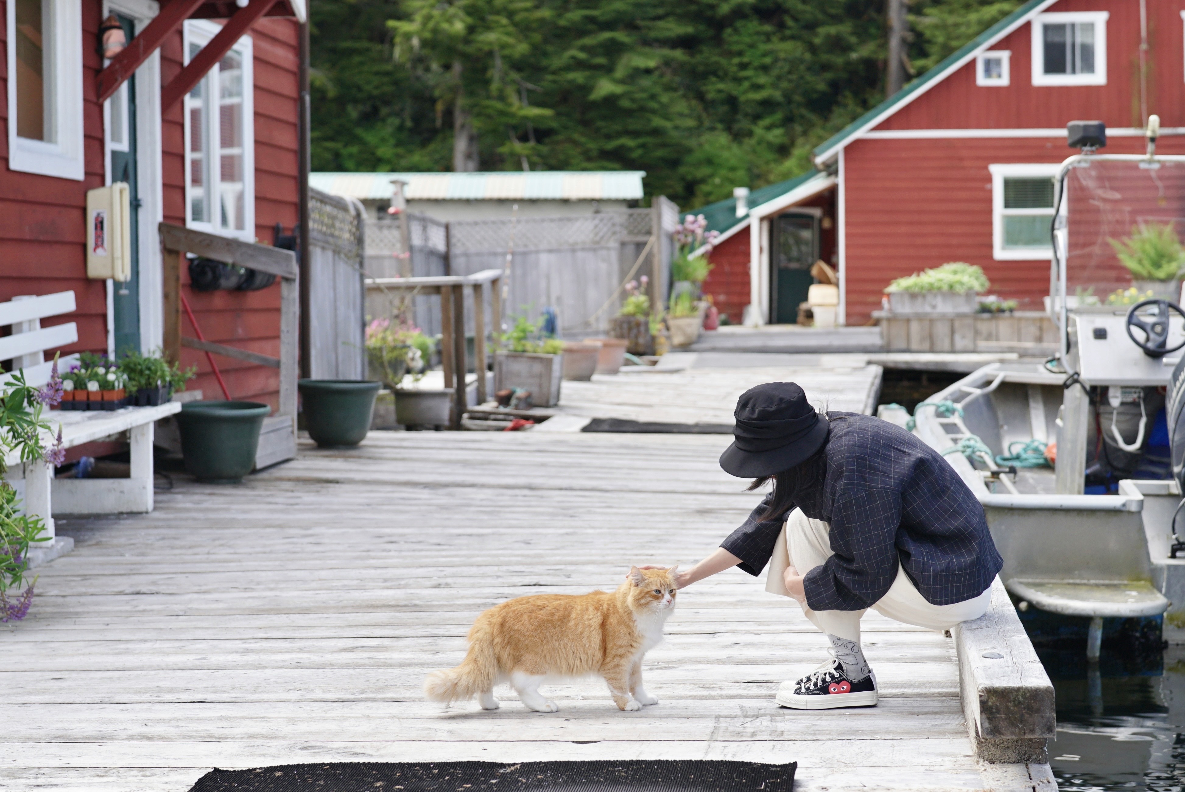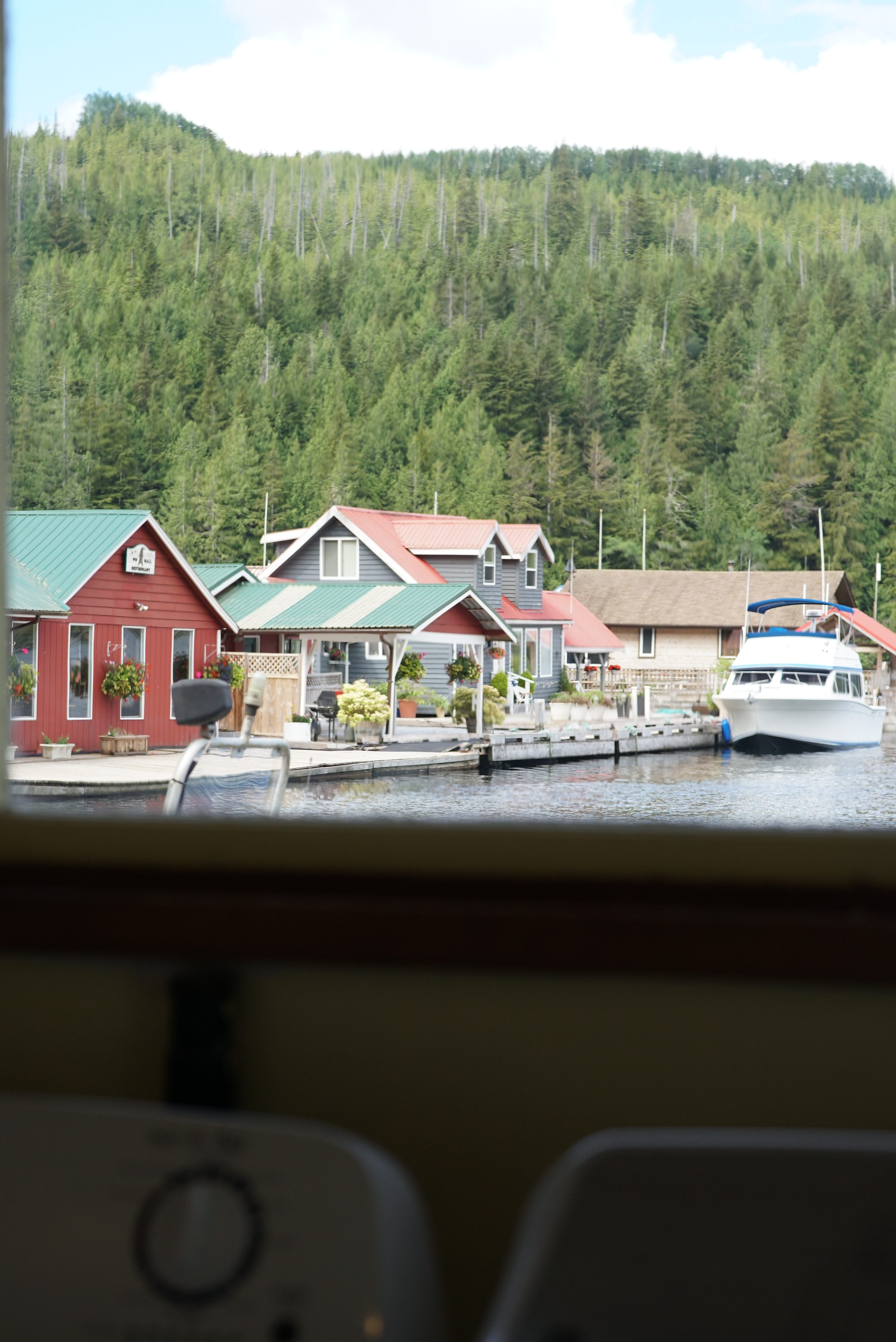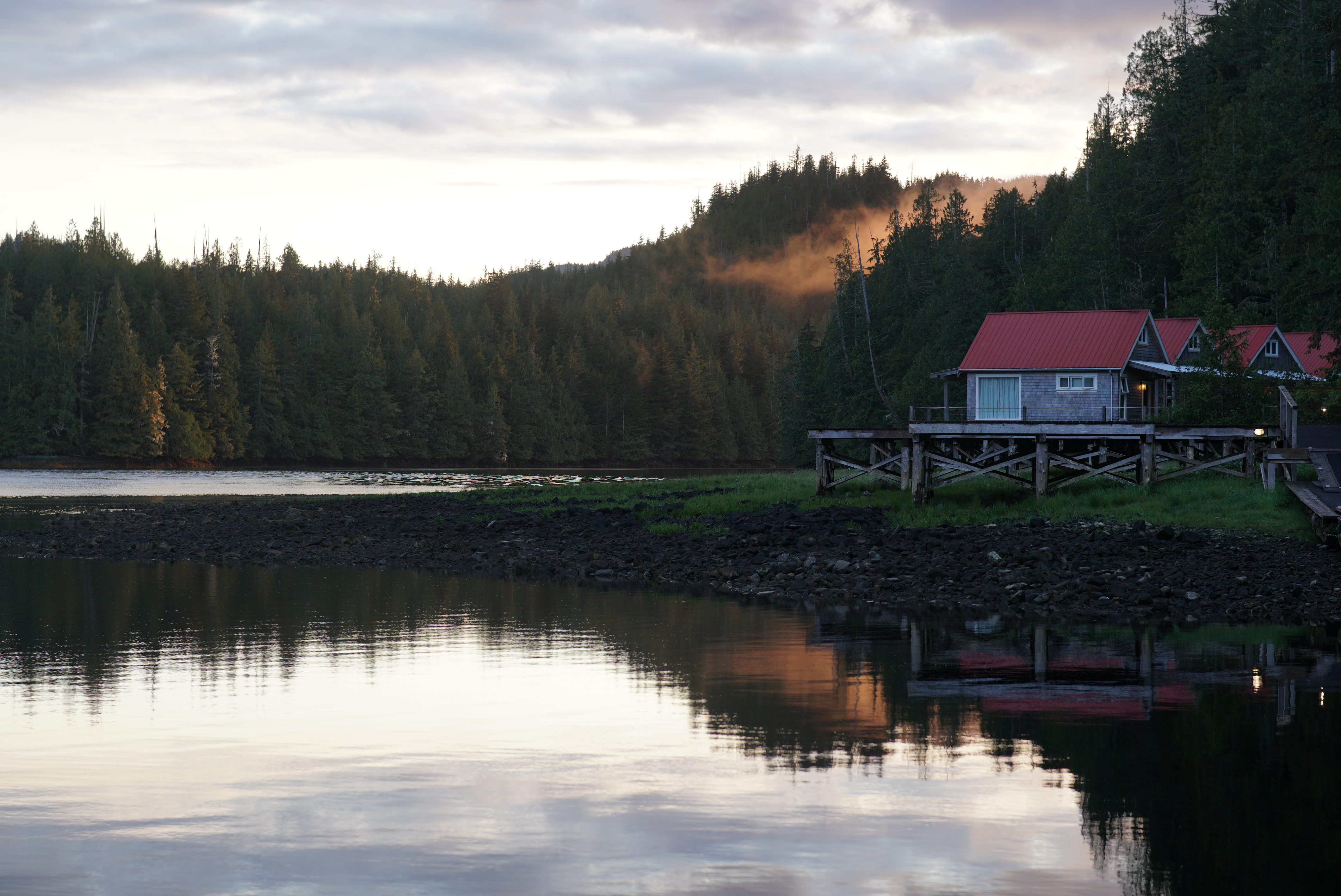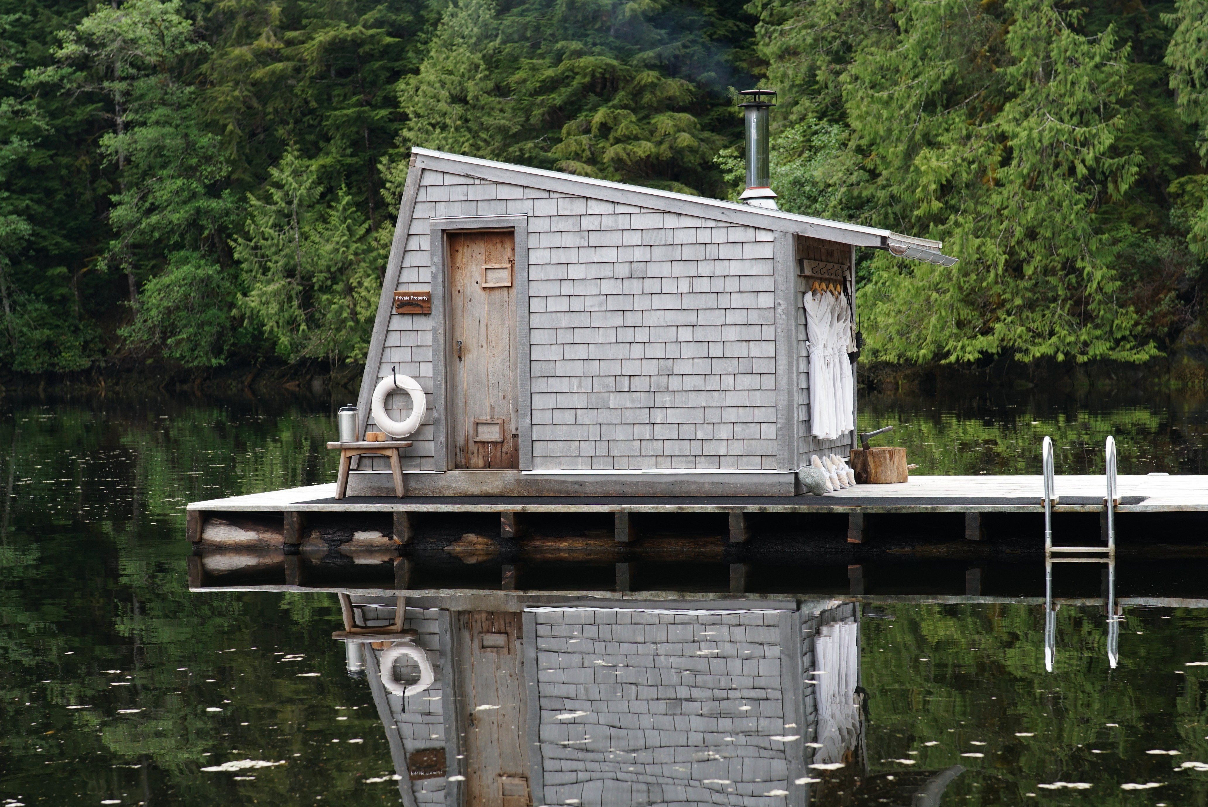 旅馆主人走水路抵达,而我们借助翅膀。两栖式飞机Grumman Goose长得就像西雅图城中常见的鸭子游览船插上了两翼,胖肚子下的轮子与其它小飞机无异,只是两翼下各装有一个平衡器。它建造于上世纪三十年代,最初为曼哈顿的大亨设计,二战时被军队相中投入战役,战后慢慢退出舞台,三百多架如今仅剩三十余架仍在偏远的水域飞行。从外表很难看出它的年龄,闪亮的黄色翅膀载着8名乘客,迎着大雨从Port Hardy机场的跑道加速起飞,飞过广阔的海湾、郁郁葱葱的群山与星星点点的岛屿,在一处宁静的海湾盘旋下降,肚子直接落在水上,白花花的浪模糊了舷窗。窗上水花褪去,一侧倾斜浮在水面的机翼后方,一排红顶的白木屋点缀在森林与海水相接处,屋子下方露出的木桩上攀着青苔。木桩与浮台支撑着我们接下来几天水上的日子。我在一天之后才真正意识到这点:连接房间与餐厅长长的浮桥,每一刻坡度都在随潮汐改变。