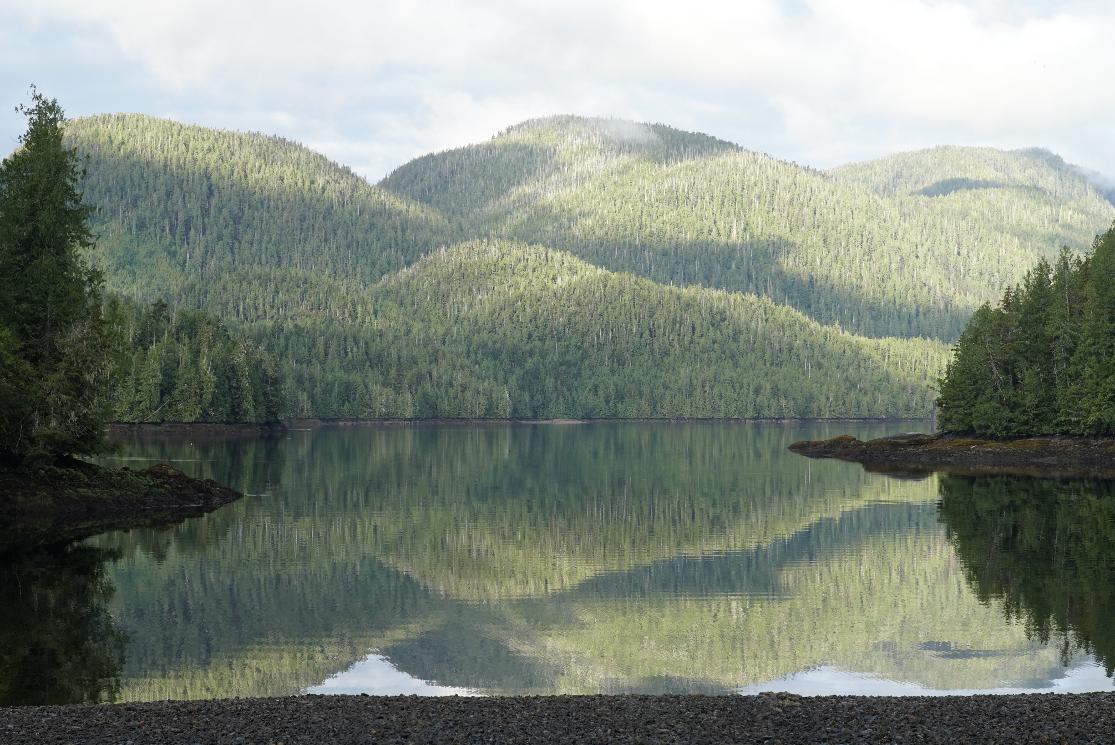 午后,房间露台外一池碧水随雨滴的韵律荡漾。夜里再走上露台,潮水几乎涨到脚尖,涌上来月亮对海洋的召唤。尽管月亮的脸藏在云幕背后。在大熊雨林——地球上最大的海岸温带雨林,沉默的云是天空的主宰。淅淅沥沥的雨是它断断续续的倾诉。阴雨笼罩的天空却常在清晨透出几朵青蓝。海湾潮水褪去,露出长长的石滩。清浅的水面如一面镜子,映照出连绵青山,一缕棉线般的白云缠绕在山尖,纹丝不动。只有鸟鸣穿透这凝固的时空。
