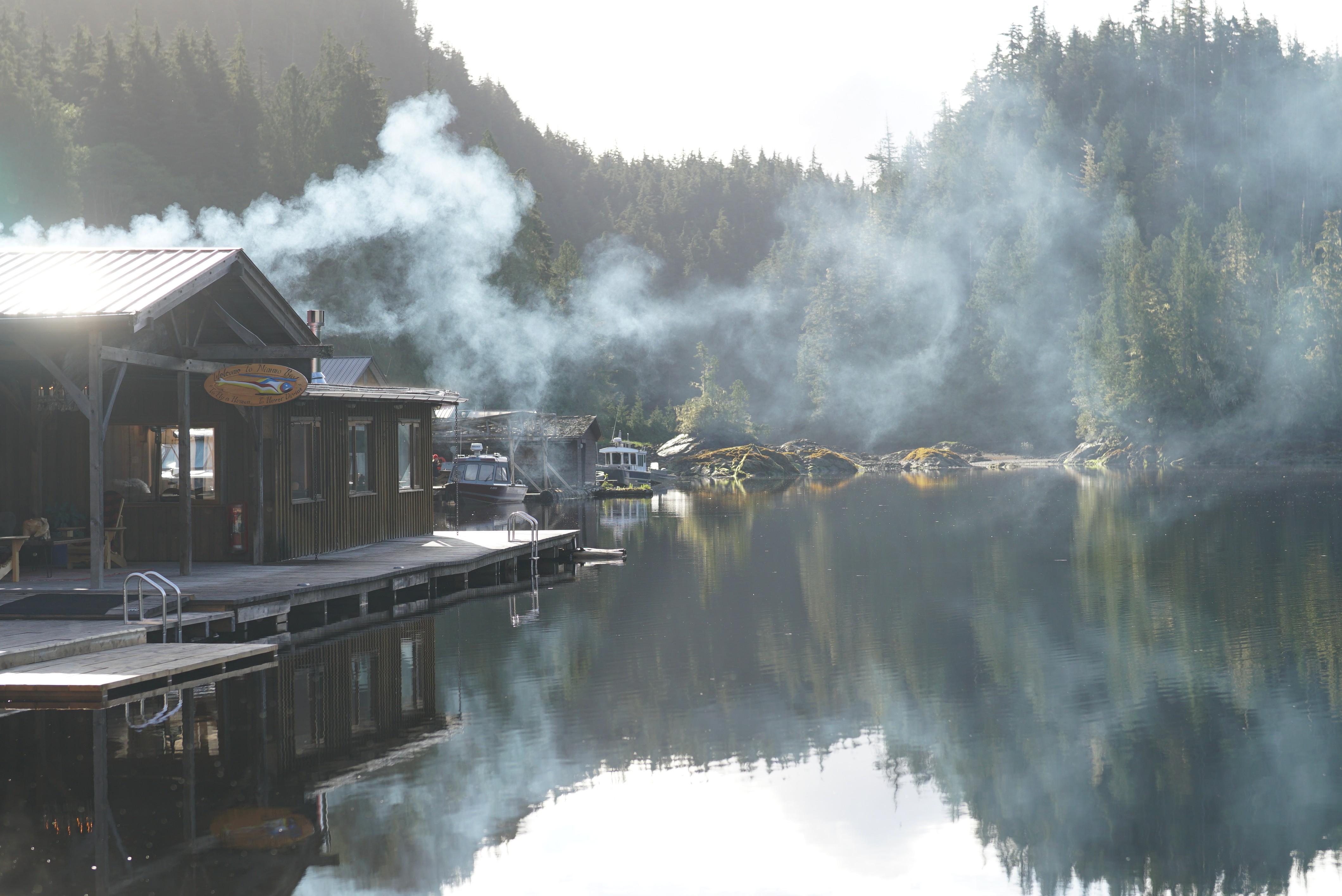 “Finding Nimmo.”在一间玻璃墙环绕的林间木屋里,我们问起wifi密码,一位瘦瘦高高、穿着墨绿色防雨夹克和黑色长筒雨靴的工作人员笑着回答。我们也会心一笑。安静的瞬间,背景哗哗的水声愈加声势浩大。玻璃墙外浓翠欲滴,数尺绿荫背后,一座爬满绿植的陡峭山崖上,一条晶莹剔透的瀑布奔腾垂落。高处隐入山林,向上延绵,看不见的尽头是两千米六百米之上的Mt. Stevens. 山顶的皑皑白雪携森林中的雨水一路流淌,坠入山脚的石滩,白瀑汇成碧绿的溪流,自雨林深处潺潺流向开阔的海湾。工作人员望向瀑布说,这是一切的源头——既是物理意义上的,也是时间意义上的。四十二年前的六月,年轻的旅馆主人从当地伐木工口中打听到这处隐秘的瀑布,从温哥华岛北端的Port Hardy驾船出发,在浓雾中的海湾苦苦寻觅;直到他熄灭引擎,哗啦啦的水声灌入耳朵。水意味着饮用水、生活用水与可再生的电力,意味着生命的可能性。他与家人从此在这儿安营扎寨,建起荒野中的旅馆。