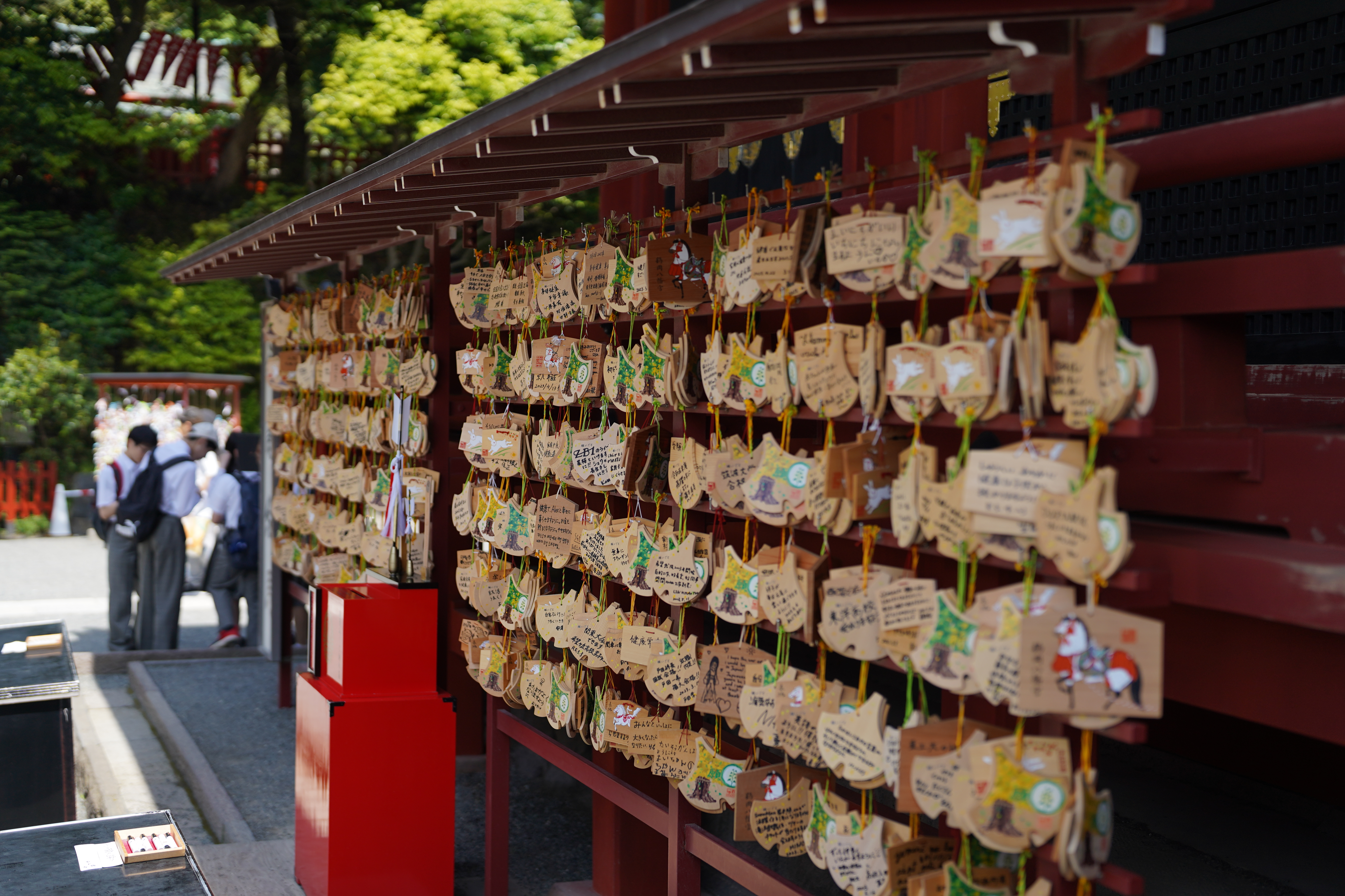鹤冈八幡宫是个例外,一座高大红色鸟居显赫地在城中画出一片神界,长长的林荫参道直通往仿佛浮在空中的朱红神殿。踩着陡直的台阶爬上山腰,绿色银杏掩映的本殿泛着金红的光,华丽又肃穆,静静聆听零钱声、拍手声与默念的心声。殿外红木架上挂满银杏叶形状的绘马,大概这阵有许多修学旅行的学生,看到的多是年轻人的心愿:“剑道全国大赛出场”“考上庆应大学”…… 八幡神乃源氏氏神,被视为“武运之神”,那便祝这些年轻人在无论何方赛场上所向披靡吧。