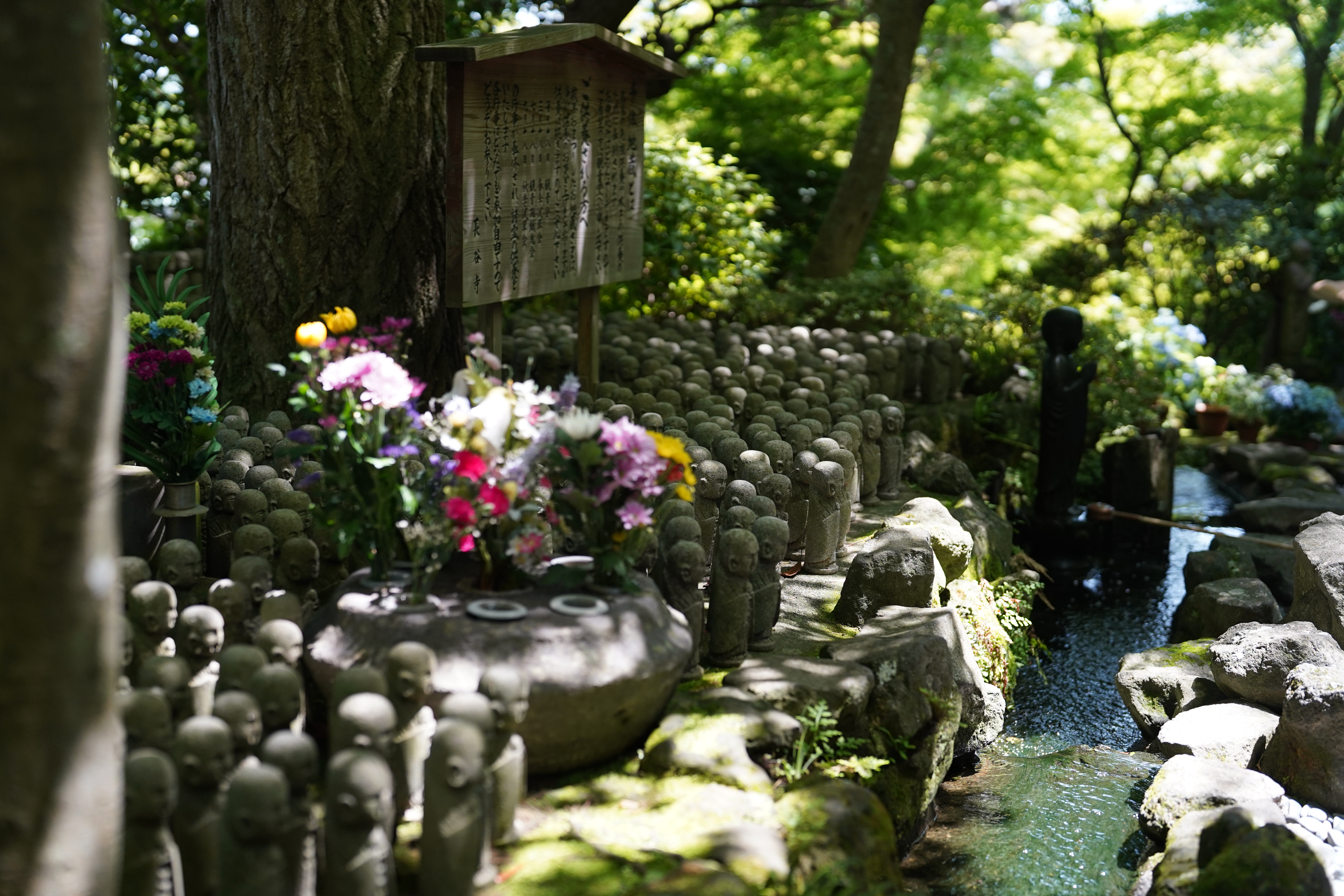 第二次来到长谷寺,九年前遍地鲜红妖娆的蔓珠沙华,五月变成泉边幽静的蓝色绣球与池中古雅的紫色菖蒲。爬上台阶,层层叠叠的新绿与星星点点的白花遮掩碧空,正如青苔与绿藤铺满古墙。三座小地藏笑眯眯地立在绿地上,便是有名的“良缘地藏”。再往上几阶,一片浓荫中齐齐整整立着千尊小菩萨,叶间漏下的光在石像上流淌。一道细流嘀嘀嗒嗒绕石像群流过,映在水中的绣球翩跹,庄周梦蝶。多尊佛像前供着美丽的鲜花——供佛如供先人,就当他们存在于我们的世界。继续往上爬,枝叶散开,豁然开朗。雄伟的正殿内供着一千三百年历史的十一面观音菩萨,是日本最大的木雕观音像之一。西侧见晴台可俯瞰湘南海岸,灰蓝的海湾延绵,层层白浪扑向积木般林立的小屋,绿色电车从窄街中晃悠悠驶过。身后温柔的山风拥裹,扑面而来是海潮的气息。