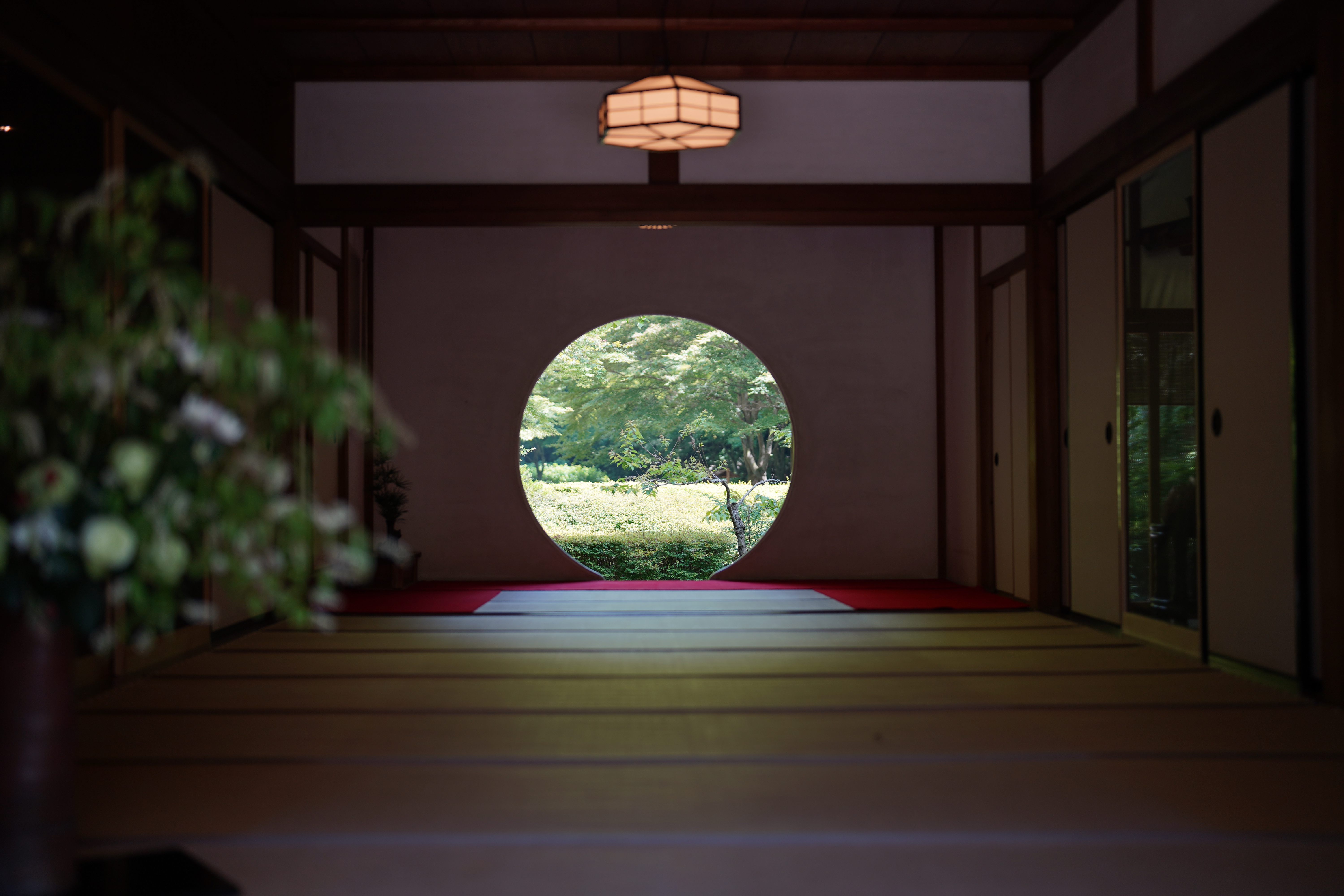 从圆觉寺出来沿铁道往南走几分钟,路过一线幽静民宅,便来到明月院。石上盖满青苔,绿荫浮在天空,人如游在飘满浮萍的池中,一抬手便是来不及晕开的绿。这座建于十四世纪的小寺原是一座塔头,十七世纪主寺不复存在,它却保留下来。高低不平的长石阶两侧生满绣球,此时宽阔绿叶间缀满星星点点的花苞,大概再过两三周就将在淅淅沥沥的雨中化成粉蓝的蝴蝶。台阶尽头木门上饰着生花,门后一方绿庭接一方枯山水,方丈殿一扇圆窗如镜,映出后庭绿影。自觉投三百日元到钱箱,拉开竹栏竿走入镜中。大片菖蒲初绽,如紫色蜂鸟落在翠枝。砂庭一侧身披彩巾的地藏前也供着一支花菖蒲。地藏脚边蹲着一双活灵活现的石兔,左边那只小脑袋上竟架着一副塑料框眼镜,仿佛连接我们与它们的世界的入口。说来院中四处可见兔子雕像,明月之上有玉兔呀。夜晚整座寺院会不会发出柔光,清辉在花间流淌,兔子们竖起耳朵捣年糕。