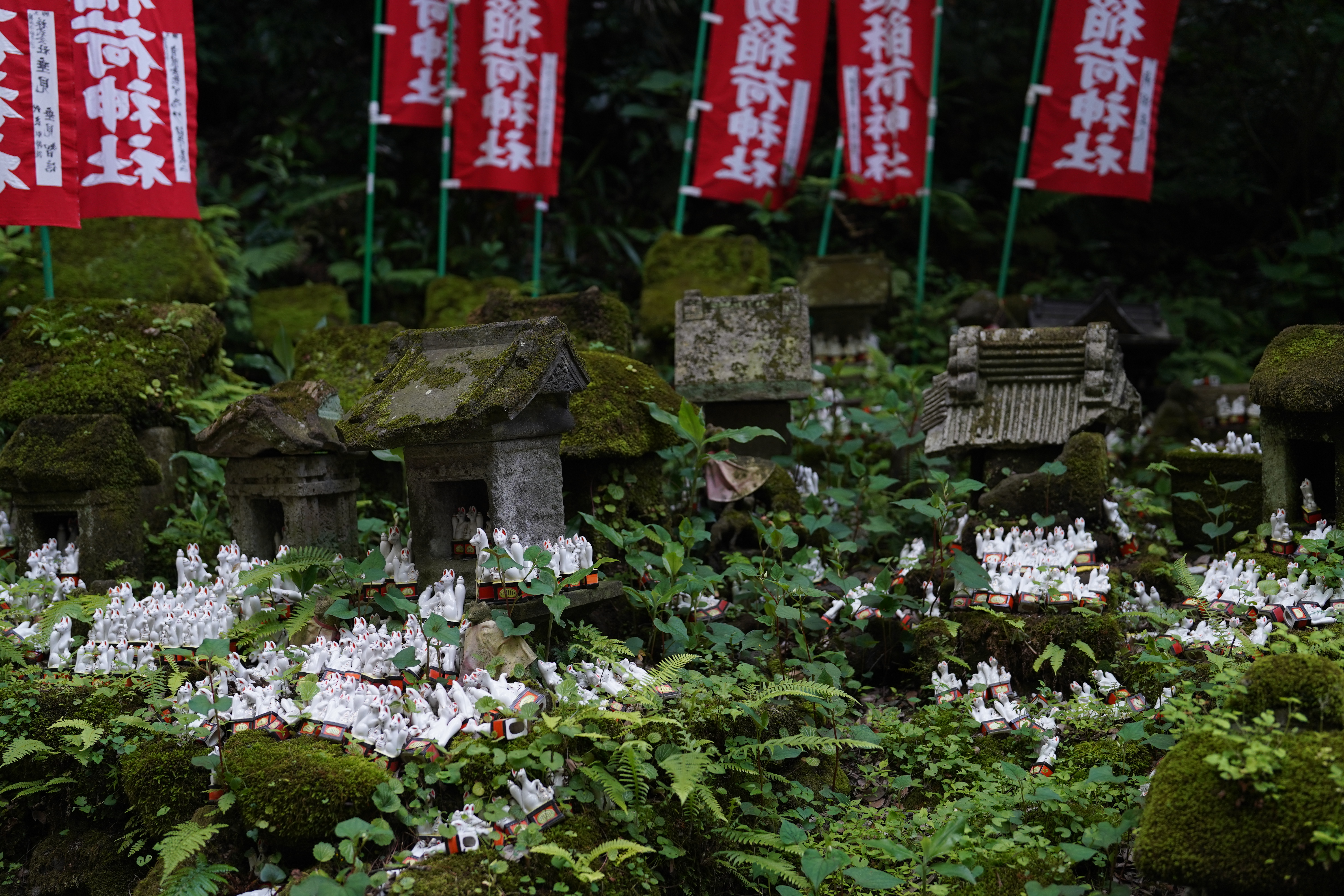 从八幡宫与车站的人潮中走出来十分钟便是安静的街巷。佐助稻荷神社就藏在居民街道尽头的山中。石碑标出的小径上不知为何停着一辆蓝色迷你货车,一群穿校服的学生从重重鸟居组成的朱红长廊中走出来,长廊另一头高处山坡上阳光穿过密林投下金色的网。呆呆站了一会,好似在看一幕忘了情节的动画。忽的小车开走人群散去,只剩我们走在鸟居甬道,身上裹着朱红的光。风吹得红柱间草叶窸窣,低头一看,每根红柱下都坐着尖脸细眼的白瓷小狐狸。每只约十厘米高,多为三两只排排坐。有一只单独坐着,颈上系着红围兜,头顶一株绿叶,在它红色尖耳朵上方摇曳。石阶向陡坡攀沿,不见尽头,直至一座小巧的红色神殿出现在山中空地。四周遍地青苔,每一棵树下、每一座泉池边、每一座灯笼下都住着白瓷小狐狸,甚至石灯笼里边也挤着三只,从窗口探出尖尖的小脑袋。后山上一方高草丛生的小院里更是密密麻麻坐满小狐狸,仿佛野地上开出白花,每一朵变成一只白狐。白狐乃稻荷神的使者,现身在此并不意外,但我从未见过这么多只,俨然已成它们的世界——作为闯入者不禁想要放轻脚步,屏住呼吸。绘马架上挂着可爱的狐狸绘马,其中一块写着「甲子園に行けますように」。棒球少年的祈愿白狐们都听到了吧。