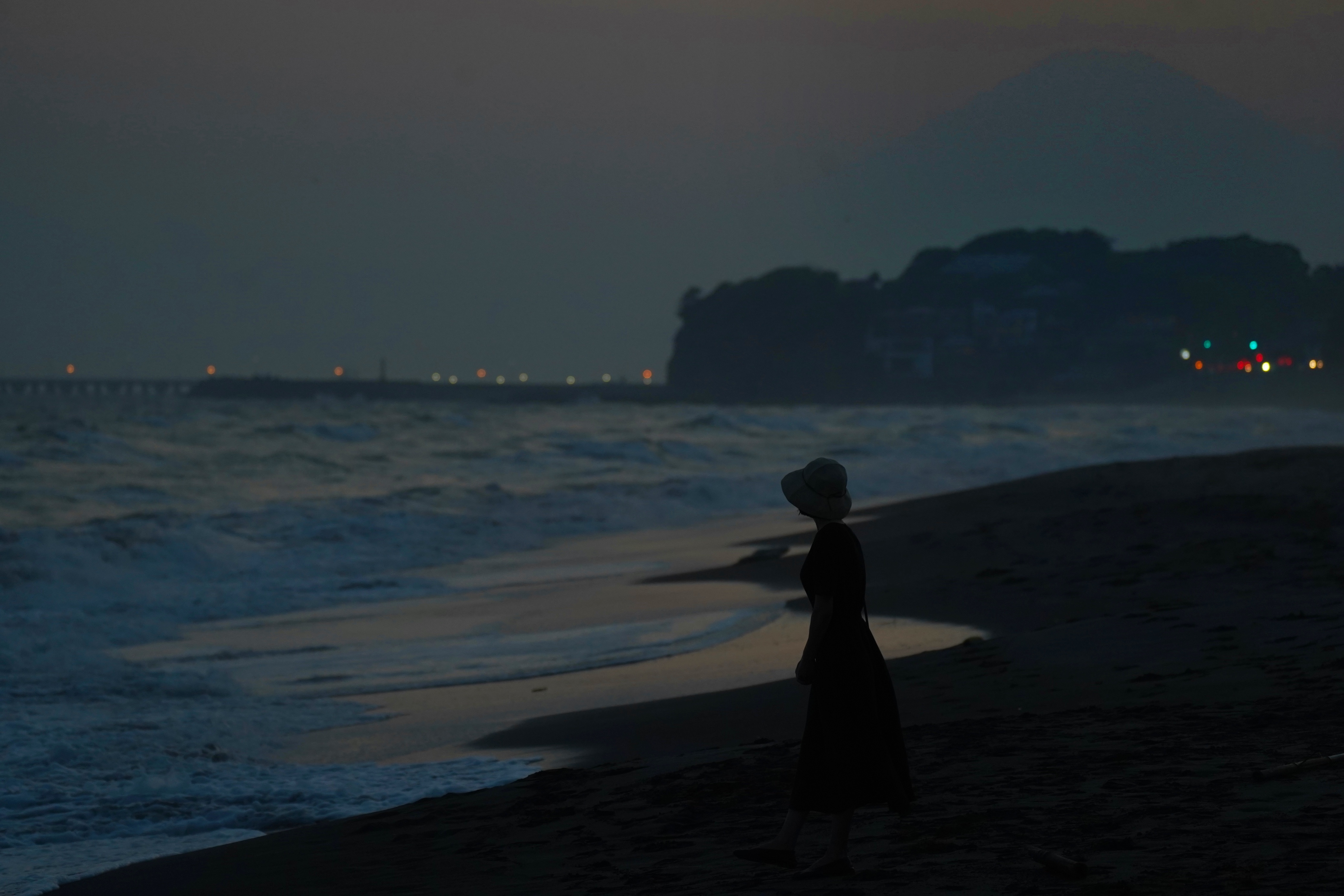 海风吹熄了晚霞。泡泡浮在海街,山影飘在天边,随时可能消失,如同这一刻的记忆。我害怕忘记,如果看得更用力一点,是否能多记住一秒?灰蓝的海与碧蓝的天终于染成同一种墨蓝,向远方一直游去,是否就能游入星汉?没有答案,空留潮音。