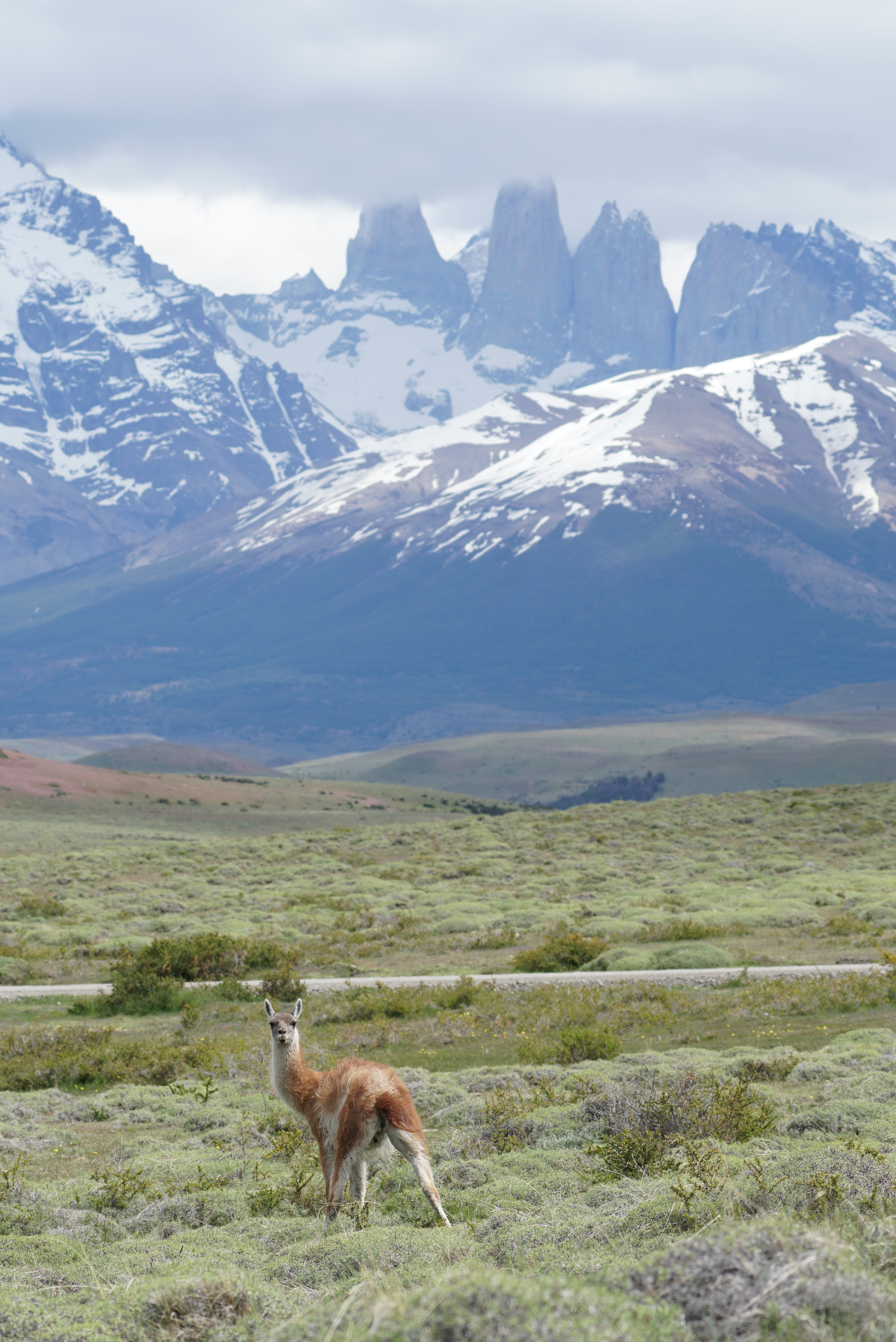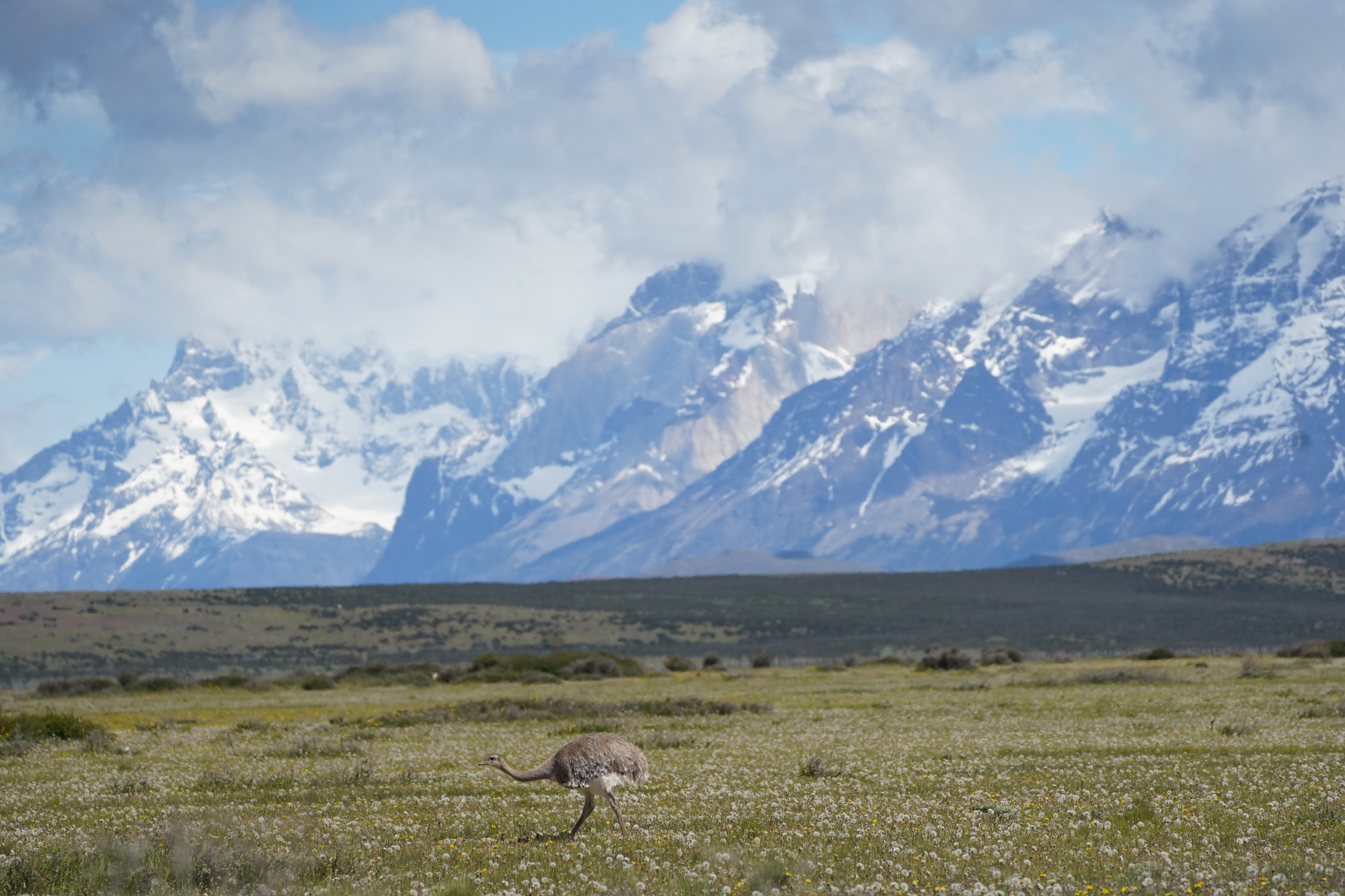 从机场出来,车窗外一路雪峰延绵,辽阔的墨绿色大地上缀有湖泊与高崖,如利剑削过山峰,银色珍珠散落。一时想起冰岛,又想起苏格兰,想起阿拉斯加,像把这些地方揉在一块,但与它们又都不同。这里不属于熊,也不属于羊群与人类——虽有不少借住于此;真正的原住民是原驼 (guanaco),一身红棕色绒毛,竖着尖耳朵好奇地打量我们,有的露出肚皮在地上打滚,有的轻盈跃过半人高的围栏。三四位马背上的牧羊人带领五六只狗赶来一大群绵羊,黑白相间的牧羊犬灵巧地追赶落在队尾的小羊。这些baqueanos(即Patagonia cowboys)祖祖辈辈在这片土地上照看马匹,放牧羊群。一只南美鸵鸟漫步在一片无垠的花野,通身灰白两色长羽,弯曲着细长脖颈在白色花毯间寻觅。花海飘渺的尽头上方浮着群山,几座雄浑雪峰的凹口,三道出鞘的石剑插入天空,尖利的刀锋划破缭绕的薄云。这是我第一眼见到的百内三塔。