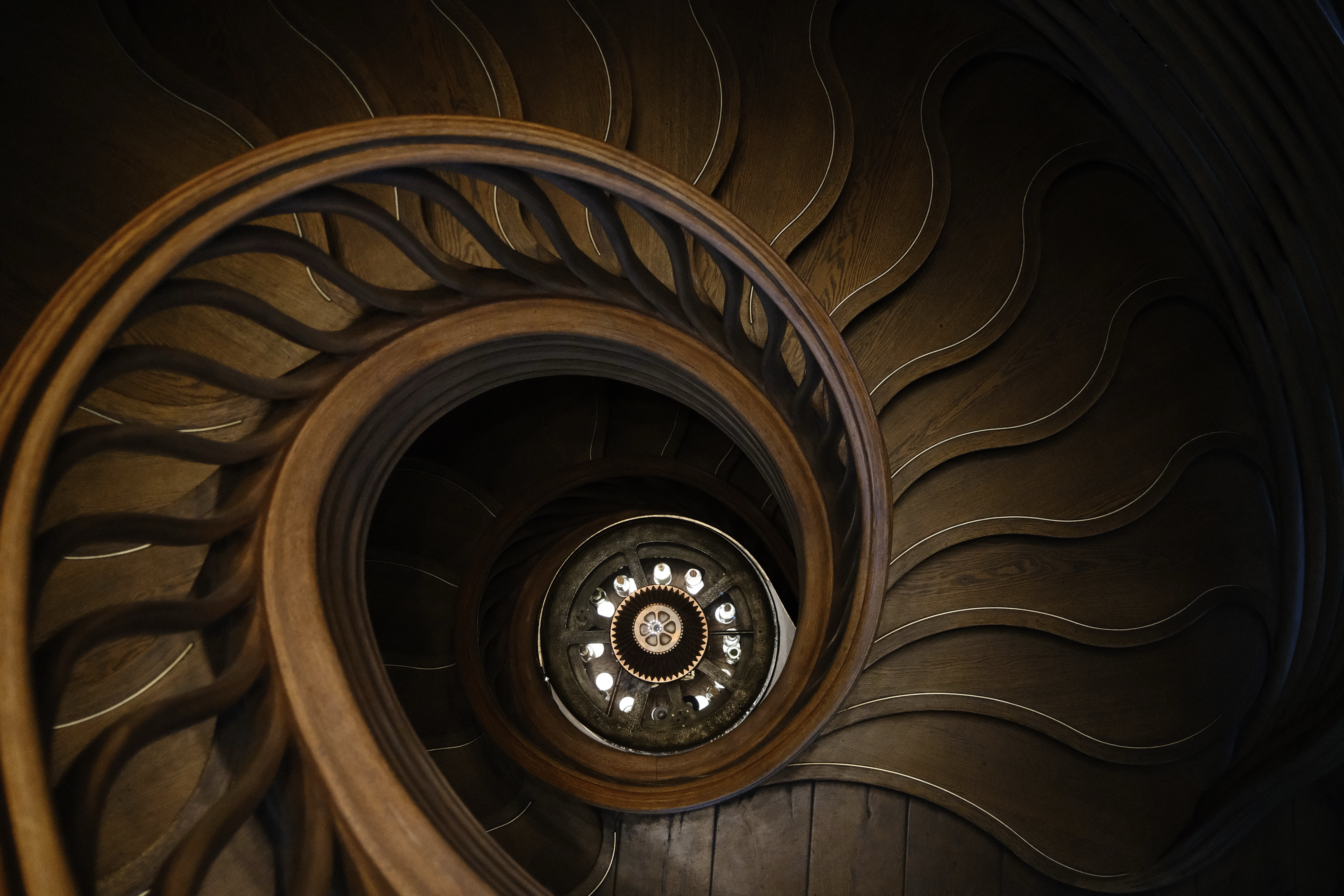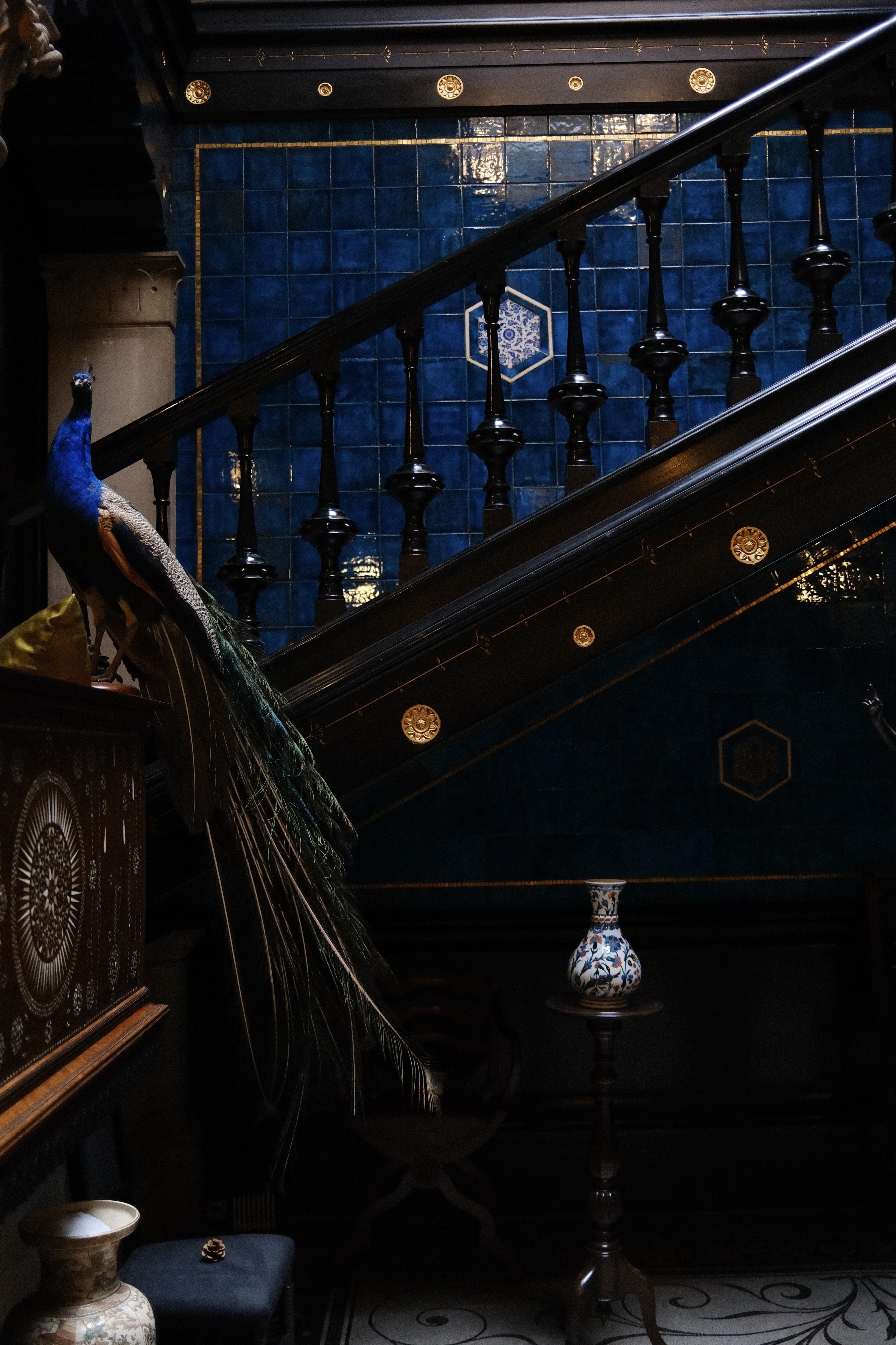 在伦敦一不小心便会落入螺旋楼梯的涡流。海德公园旁的Hide餐厅里盘踞着一只庞大华丽的木纹菊石。Leighton House的地下室一座蓝银色墙画装饰的铁制楼梯盘旋而上,托起蓝白色瓷砖装饰的绚丽厅堂。这位十九世纪画家将阿拉伯式内庭引入维多利亚式厅堂:收集自土耳其和叙利亚的蓝调彩色瓷砖贴满墙面,黑白相间的马赛克花纹装饰地面,金色马赛克饰带连接金灿灿的穹顶,阴翳华美的空间中央、低垂的金枝吊灯下方,一支细泉在黑色大理石池中汩汩涌动,恍惚间身处百年前大马士革贵族的客厅;只有两侧精雕细琢的木格窗隐隐透出伦敦夏日的绿意与柔光。一旁通向二层的楼梯间墙面瓷砖是色泽饱和度更高的深蓝色,呼应栖息在木质楼梯扶手上的一只蓝红雀,长尾羽如宝石瀑布落向铺深红地毯的黑白马赛克地面。天井投下的光如一层薄银镀在瓷花瓶与铜雕塑身上,整个方正的小空间如一枚东方宝盒,同时充满张扬炫目的艺术感与为保持格调的克制感。走出门回头看,这幢典型的红砖墙维多利亚住宅与周边气派老宅林立的街区融为一体,装载异域时空的阿拉伯厅仿佛一个保存完好的秘密。
