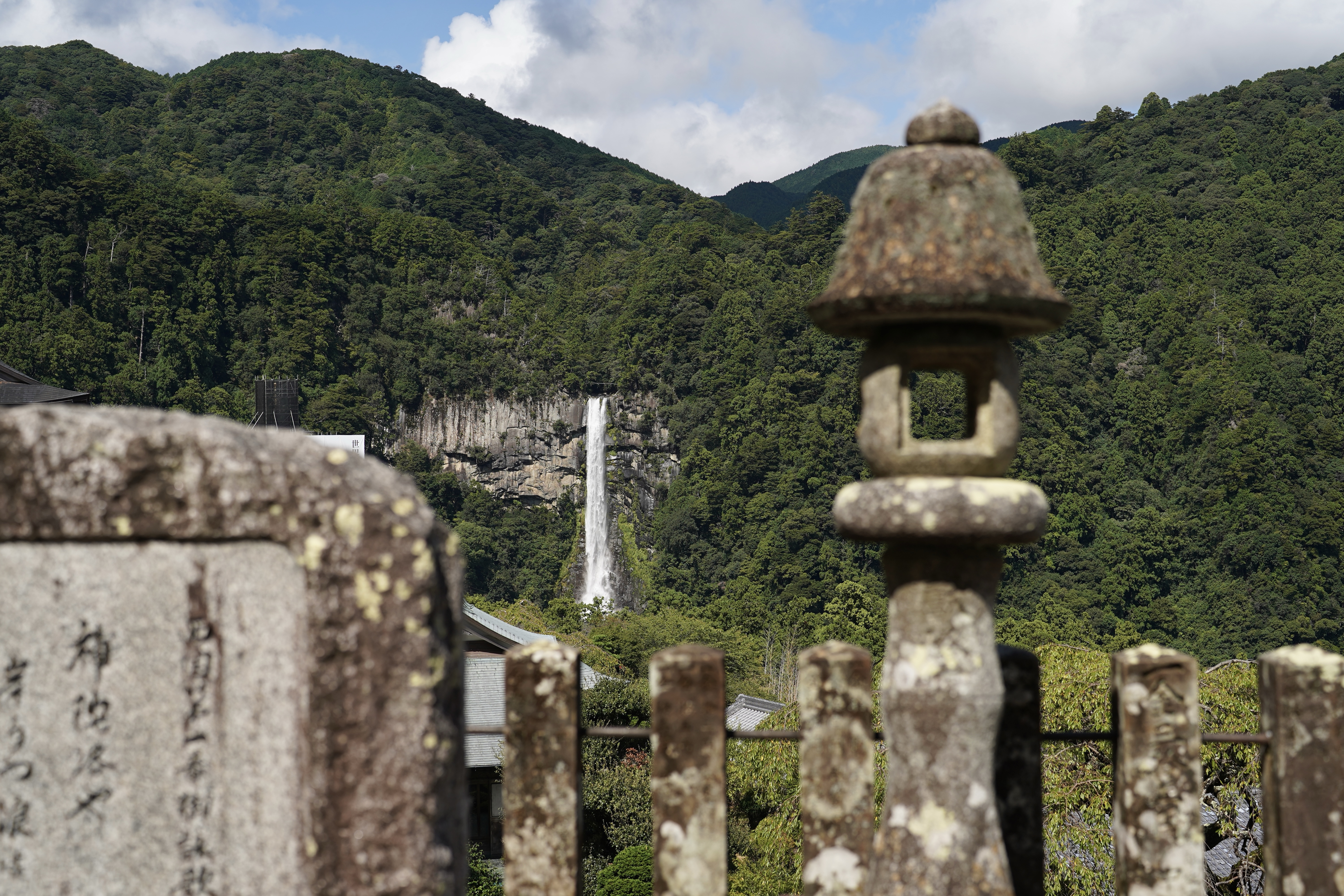 翌日清晨,在第一批朝圣者竹杖轻靴步入山林之时,我们也驱车前往那智山。一路山林延绵,分不清此山彼山。忽然水声如注,百米余高的峭壁上飞落银瀑,那智の瀧落在眼前。从瀑布往上是云中的神域,往下是攀升的古道。为了体验朝圣的心情,特地绕路攀登大门坂。古道两侧参天杉林遮天蔽日,树干粗过希腊神殿的立柱;立柱不见顶冠,石阶也不见尽头,层层叠叠,好似一道石瀑从林间滚落。石缝间生满青苔与草叶,长长的路愈显幽深,一阶一阶通向更幽深处。偶有阳光照进树的间隙,浓密的绿就薄透一点,石头则烫上一层金;但很快金光熄灭,又复幽绿。停下脚步瀑布声与鸟鸣不绝于耳,偶尔响起清脆的熊铃声,叮铃叮铃靠近,又叮铃叮铃远去。