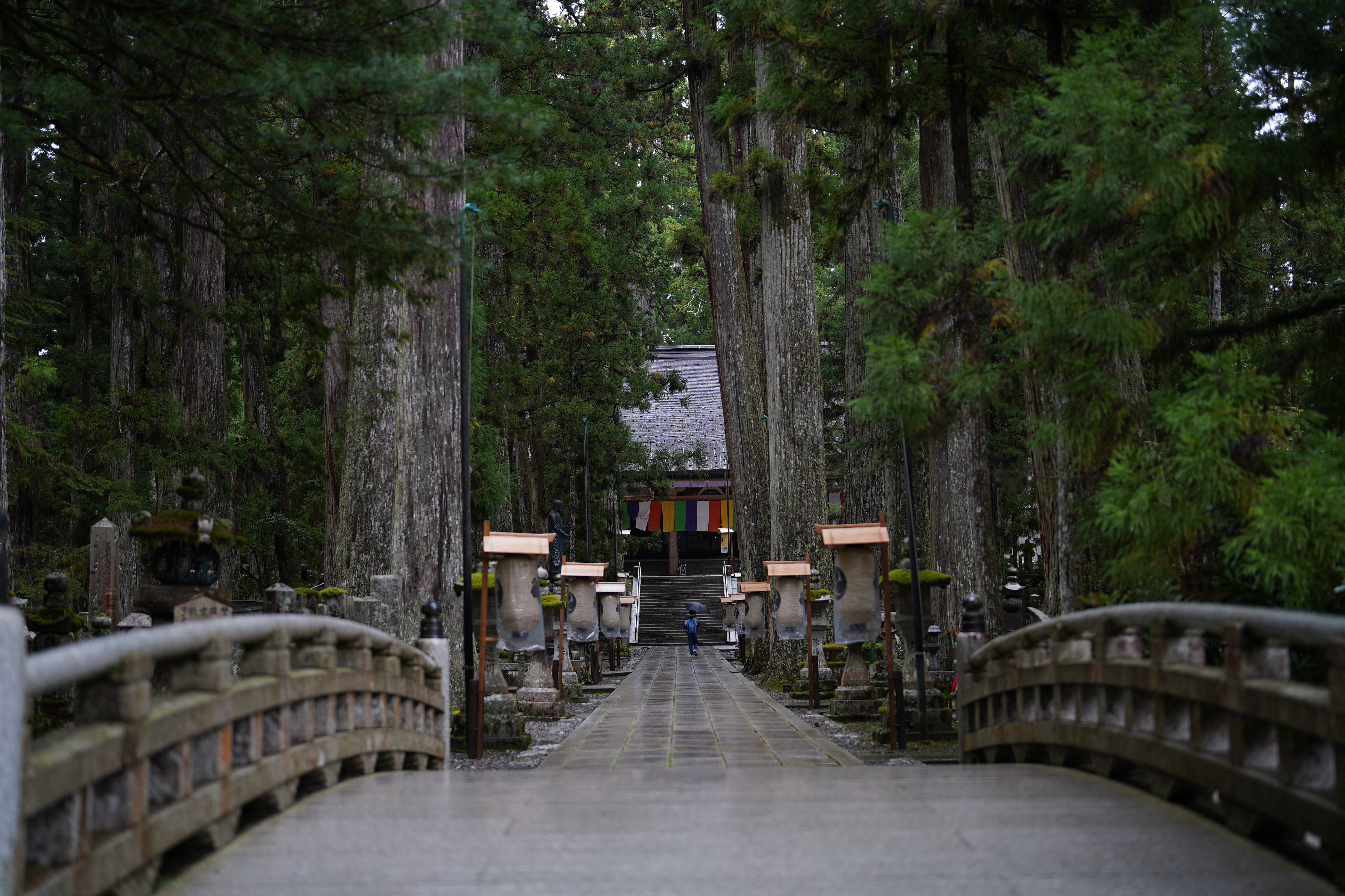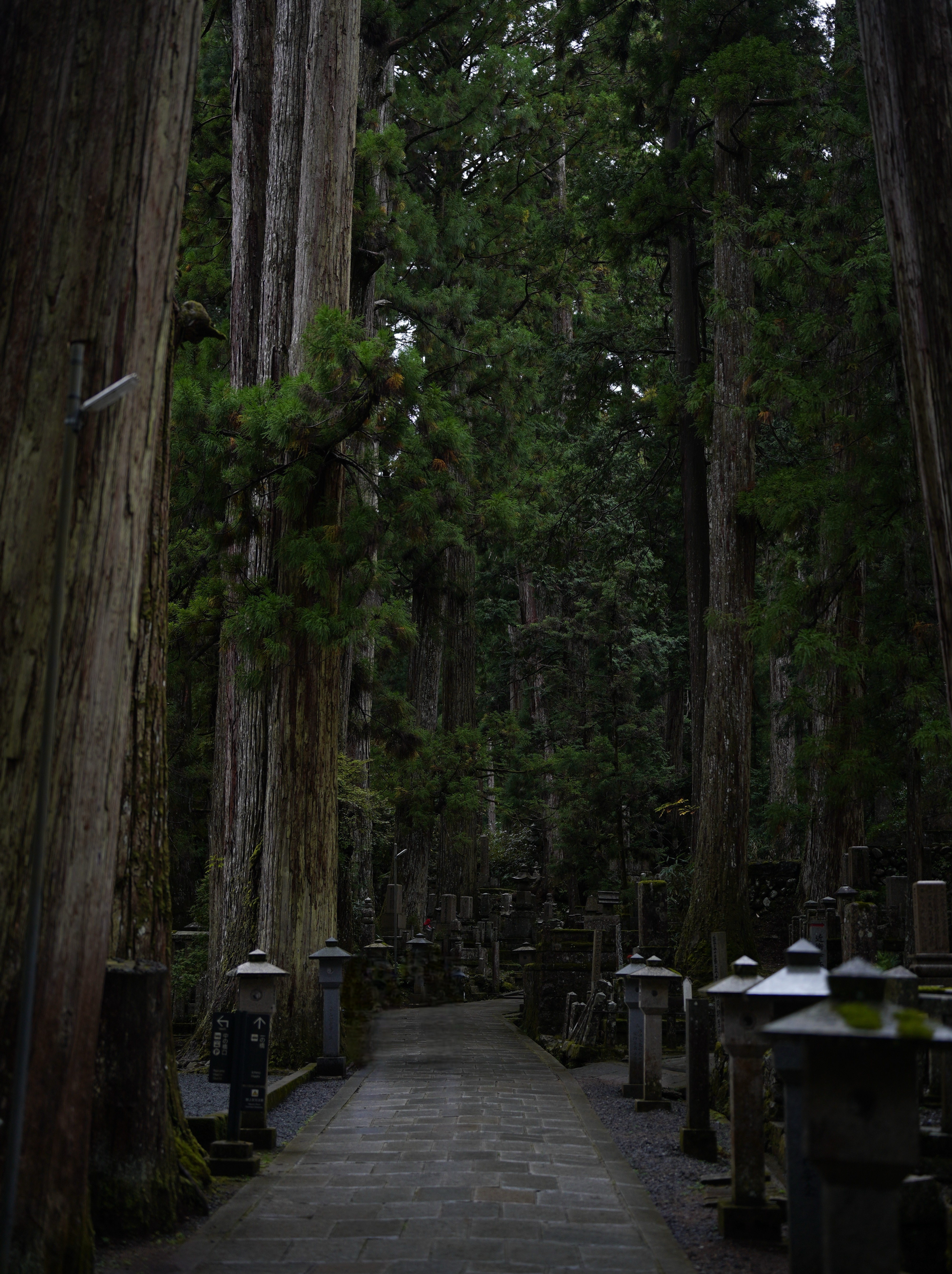 寺前是山中唯一一条主路,沿这条路一直往深处去,便可抵达奥之院——这是一片杉林,是一片墓地,也是空海入定之地。835年,空海于高野山圆寂,然而信徒认为他并未逝去,而是在山林深处的洞窟中禅定,祈祷众生的平安。此后平安时代皇族、战国时代武将到江户时代上至大名下至庶民纷纷选择安葬于此,如今参天杉林庇护着二十万座墓。数百岁的古杉把天空染成墨绿,大地则被青苔染成幽绿,渗入不知多少年的石头缝里。人影稀疏,万籁俱寂,两列石灯笼画出蜿蜒的参道,淅淅沥沥的雨中泛着水光。石板路两侧全是墓碑——偶有石头造起的房屋或鸟居,大多则是象征空、风、火、水、地五大元素的五轮塔,还有不少是简简单单一根方型石柱。丰臣家墓是陡直台阶尽头一列五轮塔,明智光秀是低矮石墙围出一方墓地,织田信长则是混在众墓中的一座碑。显赫的姓名与无人知晓的名字并列,年代、地位、信仰失去界限,喧嚣的英雄与沉默的凡人皆成渴望安宁的魂魄。维护较新的墓碑前常供着鲜花或松枝,花枝上落着露水还是雨滴;但更多墓碑生满青苔,名字亦变得模糊——普通人被遗忘始终只是时间问题。无论活着还是死去,接受遗忘是宿命。人生是孤独的旅途。