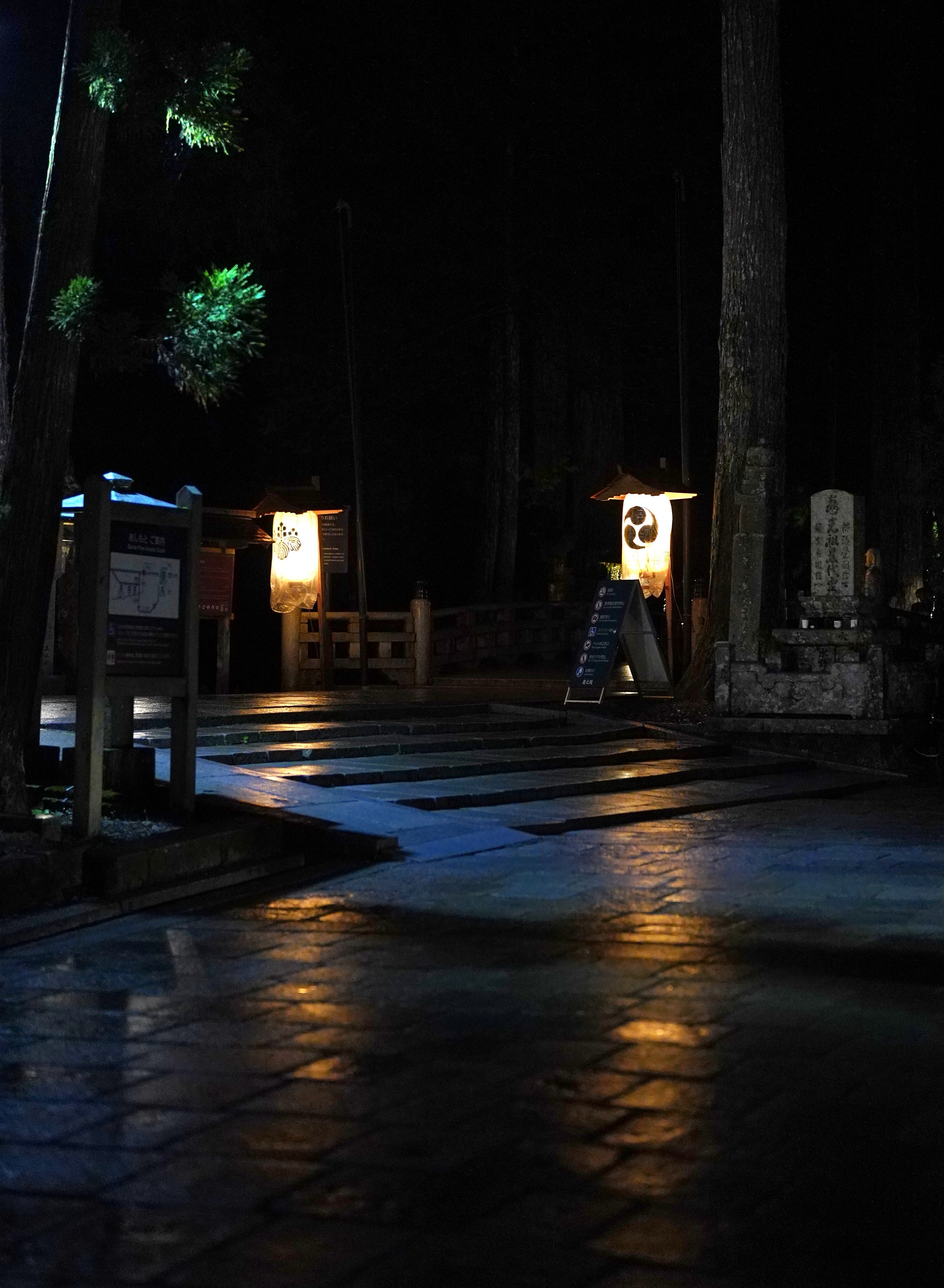 夜里再度回到奥之院,古杉消失在夜空中,两列长明灯画出幽暗曲长的石板路,像是通往另一个国度,不属于现世者。随一位身披袈裟的年轻德国向导穿过浩瀚墓地,他发音清晰又特色分明的英语既带来一种现实感,又加剧着时空错乱感。他娓娓道来或新或旧的故事,比如空海的传说,比如一位外国人如何成为一名高野山僧侣;所有事皆成无数亡灵的睡前故事。不久走到长路尽头的御庙桥,夜晚桥头亮起纸灯笼,橘黄灯光融化在雨水淋湿的石板上。灯笼堂灯火比白日更明亮,今晚正举行万灯会,满堂僧侣为供灯者祈福,诵经声绕梁数周,飘散入夜色,空空荡荡,并无回响。也许神明已不在,是人在念颂他们的故事;之后人也将不在,墓碑生满青苔。