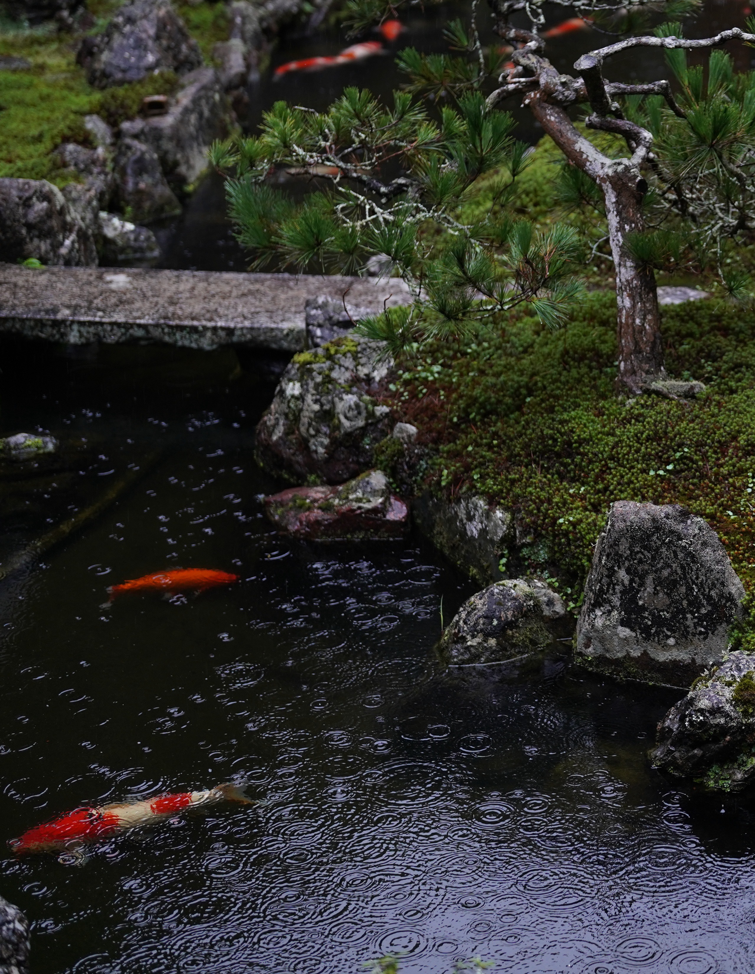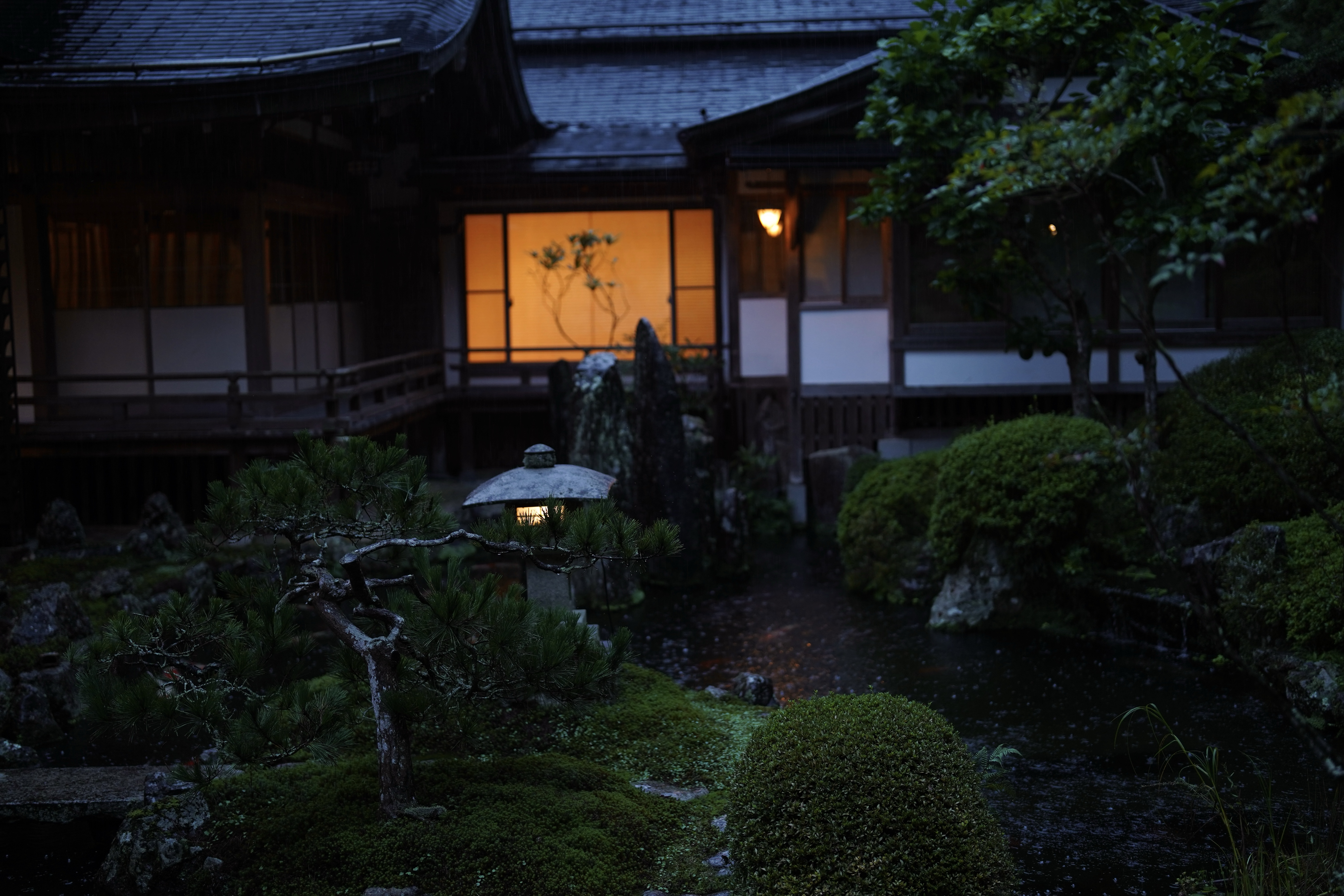 夜宿一乘院,说是宿坊,但舒适度堪比温泉旅馆。我们住的奥书院三面绿庭环绕,木廊正对开宽池庭,雨水打湿松枝,洗净立石,在石拱桥下的池面绘出圈圈涟漪,一群鲤鱼游来游去,白肥红瘦花的圆滚滚。傍晚庭中石灯笼亮起,绕池长廊上的挂灯亮起,对面纸窗也透出昏黄灯光。僧人小哥端上大盘小盘精进料理,从高野山特产胡麻豆腐到旬物姜丝茄子、柿子沙拉,无一道不是清清澈澈的美味,尝得出用心与功夫。