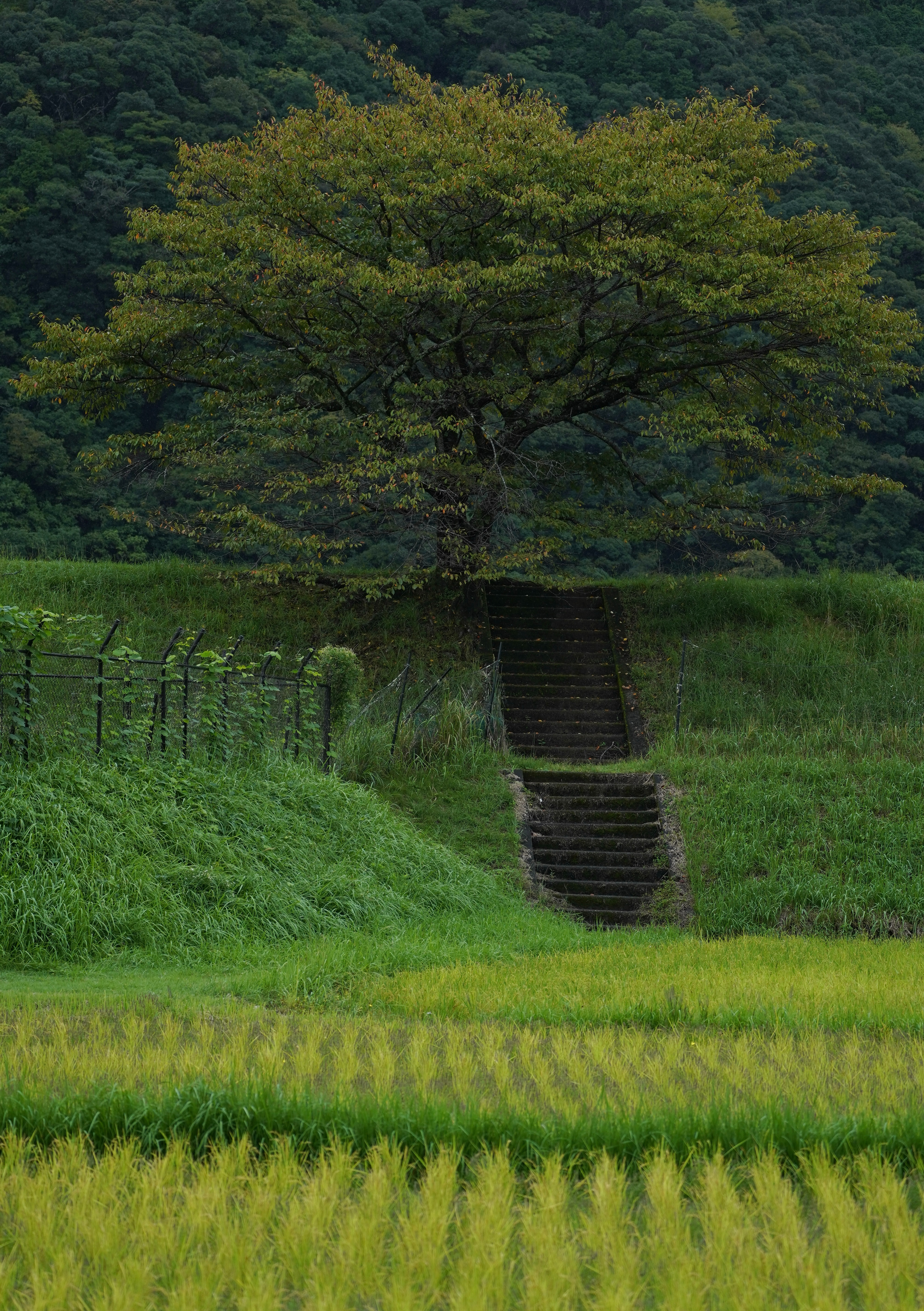 历史可追溯自古坟时代的本宫大社原本座落在三川相交的平地“大斋原”,1889年一场大洪水冲毁旧社,幸存的四座神殿迁至位于山腰的现址。2000年原址上建起一座高达三十多米的石头鸟居,远远望去便能看到它立在一片金黄稻田上、青色群峰间;想象当年朝圣者在山道跋涉,忽至开阔处,望见山脚平原上河川环绕的广阔社境与神殿,想必心潮澎湃。走到大鸟居跟前,庞然大物几乎令人目眩,石柱越过背后不知几百岁的古树。野草围绕着残存的两座石基,除此以外空空荡荡,只有十几颗樱树,绿叶将将开始变黄。稻田旁河堤上立着一棵大樱树,繁茂枝叶撑开一把巨大的绿伞,仿佛要飞向前方云雾缭绕的青山。两人在河堤上走了很久,说要春天再回来这里。