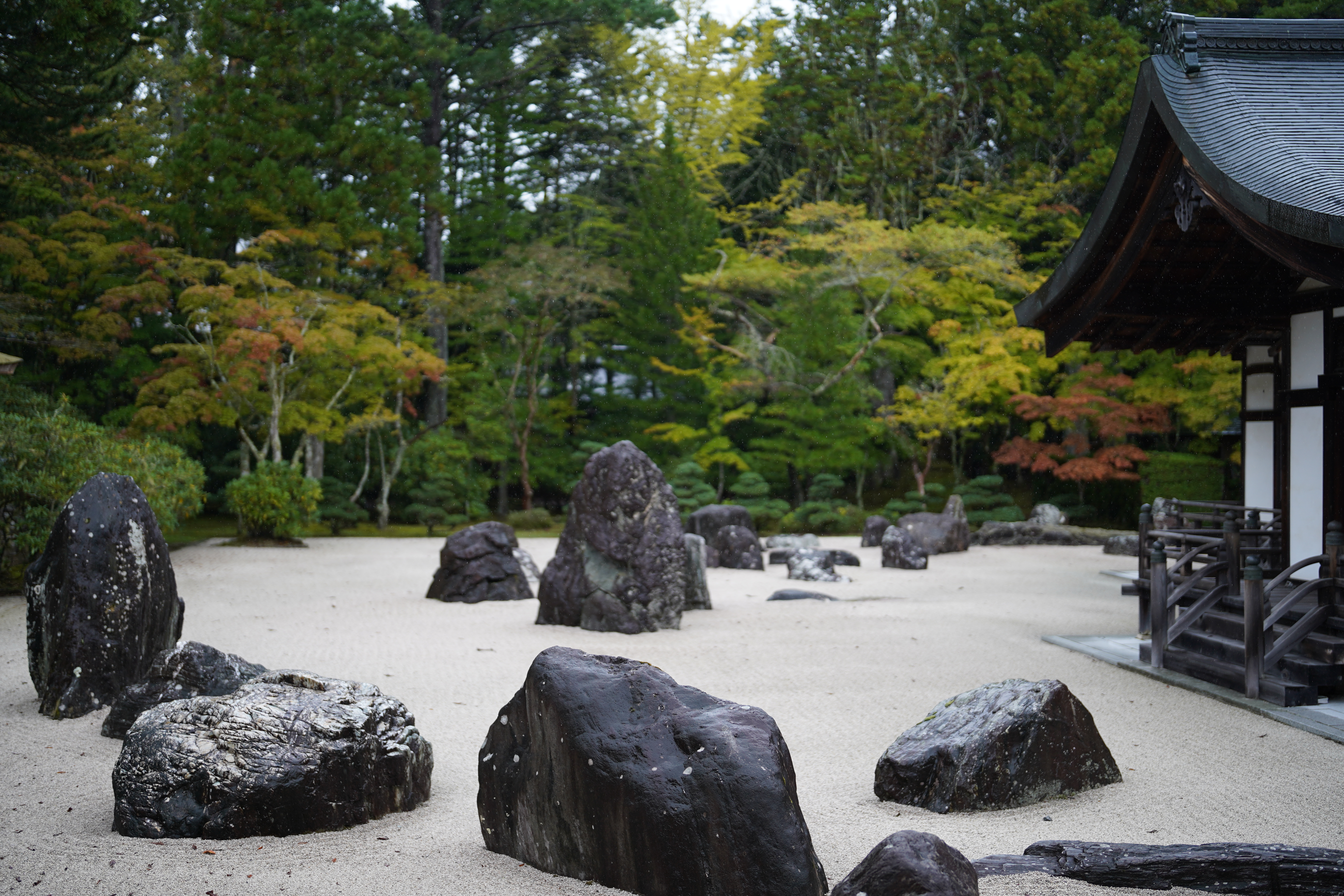 所有山寺统称总本山金刚峯寺,但大都在门前挂着各自院名,唯一座不见牌匾、高高立在宽阔石阶尽头,便是金刚峯寺本坊。古朴厚重的木造主殿乍看并不惊人,走进去才发觉室内室外皆是画。大间和室里云谷派与狩野派隔扇画熠熠生辉,一间一景,有劲松群鹤,梅月流水,雪柳白鹭;静止的画面上亦见鸟飞云散,听得风籁水潺。画卷一直延伸至昭和年间建的别殿,新的笔触绘出空海生平,从入唐的船队与港口到山间邂逅黑白两犬。一条踩上去吱呀作响的长廊尽头,一座广阔的白沙庭院环书院盘旋,瓢泼大雨中仿若一条汹涌白河,冲刷过林立其间形态各异的巨石——这些花岗岩立石来自空海出生地四国,而白沙来自他传教的京都。据说巨石连成雌雄两条巨龙,晴日嬉戏白云间;而在这雨天,大颗雨珠不断从天空与屋檐落下,一滴一滴缀入环形沙纹,枯山水注入活水奔涌流淌,巨龙畅游波涛间。浩大的水也落在旧时的起居室与围炉间:千住博装饰的隔扇门上一侧是云雾缭绕的断崖,一侧是气势磅礴的瀑布;高高的天井落下微光,照亮飞流直下的银瀑。耳边水声哗哗,在这一刻,美即是真;无需任何人念诵经文或讲述充满奇迹的故事,我接受了一场微型洗礼。