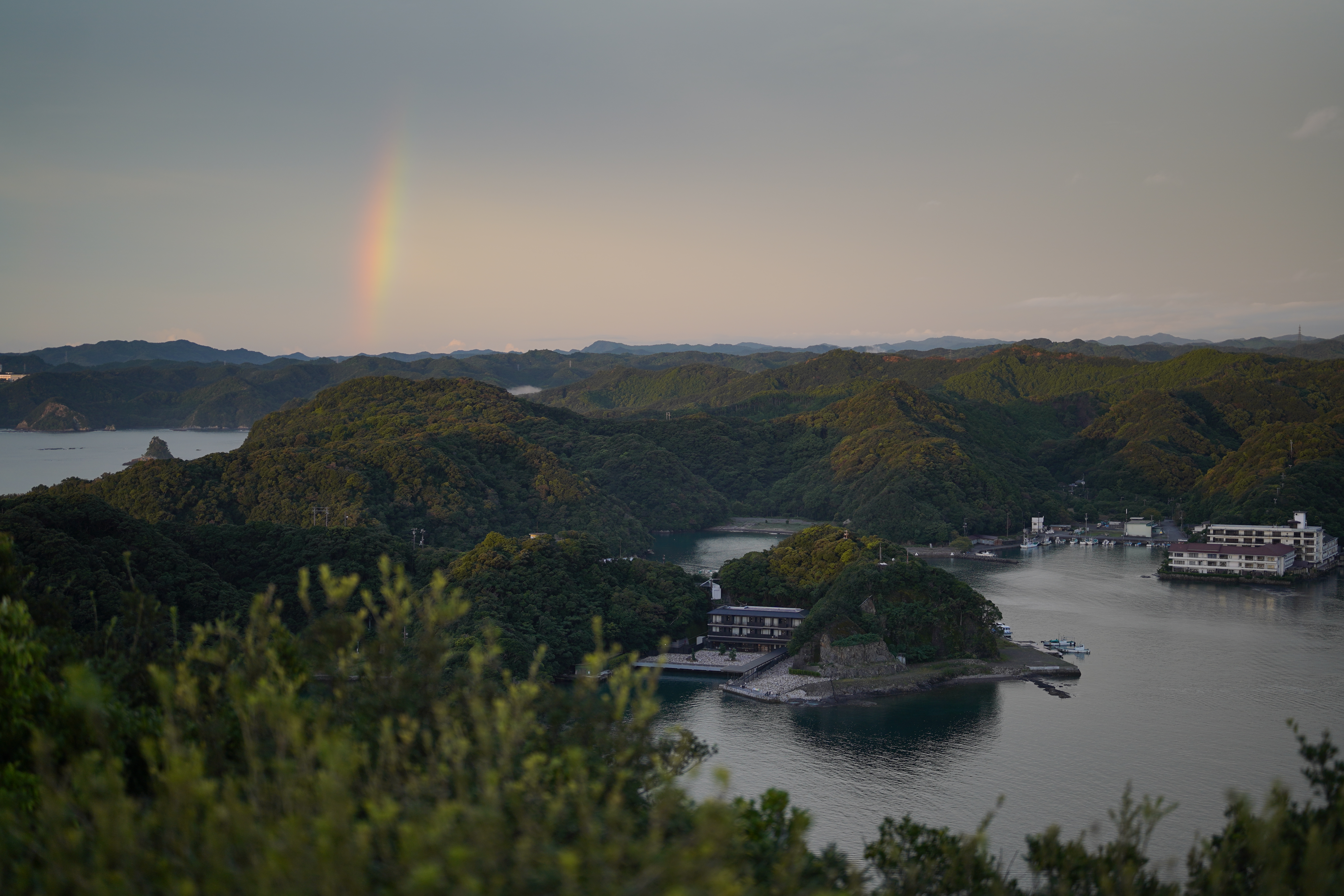 这天住到那智胜浦,明亮阳光下安静的小渔村仿佛《悬崖上的金鱼姬》的布景。墙面斑驳的小楼几乎被绿藤吞没,像废弃的旧宅,但又有皮卡进出。码头边停着干干净净的蓝白色渔船。海对岸青峰起伏,白云缭绕,有如仙雾。一座座绿色小岛浮在湛蓝的海面。有两座尖尖的石头岛几乎就浮在岸边,枝叶斜出的巨石下方立着一座小小的红色鸟居,像是神仙住的地方。
