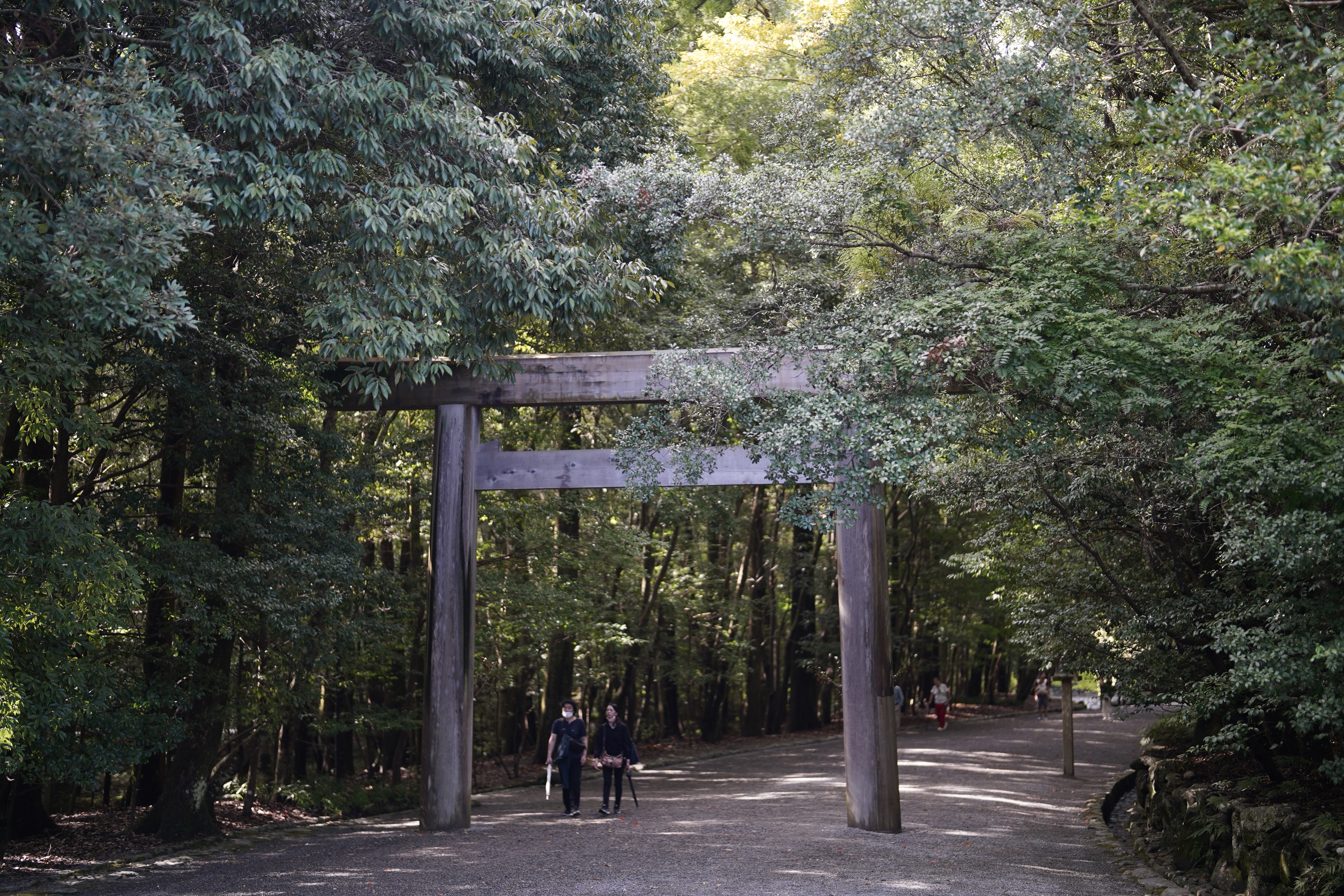 从新宫市往北,公路沿海蜿蜒,穿山越岭,伴随隐在林中的古道与铁道,一同通往三重县伊势市。江户时代流传一句谚语「伊勢へ七度、熊野へ三度」,意为一生要参拜熊野三山三次,参拜伊势神宫七次。伊势神宫在日本人心中的地位可见一斑,说是神道两千余年历史中最神圣的地点也不为过。刚抵达便感受到其非同一般:硕大的停车场挤得满满当当,一辆接一辆大巴运来一队又一队参拜者——有一批批学生,有携孩童的年轻夫妇,但平均年龄远超过我们,口音五花八门,除了我们俩,几乎全是日本人。