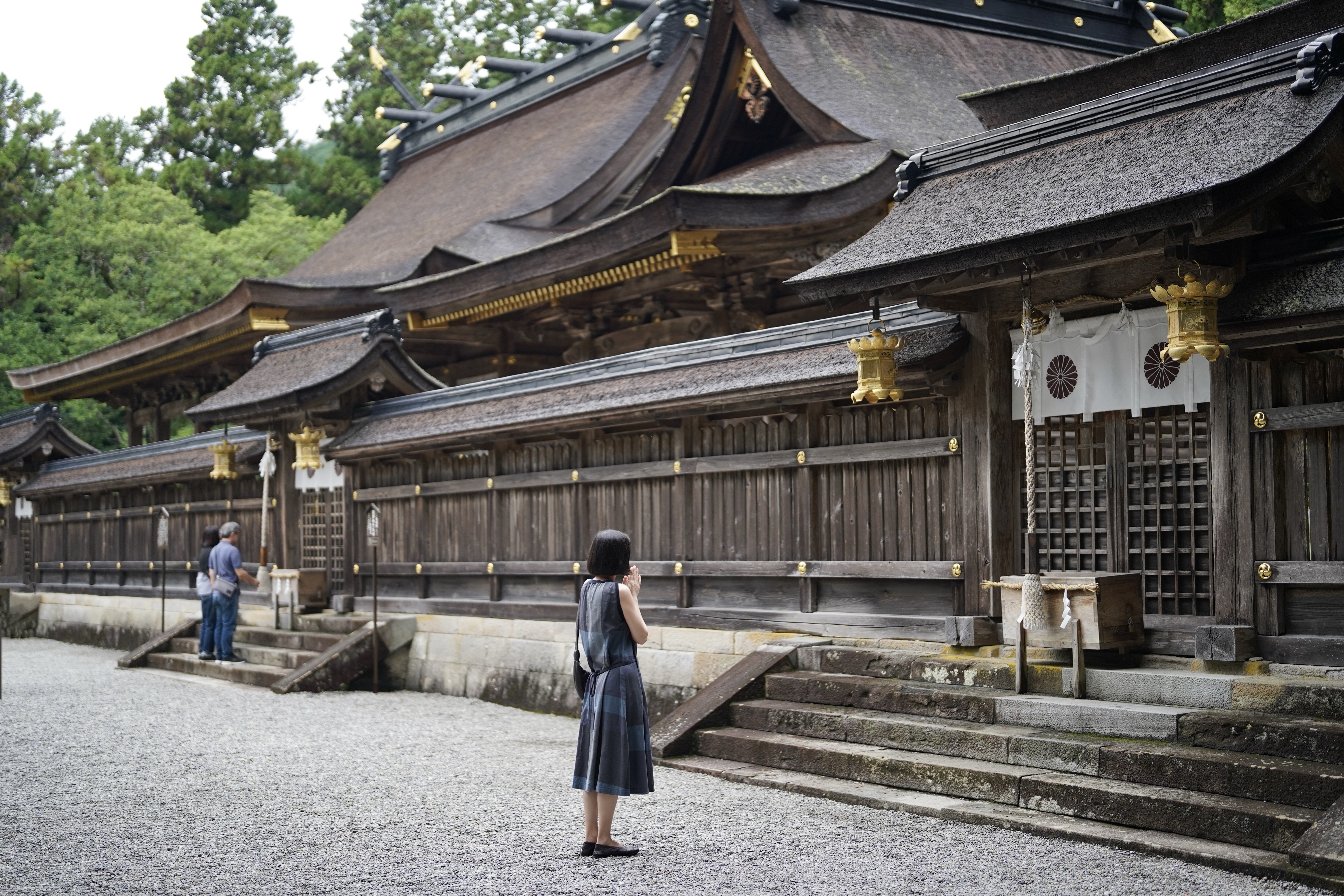 公路与古道时而平行,时而隐秘交错,像不同时空的两条河。河流在熊野本宫大社相汇。一座高大的木鸟居后两列巨杉守望参道,大树下也插着两列白色奉纳旗,墨笔大字“熊野大权现”一路延伸至陡长石阶,神社立于158阶台阶尽头。穿过挂着粗稻草绳结的木门,一排深木色建筑背倚参天古林,如此古朴,又如此恢弘。不施朱漆的木墙木柱仿佛从净土中自然生长出来,柏树皮修葺而成的歇山顶厚重又轻盈,正脊上架着一排金具装饰的黑色圆木(鰹木),山花顶端云纹黑瓦上斜插着两根形如大刀的木条(千木),远看仿佛头戴一顶黑色武士头盔,气宇轩昂。但我很快意识到震撼感不仅来自独特的风格,还源自距离——神社参拜一般只能止步于拜殿前,而这里我们直接站在本殿前,尽管依然殿门紧闭,不见内里真容。四座木殿每座祭祀一位神明,主殿是阿弥陀如来垂迹而来的家津美御子大神,据说大神拔下自己的头发、孕育出纪伊国的茂密山林。神社院内树影郁郁葱葱,而人影疏疏朗朗,但陆陆续续有参拜者走到挂白帘的木门前,向赛钱箱投入硬币,摇动金铃下的垂绳,鞠躬、拍掌、再鞠躬。零钱声、铃铛声、拍掌声、默念的心声,幽微而清晰,构成神社独有的语言词汇,不断回响在寂静山林中。