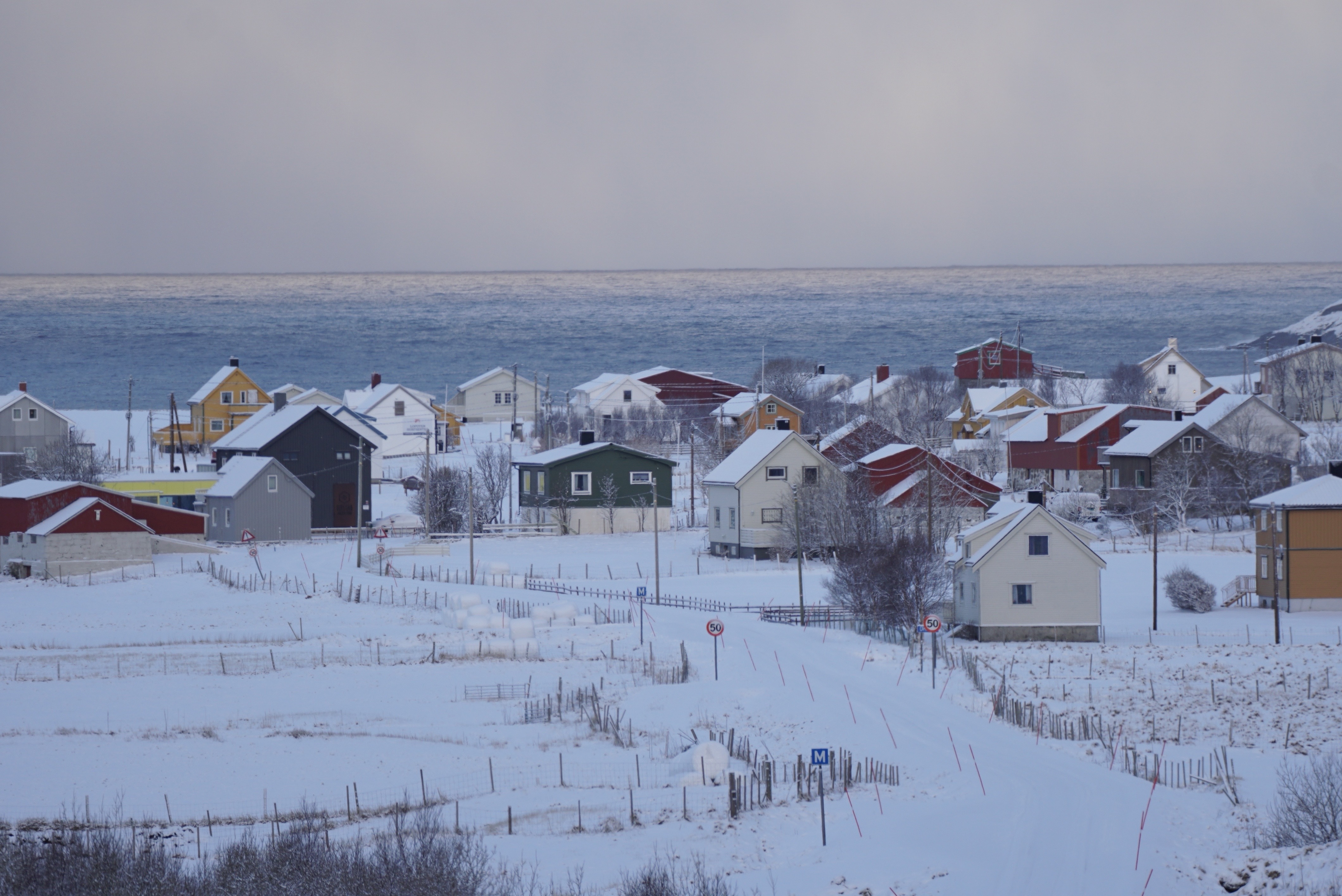 公路尽头是名字最简洁有力的小镇——Å。几座红色木屋落在水边,这是十九至二十世纪中叶繁荣渔业的遗迹。捕鱼是Lofoten群岛的支柱产业,大量鳕鱼经悬挂风干或制成鱼油,出口世界各地。百余年间,每年冬春的渔季,小镇人口会翻好几倍,木栈桥上的各色木屋便是渔民的临时居所。如今鱼厂搬迁,小镇不复喧嚣;过去的厂房成为博物馆,在望向海港的木窗边,陈列干鳕鱼的历史与文化。不远处的开阔海域,莫斯肯大漩涡如被海洋(与古往今来作家)赋予神力的八爪鱼,吸引捕食的鱼类,也困住捕鱼的船只。但这一天神决心对人类慈悲。暴雨逐渐停歇,一道彩虹在小镇路牌后方的山上升起,一只黑白牧羊犬蹦蹦跳跳找人玩耍。赶在三点天光消逝前回旅馆,马路上一只雪白的小小身影嗖地跑过,只有长尾巴尖带一点黑——这是我第一次看到白鼬,也是这天难得的一抹白。谁知第二天我们竟被白色覆盖。