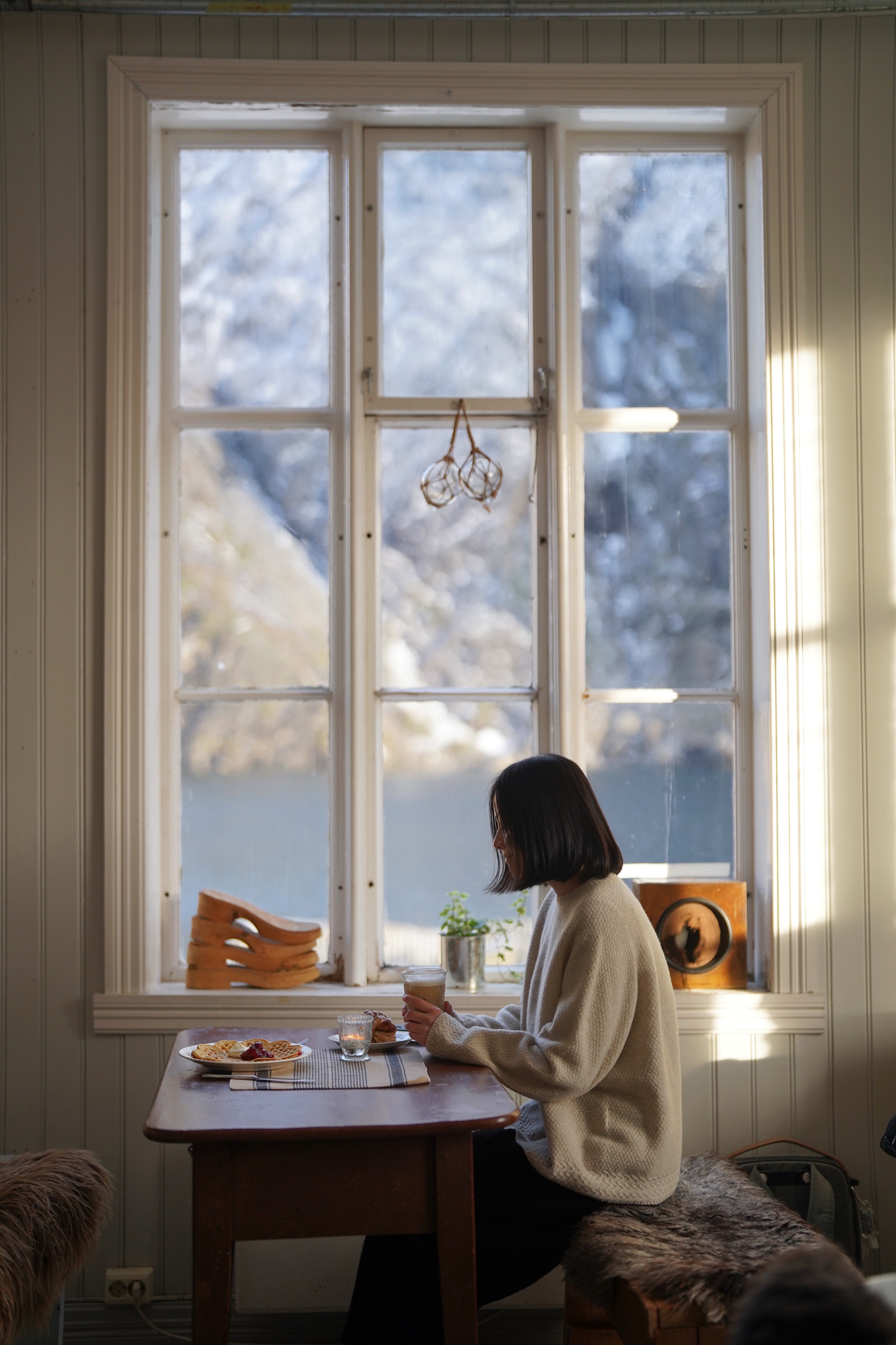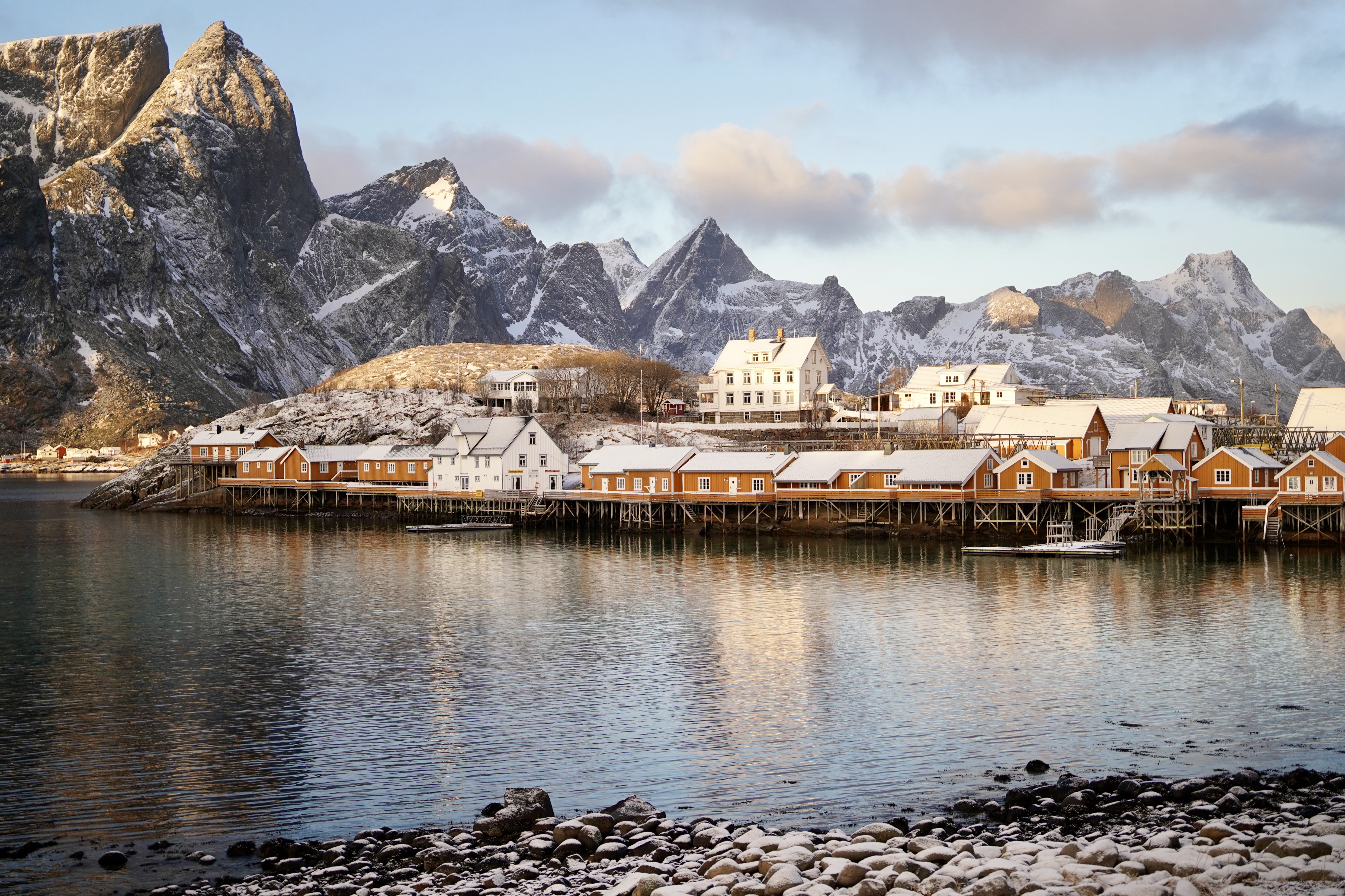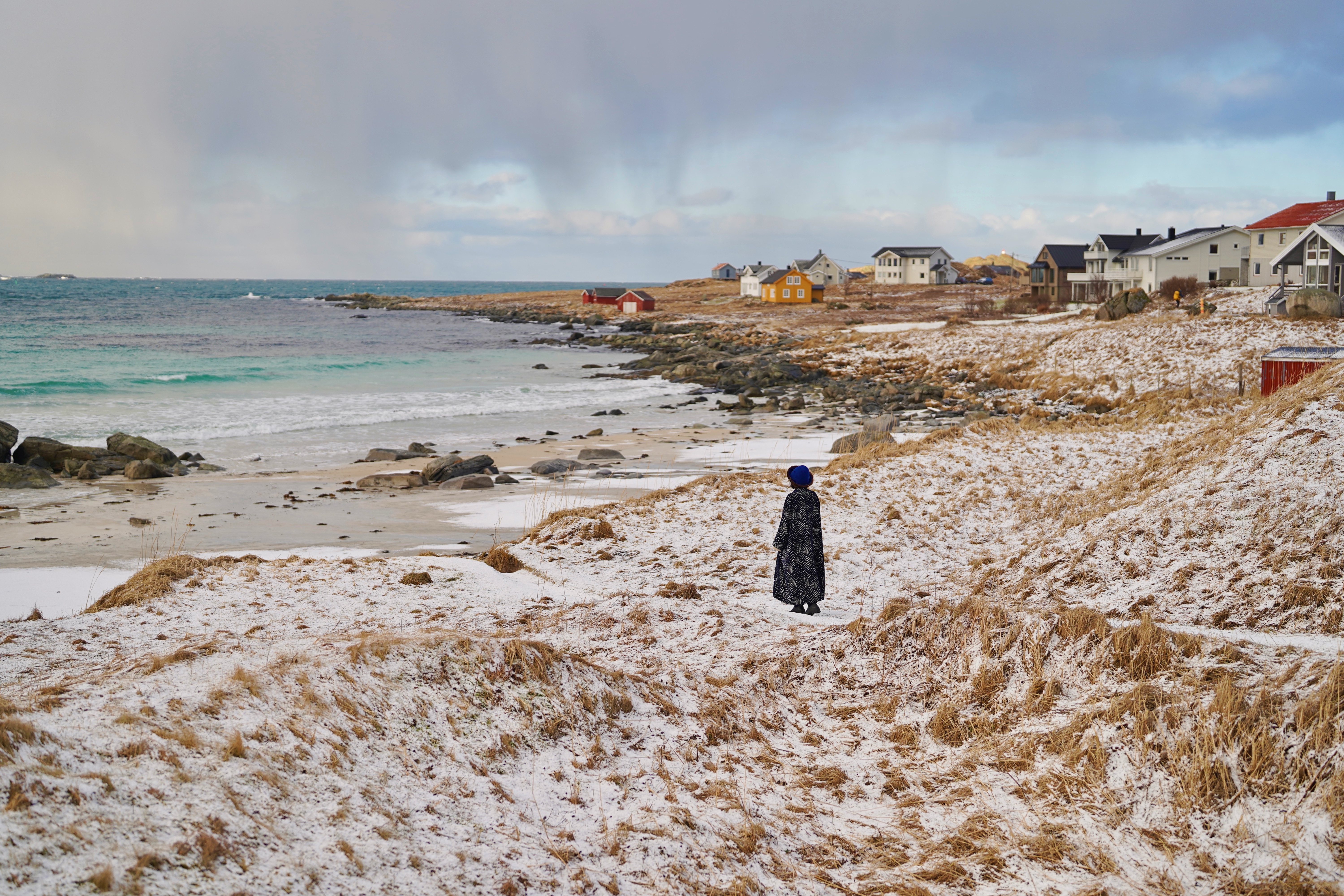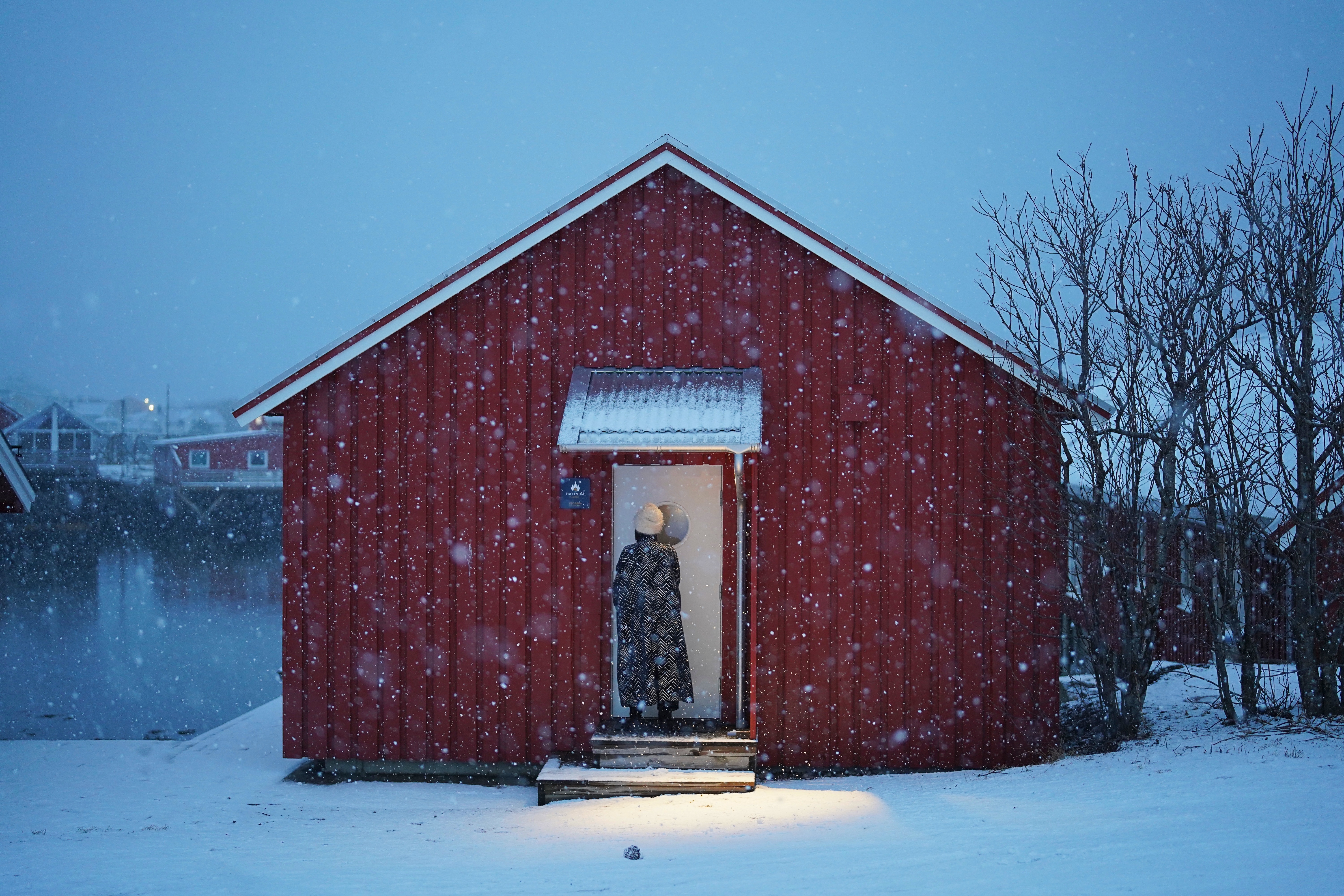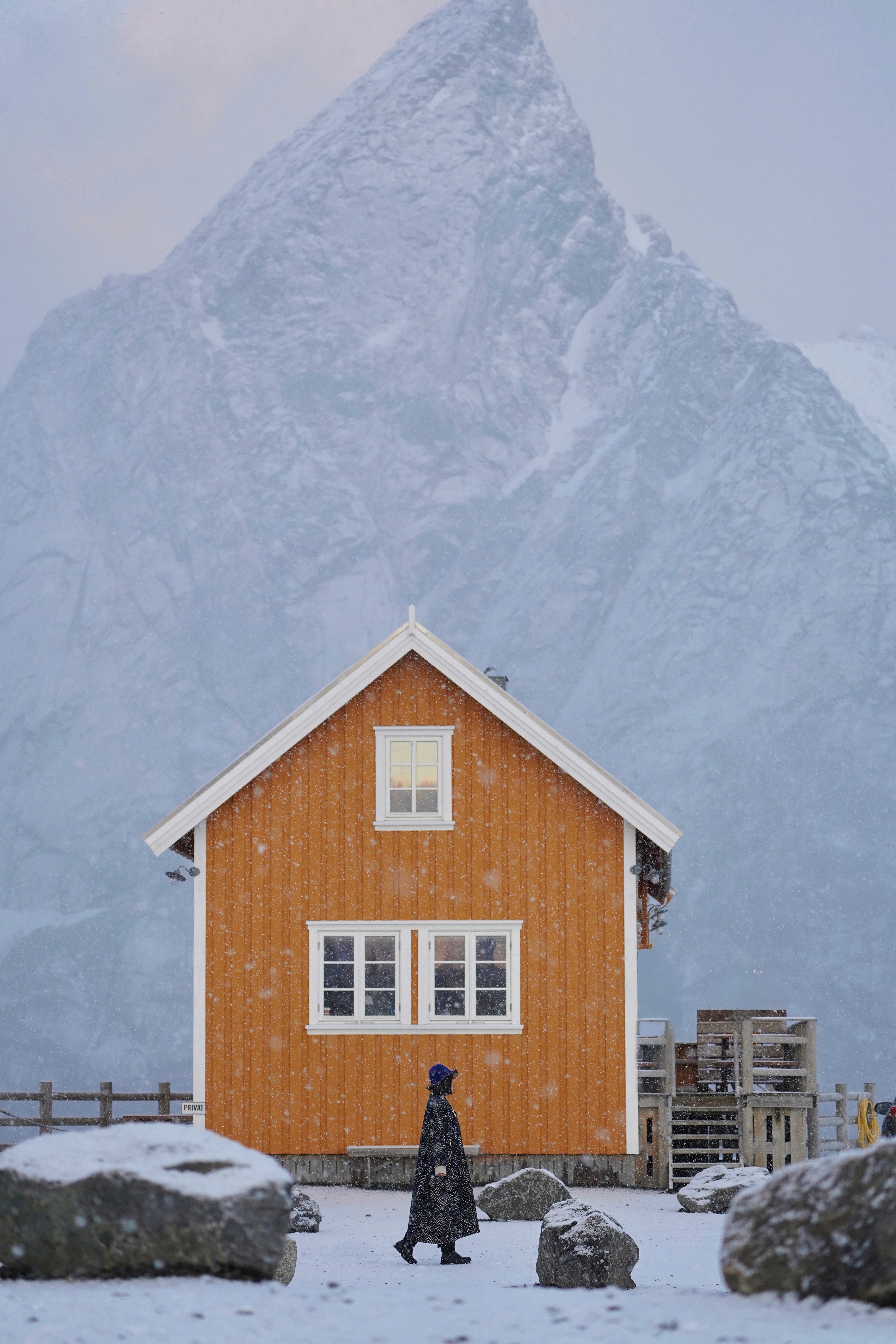 从尚未明亮的早晨开始下的一场雪,很快将房间外的木露台、岩石上的红木屋与海湾对岸的山峰染成洁白。冰冷粗糙的石像变成栩栩如生的石膏像,讲述一出Winter’s Tale——天气如命运反复无常,但若抱有信念,雕像便能复活。纷纷雪点间山海都褪去颜色,只有红房子小镇落在白色天地间,如结满红果的冬青盖雪;这里一丛,那儿一株。我的蓝色大衣也落满了雪,张开双臂会生出白色羽翼,我变成冬天的鸟,飞来飞去寻找雪野间的色彩。不一会天空复晴,恰遇日出时分,峡湾沿岸群峰被染成瑰丽的粉色。初生的光落在水边几座黄色木屋上,将它们裹在一颗蜜糖色露珠里,玲珑剔透、闪闪发亮。