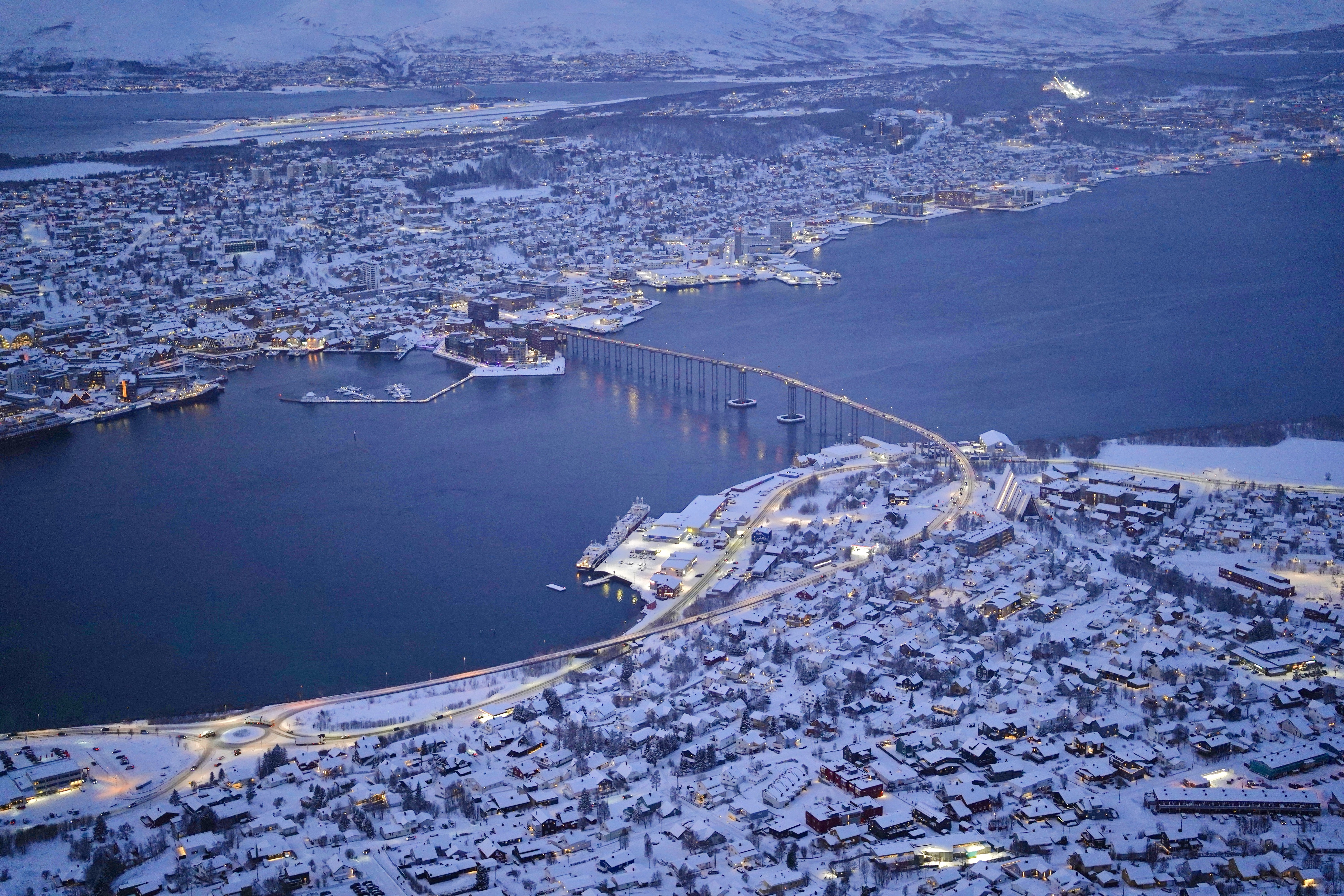 第二天清晨醒来,太阳尚未升起——北纬69度的二月,太阳要睡到九点。当地居民早已掌握不看天光的时钟,窗外海港畔一人一狗在灰蒙蒙的画面中深一脚浅一爪地移动;待天色亮起,灰蒙蒙变成白茫茫,才看清地上空中都是雪,他们留下的足迹早已被新雪覆盖。一艘足有两三层楼高的深海货轮停泊在岸,峡湾被城市切割而成的狭长河流——后来才知道其实是城市被峡湾切割——是天然的海上航路。船员拿着扫帚清理积雪的甲板,像摩西在海中分出一条路,同时在船的边缘制造一场微型雪崩。一道长长的弧形公路桥通往海湾对岸,雪雾笼罩之境。