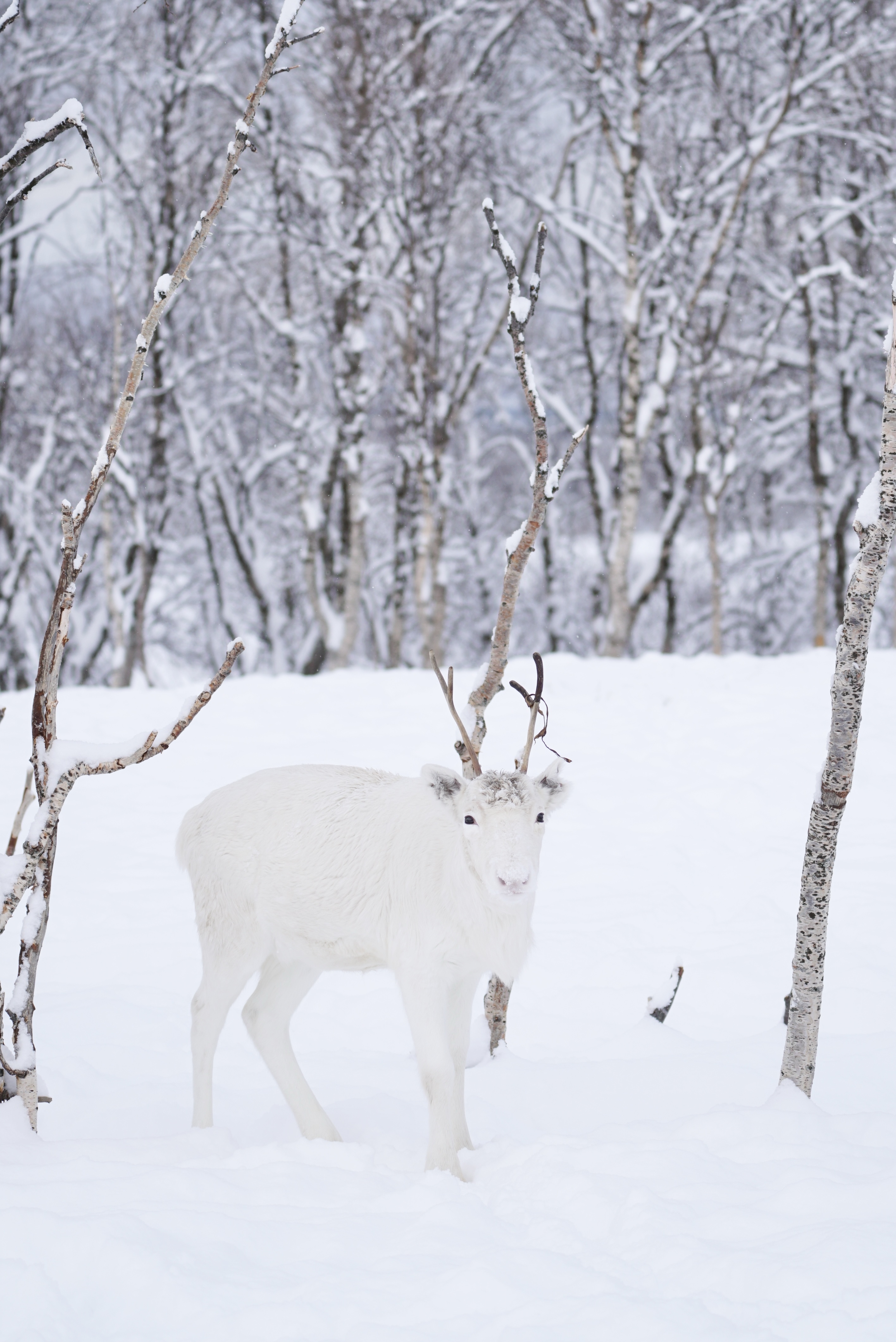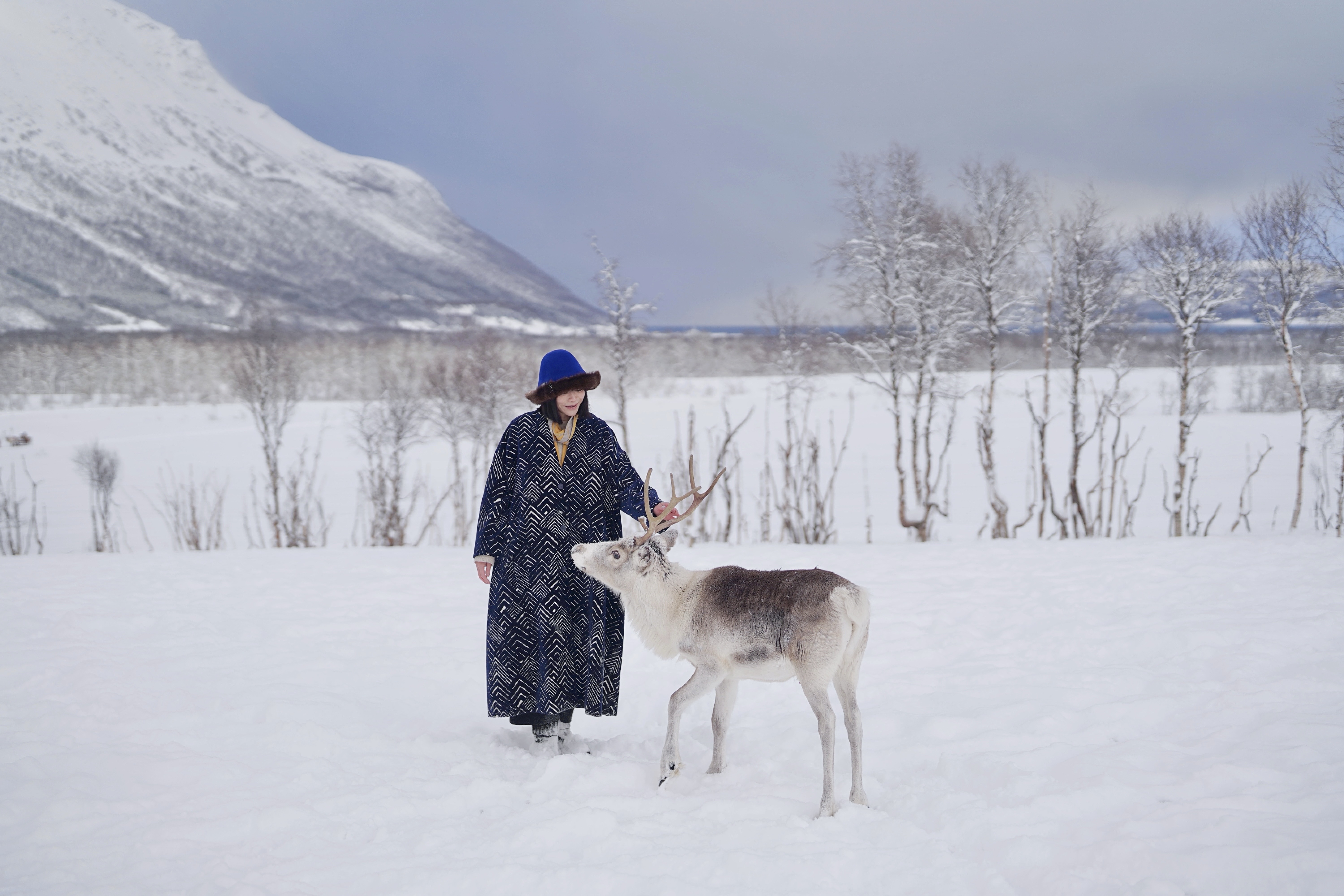 早晨开启另一封老式圣诞贺卡——沿峡湾而行,驶过长而蜿蜒的雪道,访问山谷里萨米人的驯鹿农场。 萨米人是北极圈的原住民,两三千年来与雪原冰海共生,捕鱼、狩猎、采集植物与贝类、放牧羊群与驯鹿。我们探访的农场在一片开阔雪谷之上,四周巍峨雪峰萦绕,偶尔从云中探出山尖。几座马戏团帐篷型尖顶圆木屋落在厚雪之上,后方一片小树林旁,长长的木栅栏为几十只驯鹿划出地界。这些北方精灵身型似长毛小牛,毛色或灰或白,像朵朵白云与乌云在雪上滚动;头顶高高的、优美的鹿角也有深浅不同的配色。一只个头偏小、浑身洁白的母鹿站在一排银色的树间,像一朵雪花刚从树梢落下,头顶新生的金色枝桠,适合悬挂星星、停泊小鸟。但它们竟属于人间。我们步入围栏,手抓起一把饲料,很快便有驯鹿凑到跟前来,温热的舌头将食粮一颗颗卷走,吃完也不纠缠,安静转身离开,像只习惯很好的小狗。身着传统服饰Gakti——天蓝底红绣边袍子——的萨米人向我们介绍每只驯鹿的名字与性格,有只特别亲昵地把头在他的毛皮靴子上蹭来蹭去;他笑着说它最亲人,我特别喜欢它。可未来有一天,它或许会出现在他的餐桌上。驯鹿是萨米人的伙伴,是他们的身份象征(Tromso城徽就是一只驯鹿),也是他们的主要食物,这种复杂的关系我无法评判;我难以想象去吃任何一只被赋予名字的动物,但城市法则大概不适用于这里。至少在客人的餐桌上,他们提供了传统驯鹿肉料理之外的选项。我喝着热乎乎的蔬菜汤,心中第一万次默默地对自然道谢,对动物抱歉;我们驯养了你们,而你们赠予我们生命。