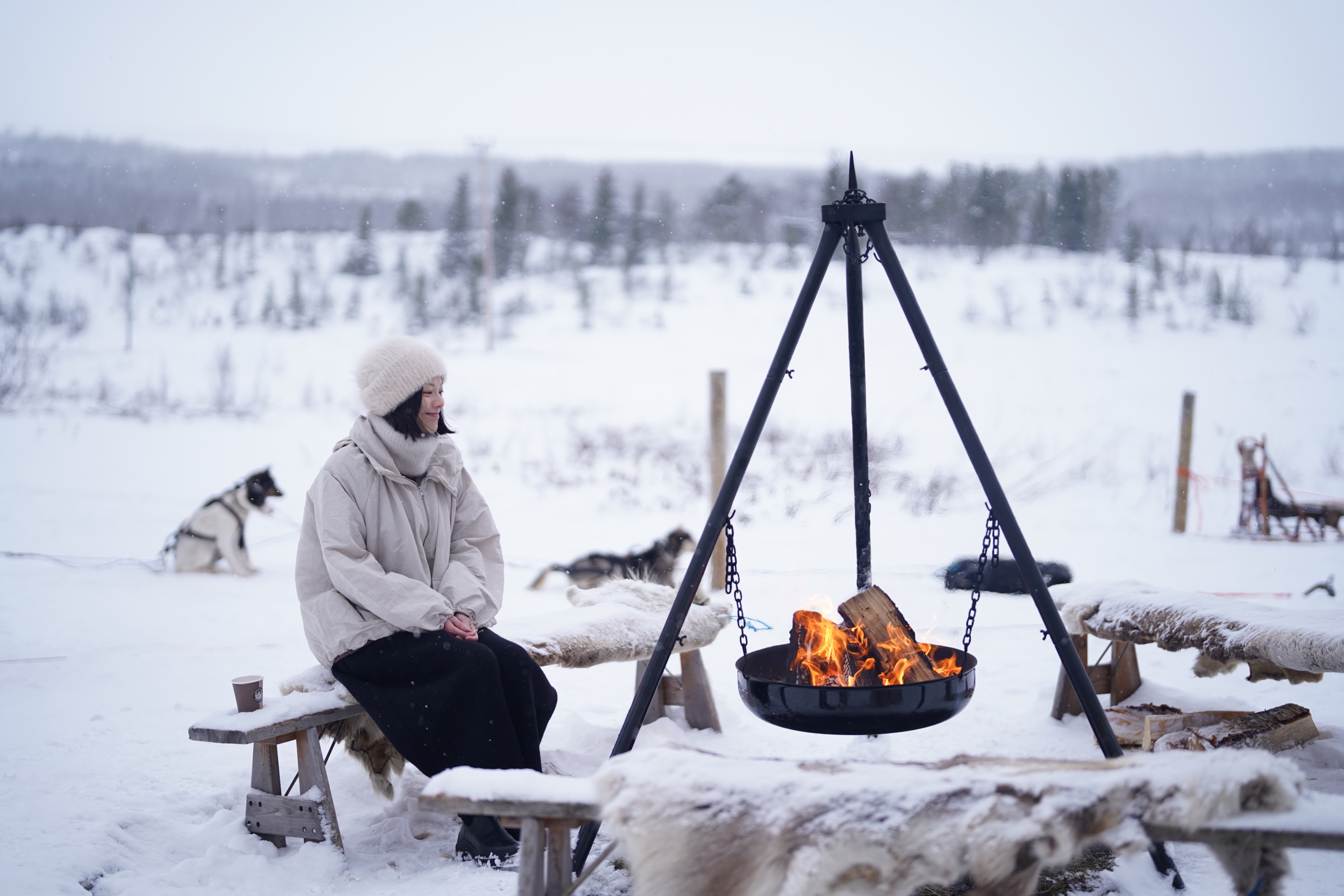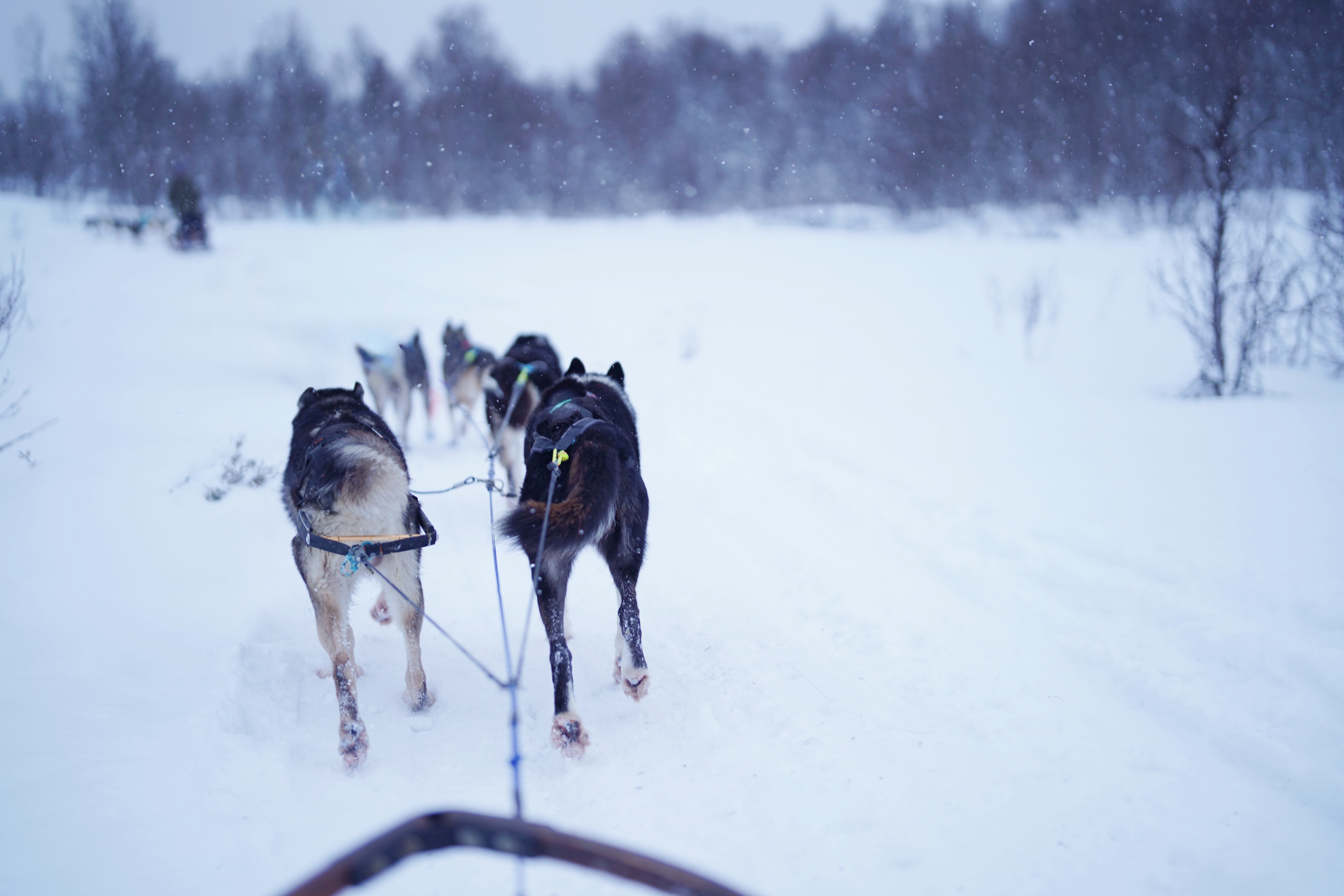 翌日在另一片雪原邂逅另一群雪上生灵——Alaskan Huskies。它们是西伯利亚哈士奇和阿拉斯加雪橇犬的后代,为在雪上奔跑而生。一座座红砖小屋立在山间大片雪野上,我们刚下车便看到毛茸茸的小脑袋探出来,很快毛乎乎的尾巴欢快地摇起来。随向导走向雪橇,已就位的小狗纷纷探头嚎叫,迫不及待要出发。我坐上木制雪橇,家属站在身后驾驶,五匹小狗只待一声令下,一头扎入迷蒙的雪雾,奔向前方朦胧、无际的白色。奔过开阔的雪原,奔过盖雪的树林,奔向山坡又下坡,空中飘落的雪花与狗爪刨起的雪渣不断扑到脸上,冰凉、扎人、甚至带着轻微的疼感,我却希望一直这样跑下去。前方的小狗们是不是此刻也这么想?两只领头的棕色与黑色小狗专注严肃,中间穿粉靴子的黑白小狗文静乖巧,后面两只最为活泼:一只有着典型哈士奇蓝眼睛,边跑边不时回头看我,像每一只玩耍时与人类分享开心的小狗;另一只长得像德牧,一有机会便从地上咬雪吃,休息时一头扎进雪堆里。而我把眼睛扎进雪中景致里,左侧山坡上两只身型硕大的麋鹿藏在稀疏的林间,右侧峡谷里一座蓝色湖泊在雪雾后若隐若现。谢谢小狗们,带我来到这里。回到营地后摸摸每只小狗,有的把脸凑上来要舔舔,有的翻过肚皮打起滚。女主人说它们从小接受社会化训练,大约一岁半开始拉雪橇,冬天上班(每天一到两小时),夏天休假,跑到不想跑了便退休;它们生性爱跑,最大挑战是让它们保持新鲜感,因此会不断开辟新的路径。这样想它们未必不比我们自由、自在,永远不必离开自己的家园,永远做最热爱的事,永远拥有下一个目标。